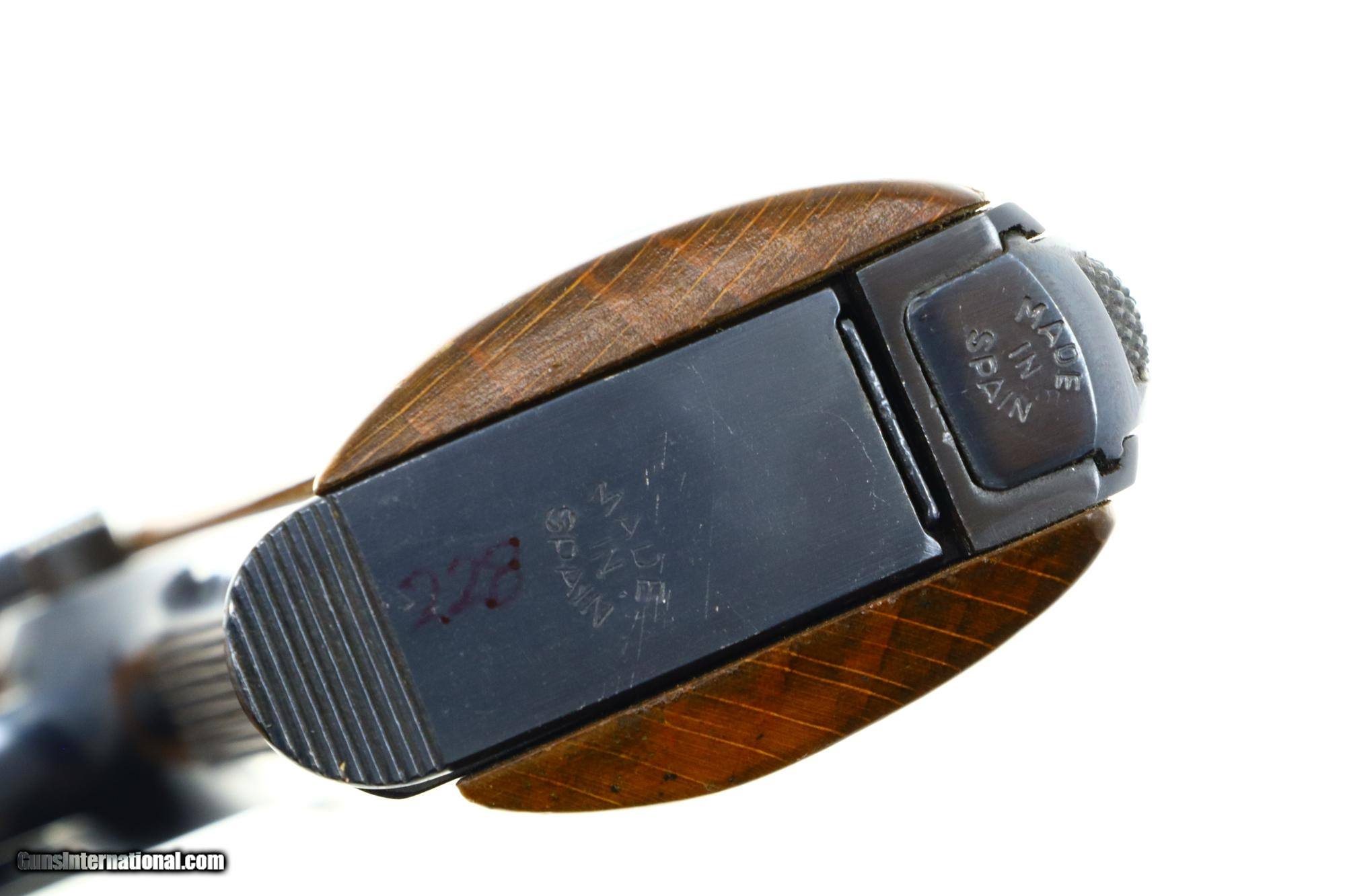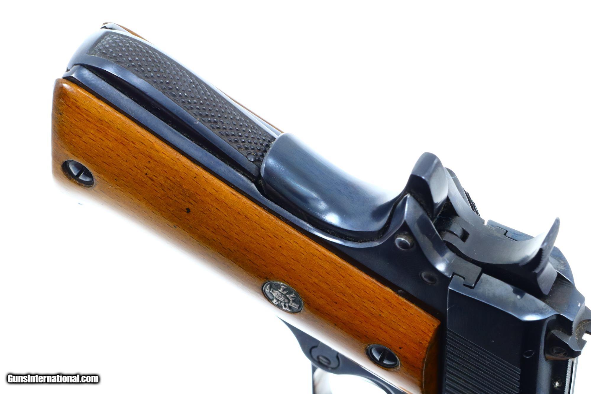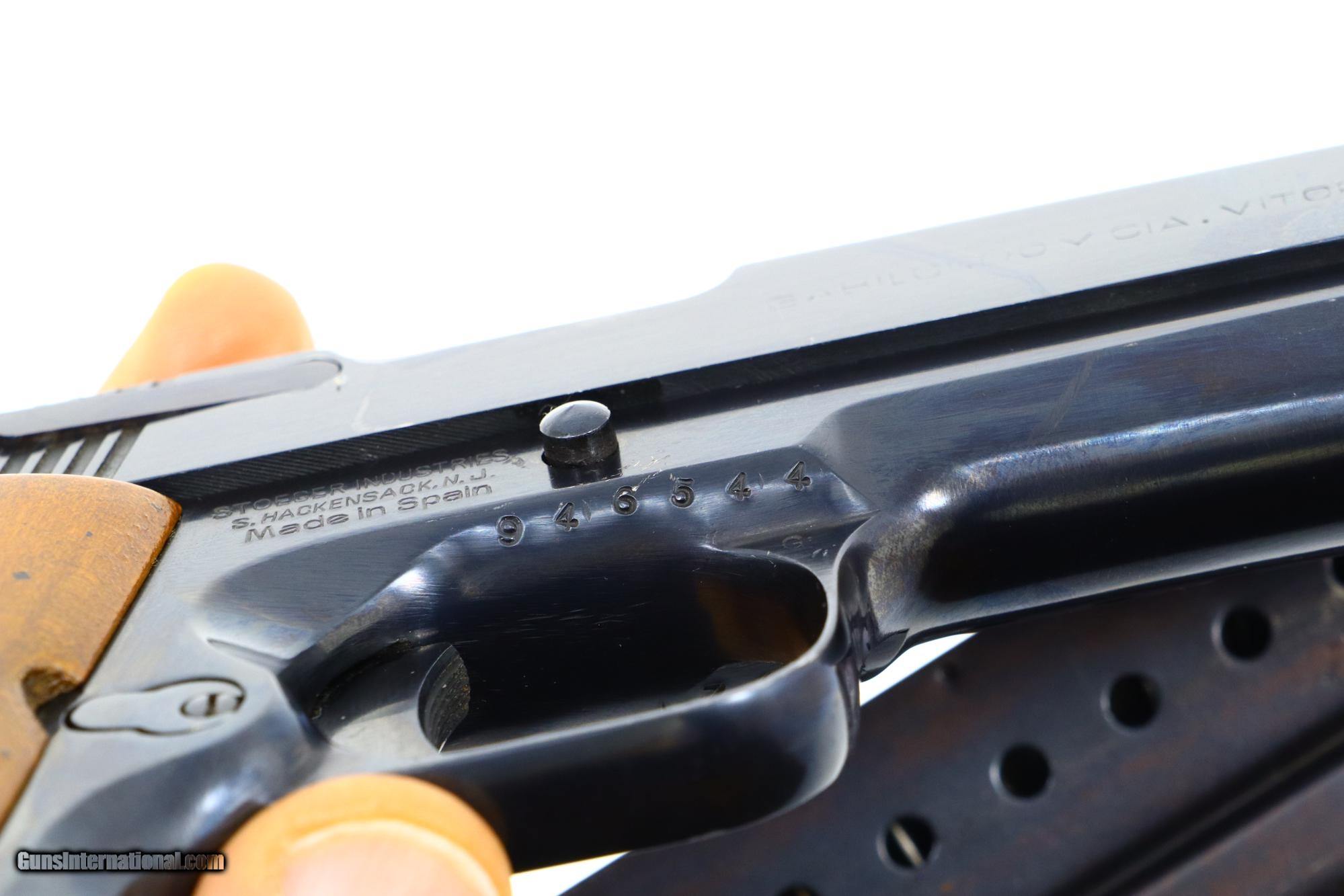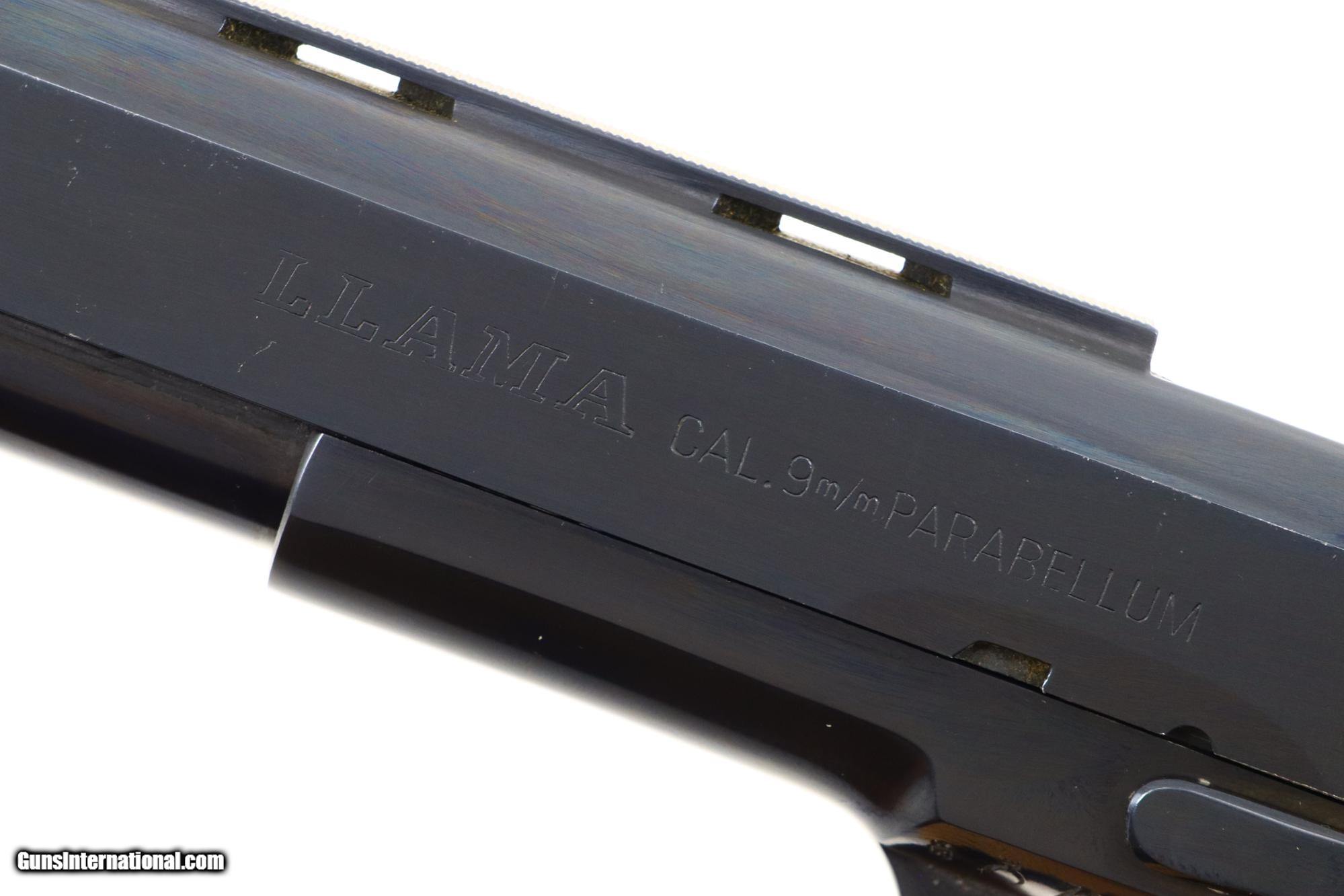 Description: Near new Llama made by Gabilondo y Cia in Vitoria based on the full sized Colt Government Model modified to have a ventilated rib, top mounted loaded indicator, and a horizontally adjustable rear sight. The left side of the slide is marked "LLAMA" along with the caliber. The right side of the slide is marked with the manufacturer's name and location in Spain. Imported by Stoeger Industries, then in New Jersey. A highly polished blued gun, fitted with smooth wood grips, each panel inletted with a "LLAMA" logoed escutcheon. Serrated front strap. Correct magazine with 8 indicator holes on the right side and a detachable floorplate with a serrated toe. Synopsis: Gorgeous, full sized, heavy duty Llama Gabilondo y Cia pistol with ventilated rib and smooth grips. Condition: 99++% of its original blue, the right side of the slide having a scratch extending down from the ejection port as pictured. Gripstraps and grips in the same condition. Magazine with insertional wear. A big, full sized Llama, occasionally referenced as the IX-A, immaculately polished, from 1980, just begging to be taken to the range! ~~Insured shipping fee of $45; most packages shipped using FedEx 2nd Day.~~ SOLD Manufacturer: Llama Serial Number: 946544 Caliber Info: 9mmP |