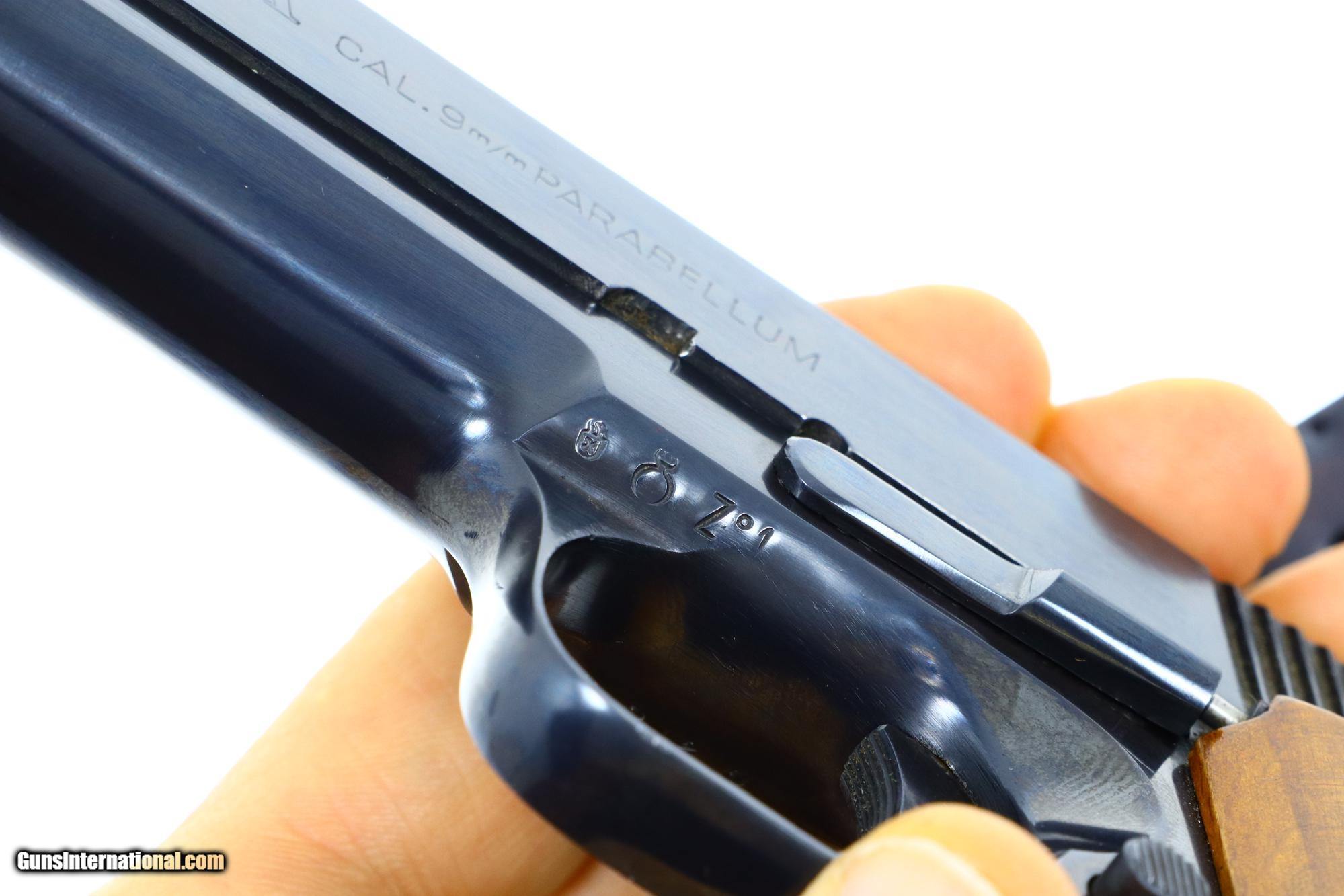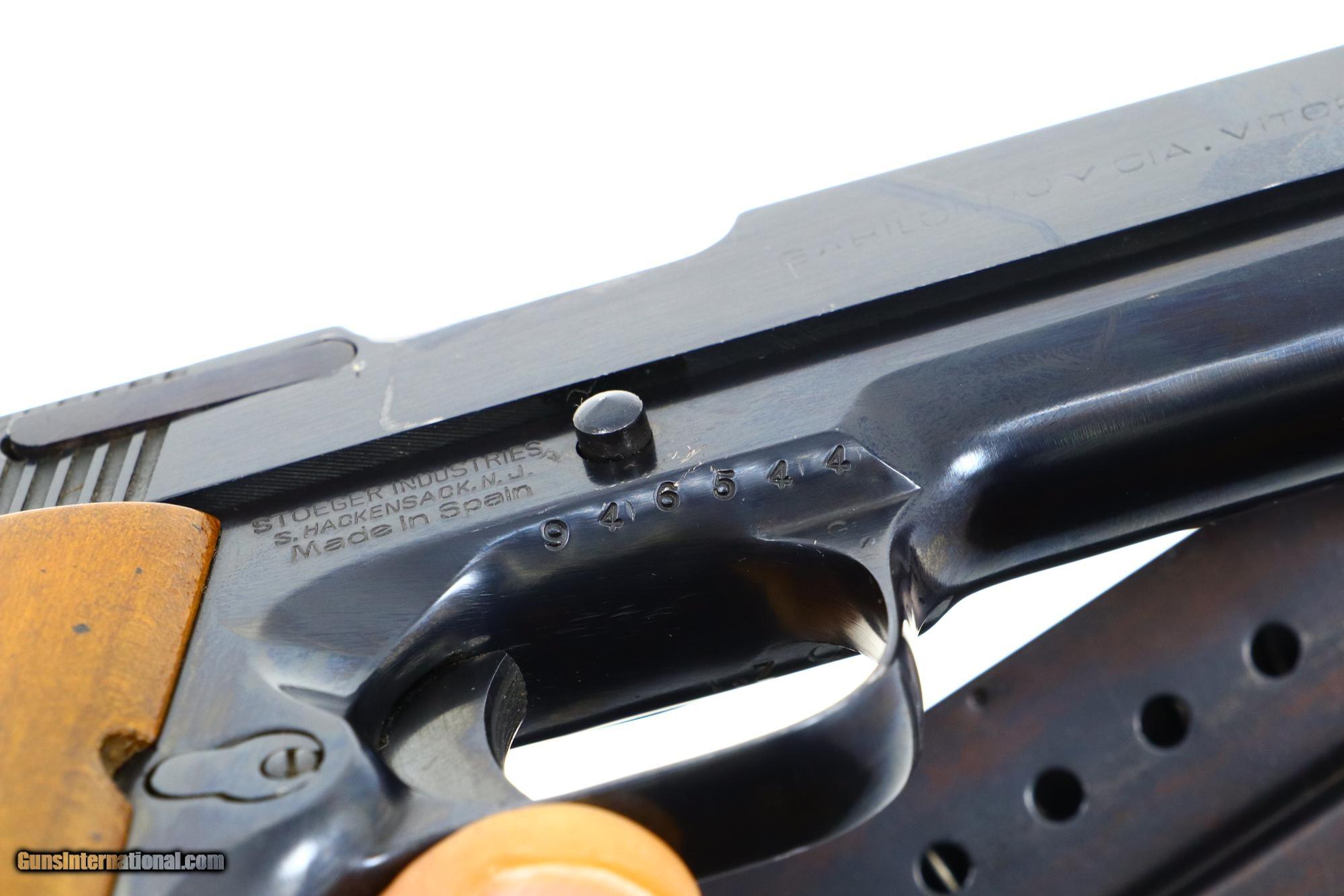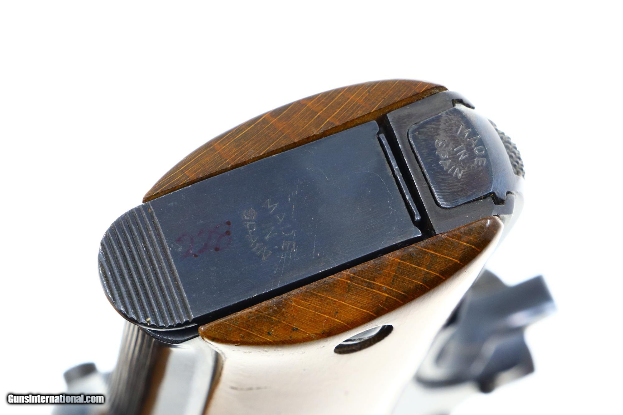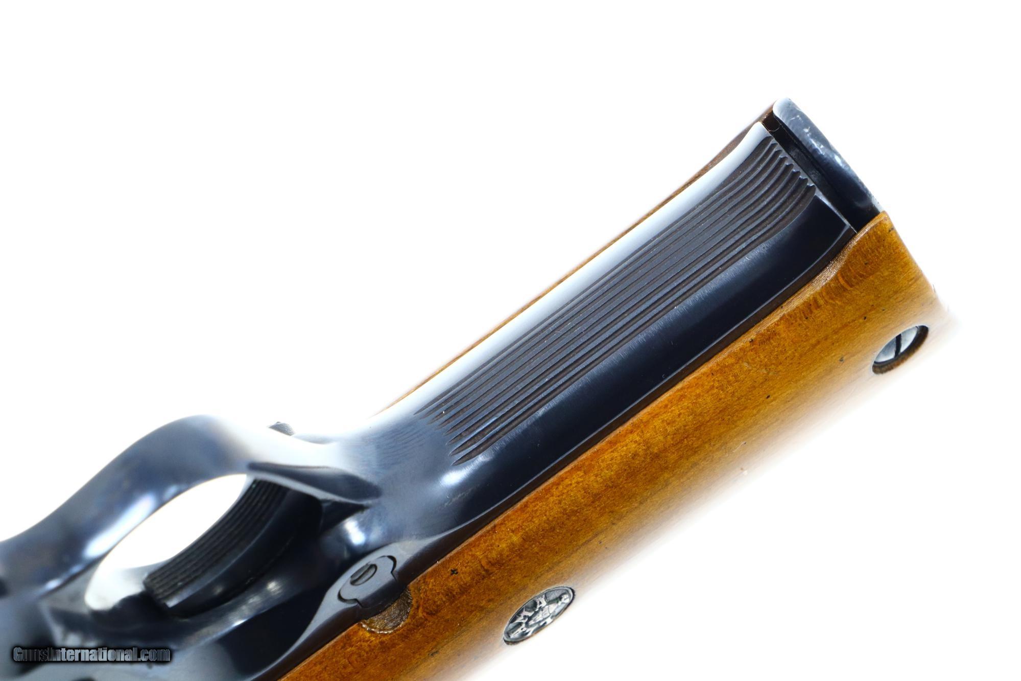 Description: Near new Llama made by Gabilondo y Cia in Vitoria based on the full sized Colt Government Model modified to have a ventilated rib, top mounted loaded indicator, and a horizontally adjustable rear sight. The left side of the slide is marked "LLAMA" along with the caliber. The right side of the slide is marked with the manufacturer's name and location in Spain. Imported by Stoeger Industries, then in New Jersey. A highly polished blued gun, fitted with smooth wood grips, each panel inletted with a "LLAMA" logoed escutcheon. Serrated front strap. Correct magazine with 8 indicator holes on the right side and a detachable floorplate with a serrated toe. Synopsis: Gorgeous, full sized, heavy duty Llama Gabilondo y Cia pistol with ventilated rib and smooth grips. Condition: 99++% of its original blue, the right side of the slide having a scratch extending down from the ejection port as pictured. Gripstraps and grips in the same condition. Magazine with insertional wear. A big, full sized Llama, occasionally referenced as the IX-A, immaculately polished, from 1980, just begging to be taken to the range! ~~Insured shipping fee of $45; most packages shipped using FedEx 2nd Day.~~ SOLD Manufacturer: Llama Serial Number: 946544 Caliber Info: 9mmP |