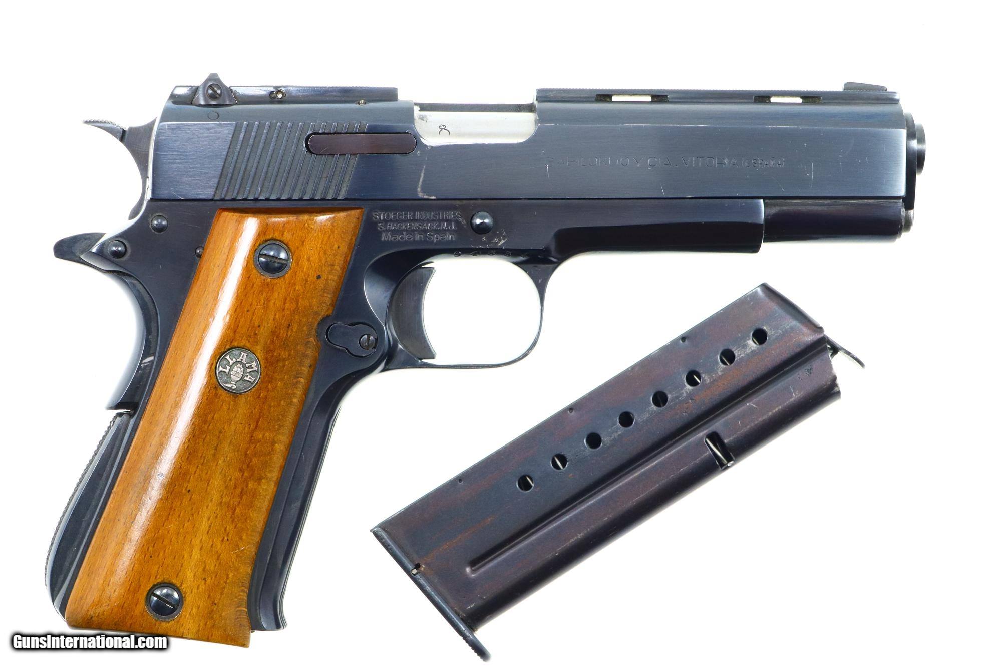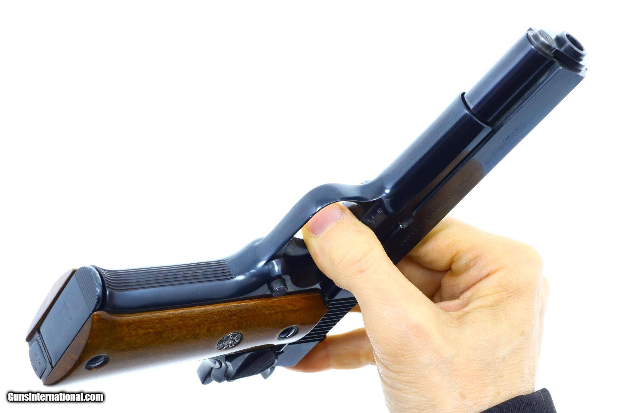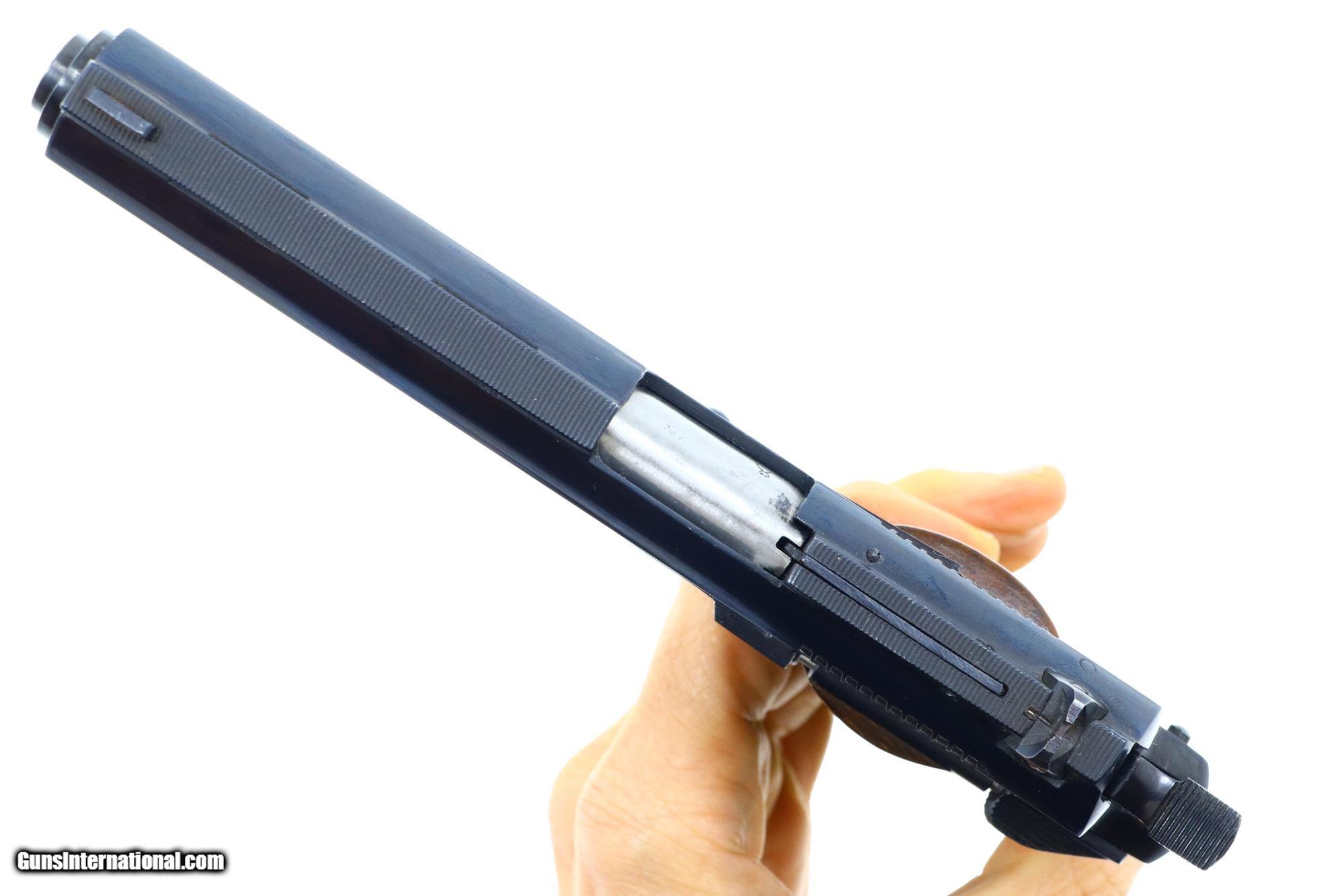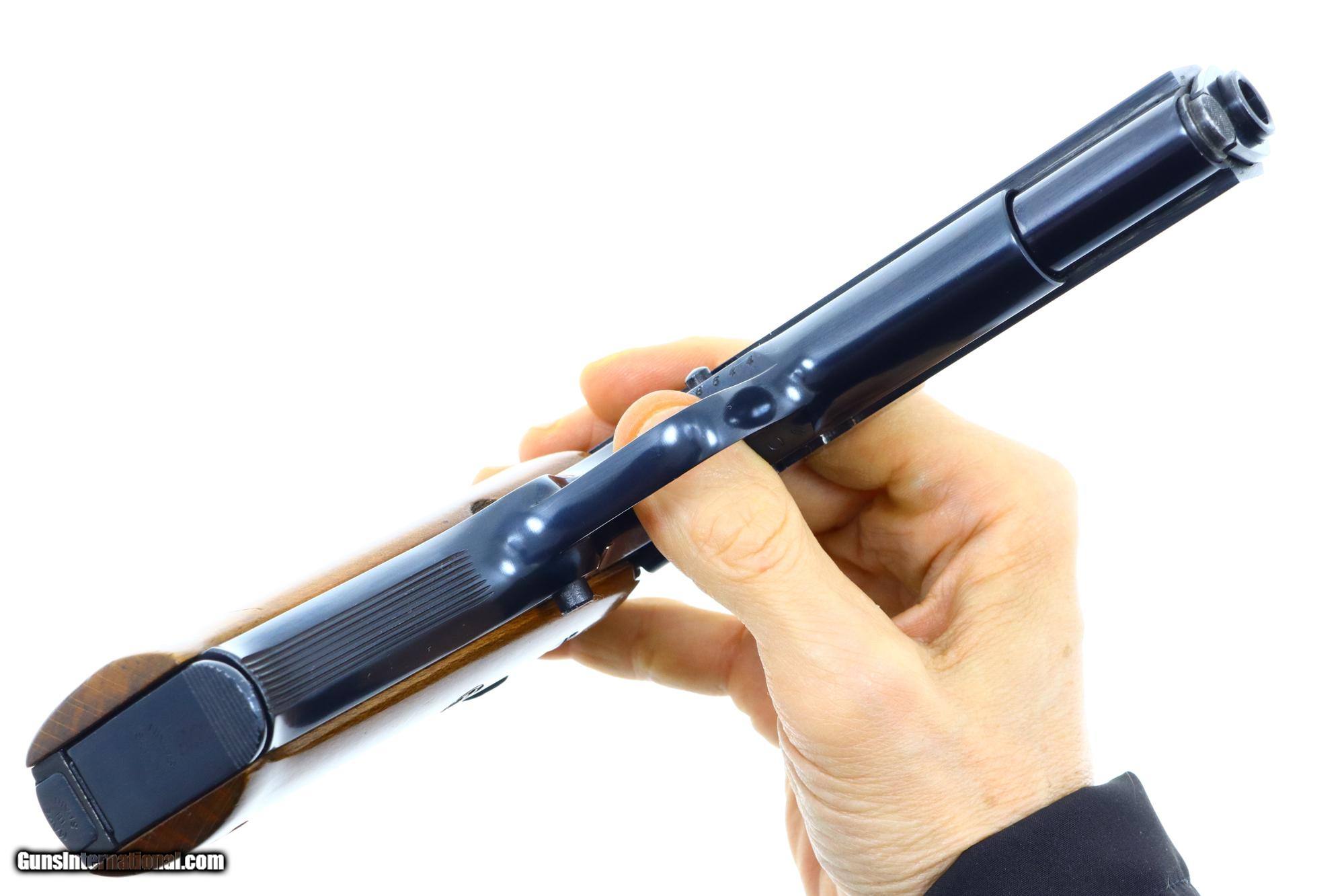 Description: Near new Llama made by Gabilondo y Cia in Vitoria based on the full sized Colt Government Model modified to have a ventilated rib, top mounted loaded indicator, and a horizontally adjustable rear sight. The left side of the slide is marked "LLAMA" along with the caliber. The right side of the slide is marked with the manufacturer's name and location in Spain. Imported by Stoeger Industries, then in New Jersey. A highly polished blued gun, fitted with smooth wood grips, each panel inletted with a "LLAMA" logoed escutcheon. Serrated front strap. Correct magazine with 8 indicator holes on the right side and a detachable floorplate with a serrated toe. Synopsis: Gorgeous, full sized, heavy duty Llama Gabilondo y Cia pistol with ventilated rib and smooth grips. Condition: 99++% of its original blue, the right side of the slide having a scratch extending down from the ejection port as pictured. Gripstraps and grips in the same condition. Magazine with insertional wear. A big, full sized Llama, occasionally referenced as the IX-A, immaculately polished, from 1980, just begging to be taken to the range! ~~Insured shipping fee of $45; most packages shipped using FedEx 2nd Day.~~ SOLD Manufacturer: Llama Serial Number: 946544 Caliber Info: 9mmP |