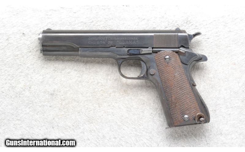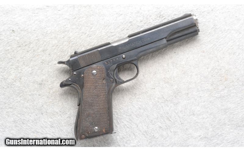 Description: This Llama Model Llama Extra is a right hand semi-auto pistol in .38 Super Cal. It has a 5.25 inch barrel with a rear serrated slide. A blade front sight and notch rear sight. The grip panels are a checkered hardwood. The back strap is grooved. Serial Number 51960. .38 Super SOLD Chambers: 8 round magazine. Metal Condition: "Fair. Has light wear, minor freckling spots and minor use marks. Wood Condition: Fair. Has some wear and handling marks. Bore Condition: Excellent. Barrels: 5.25 inch barrel. Weight: 40 Oz. Sights: Blade front. Notch rear. Item Location: Richfield, WI |
