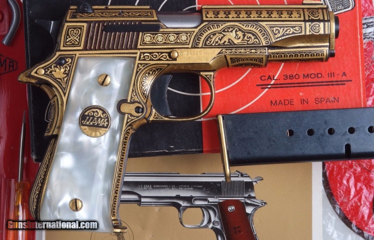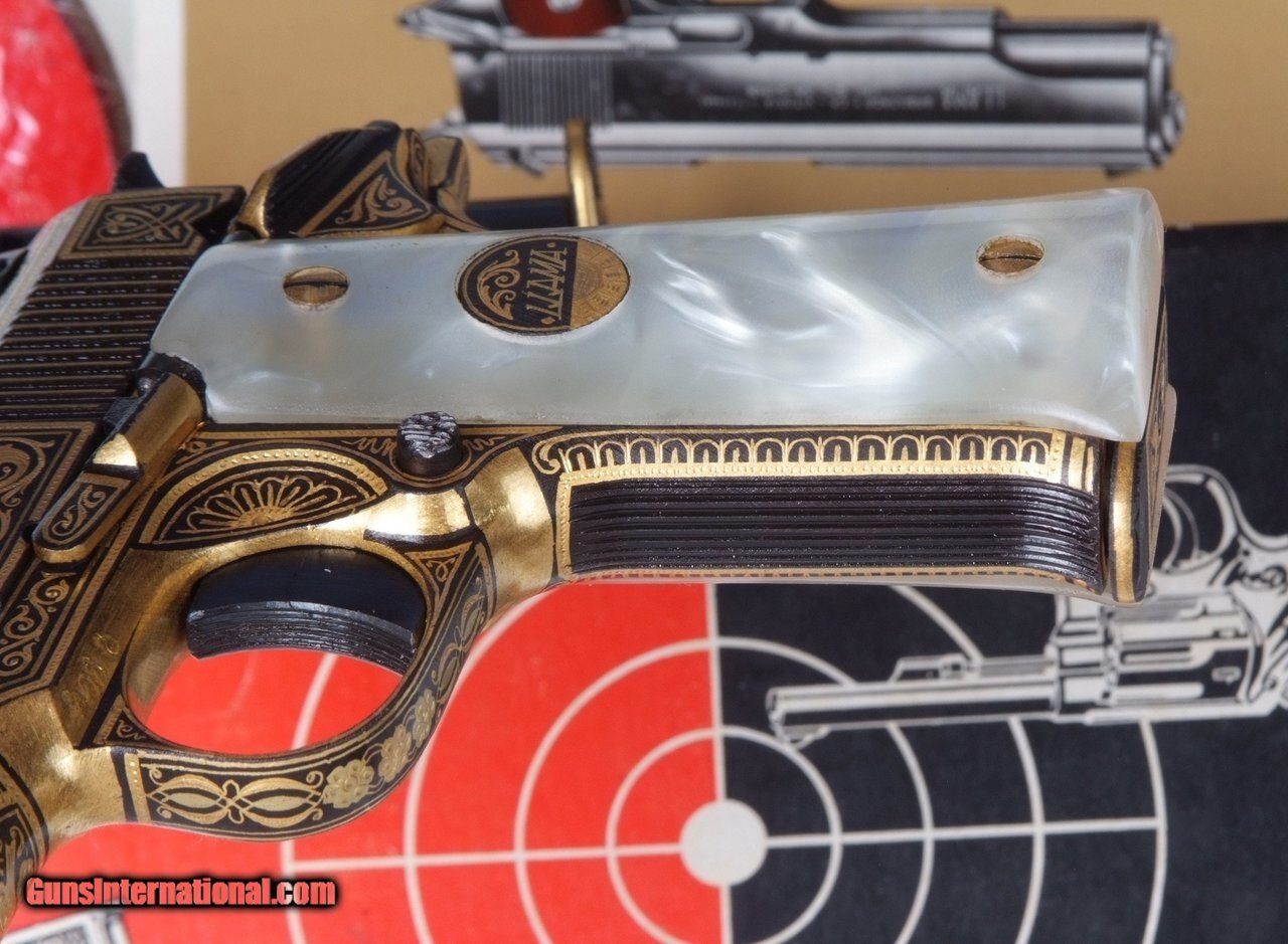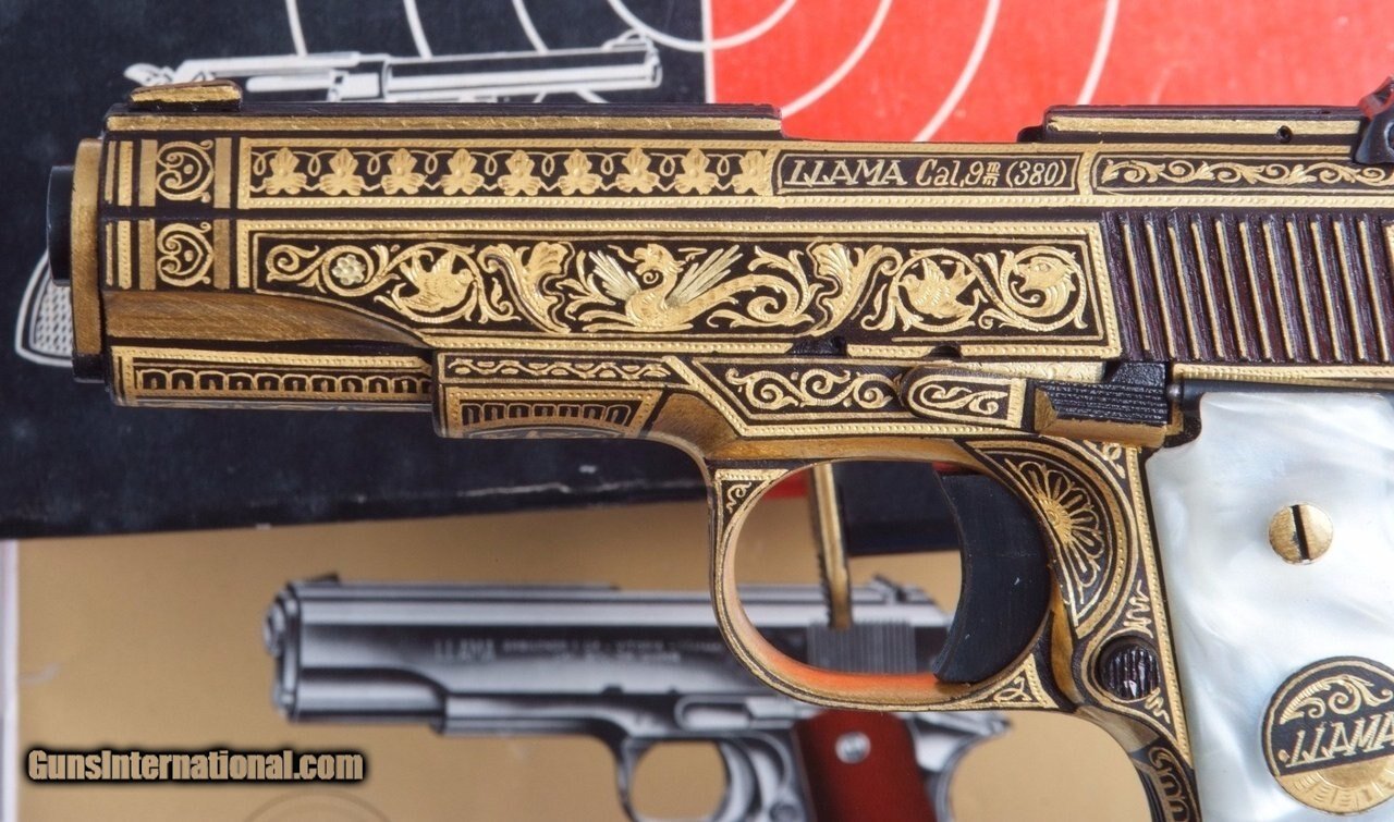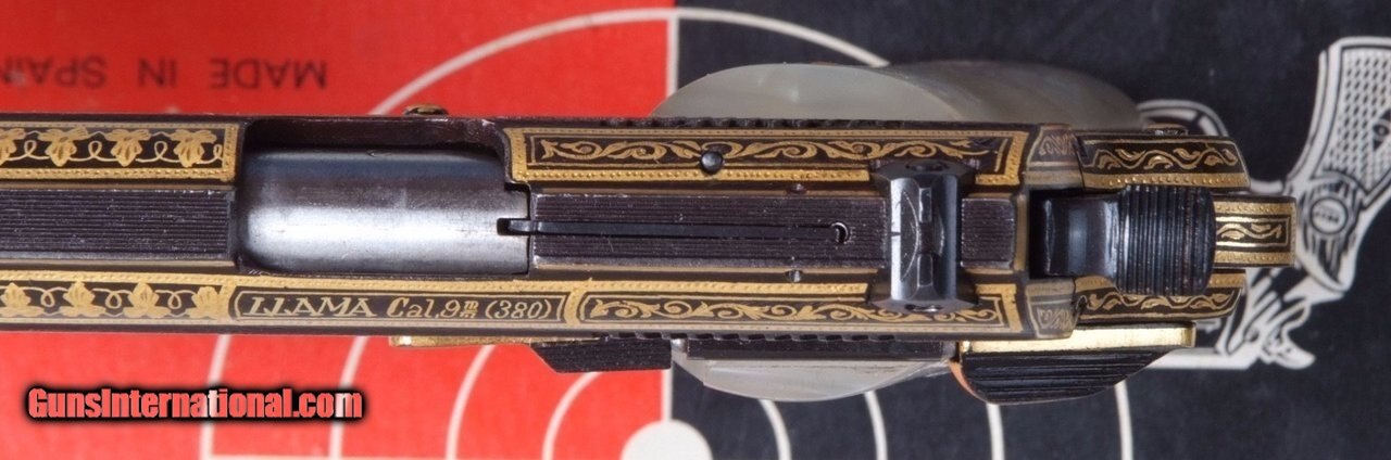 Description: Standard configuration Llama, Mod III-A, in style of Colt M1911A1, with fixed front sight, windage adjustable rear sight and top mounted loaded indicator. Virtually the entire gun, except for some of the small parts and portions of the front and back strap, covered with elaborate and nicely detailed gold damascening. Manufacturer and caliber highlighted in gold on top left of slide. Single panel damascened layouts on each side of slide with dragon, songbird and intertwined floral motif. Right side of frame marked by Stoeger. Songbird representations under forward frame and in a matched pattern on each of the detachable magazine and floorplates. Rearing dragon on grip safety. Swirling pearlite grips with each panel having a gold damascened Llama-marked inserted medallion. Still in original multicolored Llama plastic wrap, spare magazine in original wax paper wrap, complete with laminated instruction booklet and red plastic implement holder for cleaning brush and screw driver. Crisp original multicolored shipping box with caliber and damascened finish marked on right side of box. Synopsis: Fantastic, as NIB Llama Mod III-A, gold damascene with spare magazine, instruction booklet, and original cleaning tools. Condition: Ensemble is virtually new with only the most minute wear from having been unpacked and inspected, the left grip having a few microscopic scuffs over the inserted medallion. Virtually impossible to upgrade! ~~Insured shipping fee of $155; most packages shipped using FedEx 2nd Day.~~ SOLD Manufacturer: Gabilondo y Cia Serial Number: 569224 Caliber Info: .380 ACP |