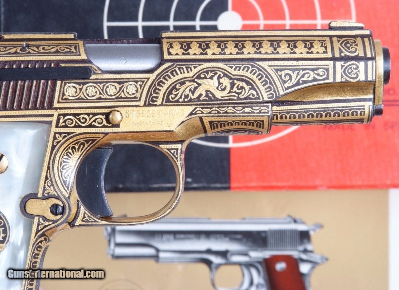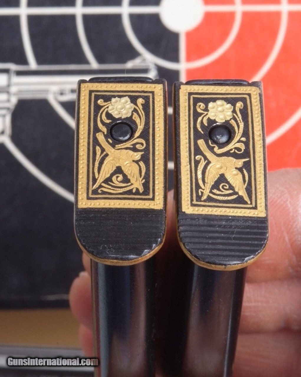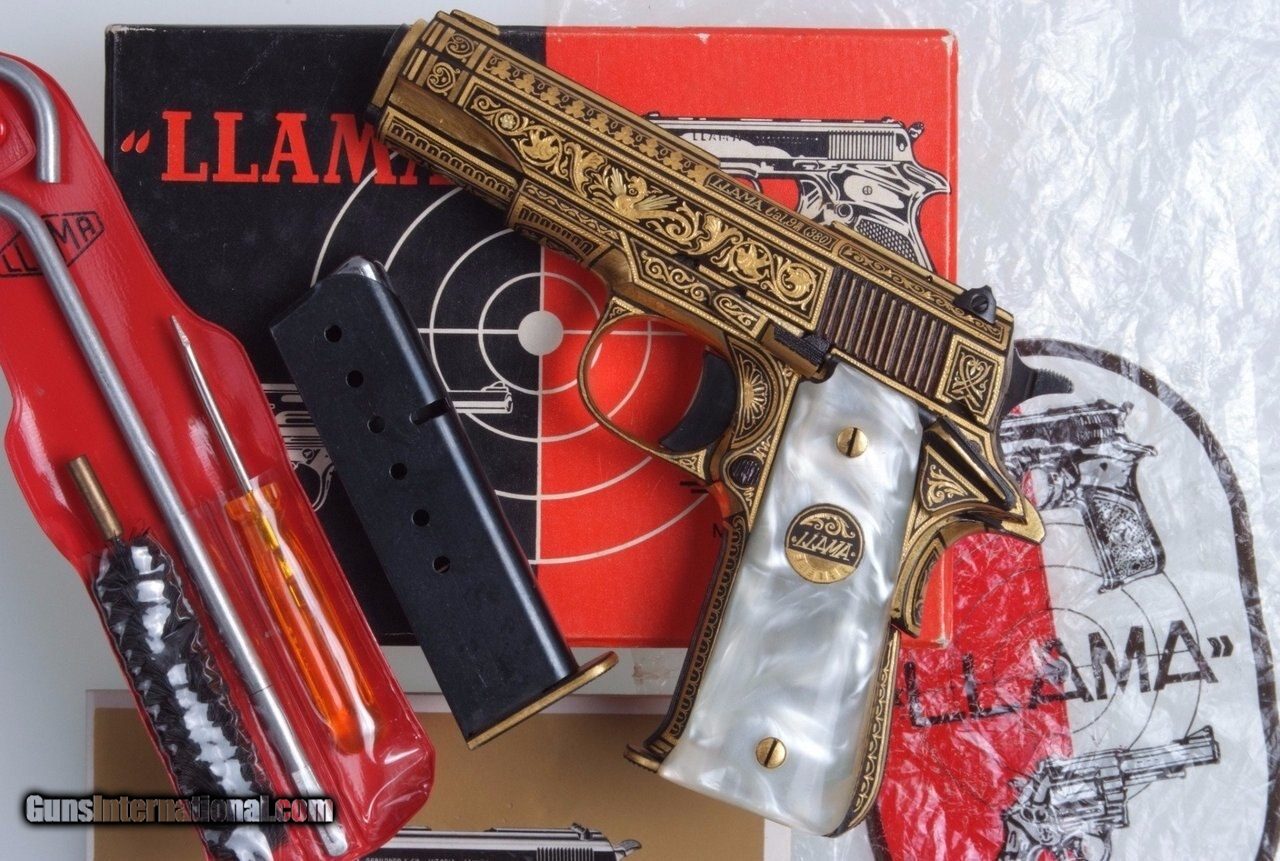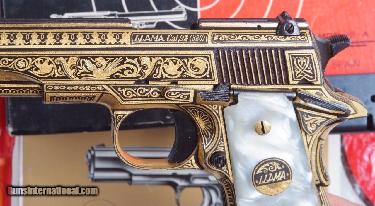 Description: Standard configuration Llama, Mod III-A, in style of Colt M1911A1, with fixed front sight, windage adjustable rear sight and top mounted loaded indicator. Virtually the entire gun, except for some of the small parts and portions of the front and back strap, covered with elaborate and nicely detailed gold damascening. Manufacturer and caliber highlighted in gold on top left of slide. Single panel damascened layouts on each side of slide with dragon, songbird and intertwined floral motif. Right side of frame marked by Stoeger. Songbird representations under forward frame and in a matched pattern on each of the detachable magazine and floorplates. Rearing dragon on grip safety. Swirling pearlite grips with each panel having a gold damascened Llama-marked inserted medallion. Still in original multicolored Llama plastic wrap, spare magazine in original wax paper wrap, complete with laminated instruction booklet and red plastic implement holder for cleaning brush and screw driver. Crisp original multicolored shipping box with caliber and damascened finish marked on right side of box. Synopsis: Fantastic, as NIB Llama Mod III-A, gold damascene with spare magazine, instruction booklet, and original cleaning tools. Condition: Ensemble is virtually new with only the most minute wear from having been unpacked and inspected, the left grip having a few microscopic scuffs over the inserted medallion. Virtually impossible to upgrade! ~~Insured shipping fee of $155; most packages shipped using FedEx 2nd Day.~~ SOLD Manufacturer: Gabilondo y Cia Serial Number: 569224 Caliber Info: .380 ACP |