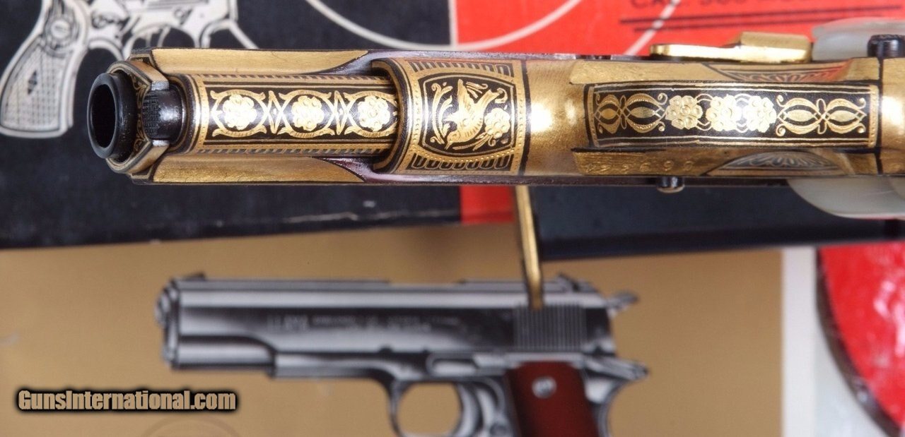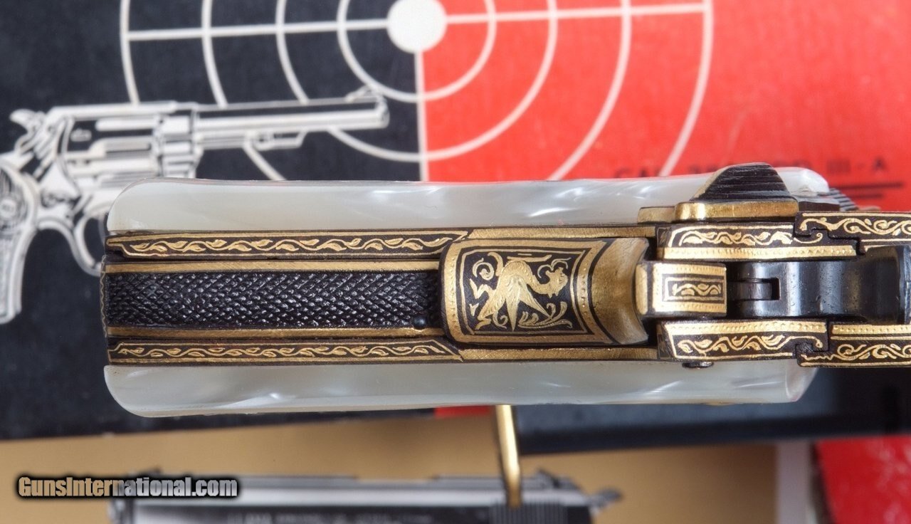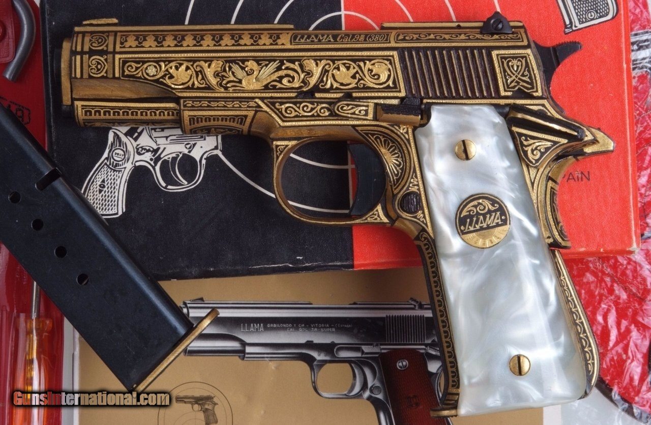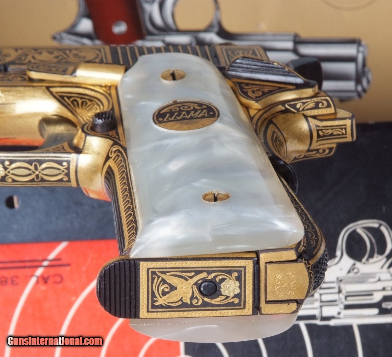 Standard configuration Llama, Mod III-A, in style of Colt M1911A1, with fixed front sight, windage adjustable rear sight and top mounted loaded indicator. Virtually the entire gun, except for some of the small parts and portions of the front and back strap, covered with elaborate and nicely detailed gold damascening. Manufacturer and caliber highlighted in gold on top left of slide. Single panel damascened layouts on each side of slide with dragon, songbird and intertwined floral motif. Right side of frame marked by Stoeger. Songbird representations under forward frame and in a matched pattern on each of the detachable magazine and floorplates. Rearing dragon on grip safety. Swirling pearlite grips with each panel having a gold damascened Llama-marked inserted medallion. Still in original multicolored Llama plastic wrap, spare magazine in original wax paper wrap, complete with laminated instruction booklet and red plastic implement holder for cleaning brush and screw driver. Crisp original multicolored shipping box with caliber and damascened finish marked on right side of box.