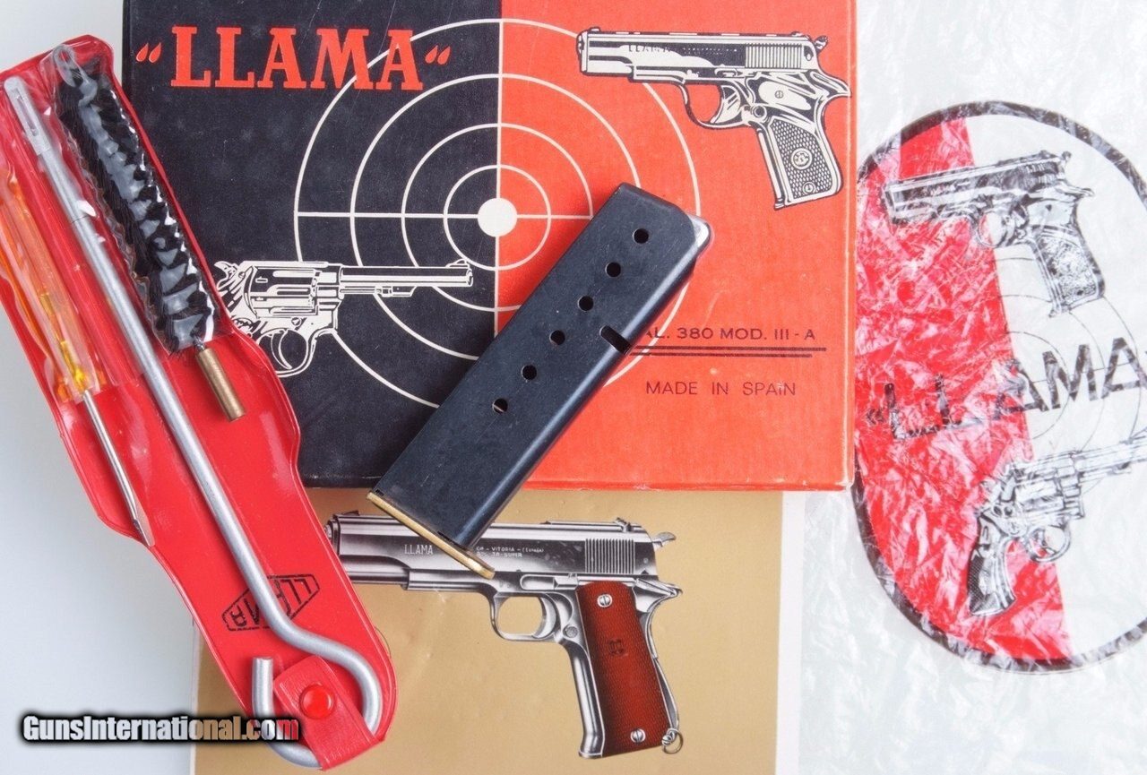 Fantastic, as NIB Llama Mod III-A, gold damascene with spare magazine, instruction booklet, and original cleaning tools.