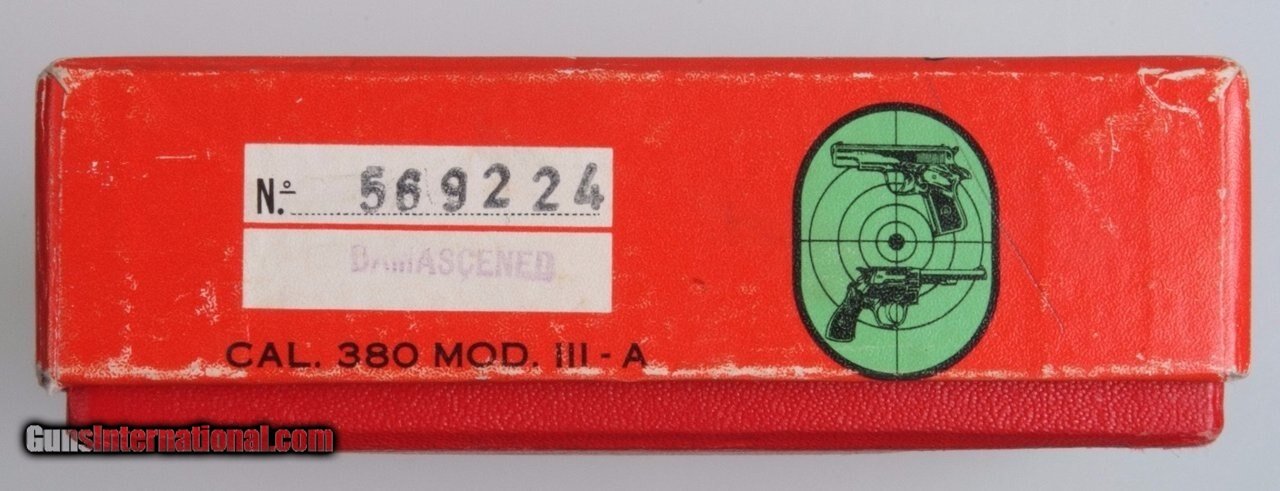 Description: Description: Standard configuration Llama, Mod III-A, in style of Colt M1911A1, with fixed front sight, windage adjustable rear sight and top mounted loaded indicator. Virtually the entire gun, except for some of the small parts and portions of the front and back strap, covered with elaborate and nicely detailed gold damascening. Manufacturer and caliber highlighted in gold on top left of slide. Single panel damascened layouts on each side of slide with dragon, songbird and intertwined floral motif. Right side of frame marked by Stoeger. Songbird representations under forward frame and in a matched pattern on each of the detachable magazine and floorplates. Rearing dragon on grip safety. Swirling pearlite grips with each panel having a gold damascened Llama-marked inserted medallion. Still in original multicolored Llama plastic wrap, spare magazine in original wax paper wrap, complete with laminated instruction booklet and red plastic implement holder for cleaning brush and screw driver. Crisp original multicolored shipping box with caliber and damascened finish marked on right side of box. Synopsis: Fantastic, as NIB Llama Mod III-A, gold damascene with spare magazine, instruction booklet, and original cleaning tools. Condition: Ensemble is virtually new with only the most minute wear from having been unpacked and inspected, the left grip having a few microscopic scuffs over the inserted medallion. Virtually impossible to upgrade! SOLD Manufacturer: Gabilondo y Cia Serial Number: 569224 Caliber Info: .380 ACP |
