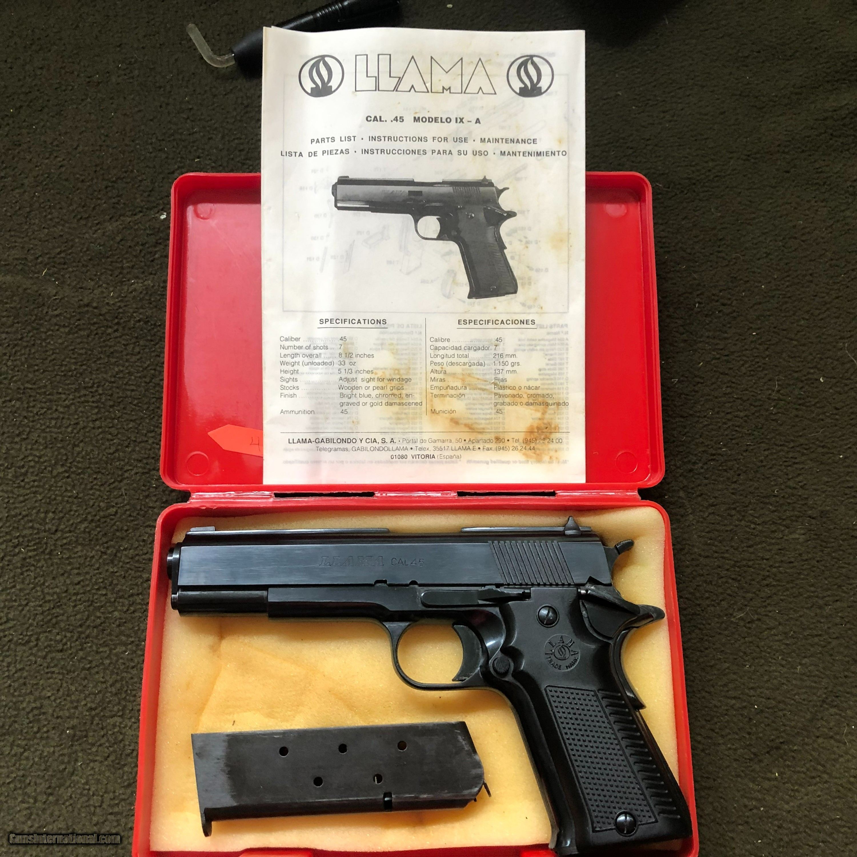 Description: LLAMA IX-A BROWNING CLONE IN VERY GOOD CONDITION w BOX AND MANUAL BOOKLET.ACTION IS TIGHT ,BORE IS CLEAN AND STRONG IN LIKE NEW CONDITION WITH NO WEAR.ALL THE CORRECT PROOF MARKS HAS IMPORT MARK SERIAL C23163 ANOTHER ITEM FROM THE COLLECTORS ESTATE ALWAYS OPEN TO OFFERS ON MULTIPLE BUYS FFL REQUIRED SOLD Handgun Caliber: .45 |
