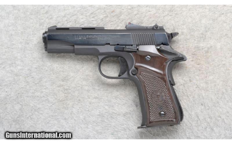 Description: This Llama Model Semi-Automatic is a right hand pistol that comes in .380 ACP Cal. It has a 3.75 inch barrel with a rear serrated ventilated rib slide. A blade front sight and notch rear sight. The grip is a checkered hard brown plastic. The back strap is checkered. .380 ACP SOLD Chambers: 6 shot magazine. Metal Condition: Very good. Some minor use marks on top of the slide. Bore Condition: Very Good. Barrels: 3.75 inch barrel with a rear serrated ventilated rib slide. Weight: 24 oz. Sights: Blade front. Notch rear. Item Location: Richfield, WI |
