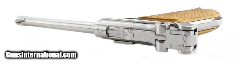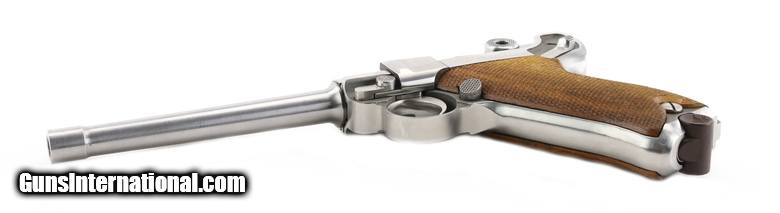 Description: Aimco American Eagle Luger 9mm caliber pistol. Stainless Steel American Eagle Navy model with 6” barrel in excellent condition.