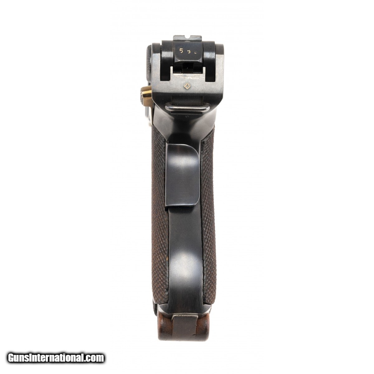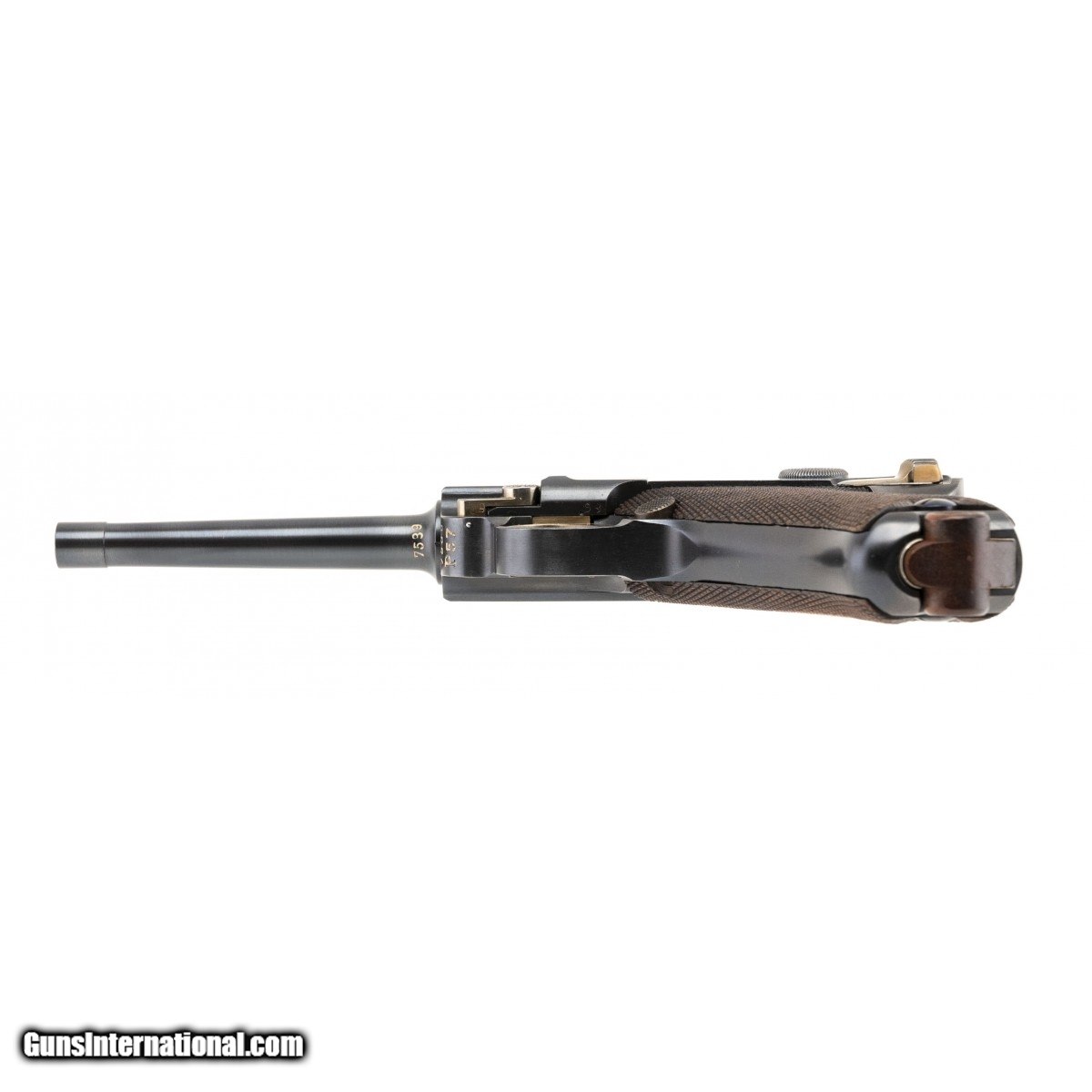 The DWM manufactured 1906 Swiss military Luger pistol can be identified by the combination of the late toggle knobs, the Cross in Sunburst over the chamber, the lack of a serial number on the left side of the frame, serial number range frome 5001 to 15215, no barrel inscription, and Swiss military proofs. This gun fits these charceristics. The 4.75"" 7.65mm caliber (30 Luger) barrel has an excellent bore with bright, strong rifling. The chamber has the Cross in Sunburst over it and the toggle has the DWM logo. The frame and barrrel have the full serial number, 7589, and the expected small parts, including the grip panels, are correctly numbered to the gun. P57 is stamped just below the frame serial number. The barrel, frame, and receiver have the Swiss rewrok proof on them and the receiver has the rectangular inspection mark of a cross over V which is the receiver rework proof for Swiss inspector Herr Voiglesang. The gun retains approx. 99% rework blue and straw. The excellent correctly unnumbered wood base magazine has the desirable roung metal insertes in the base. The action functions correctly. You won;t find one nicer than this one!