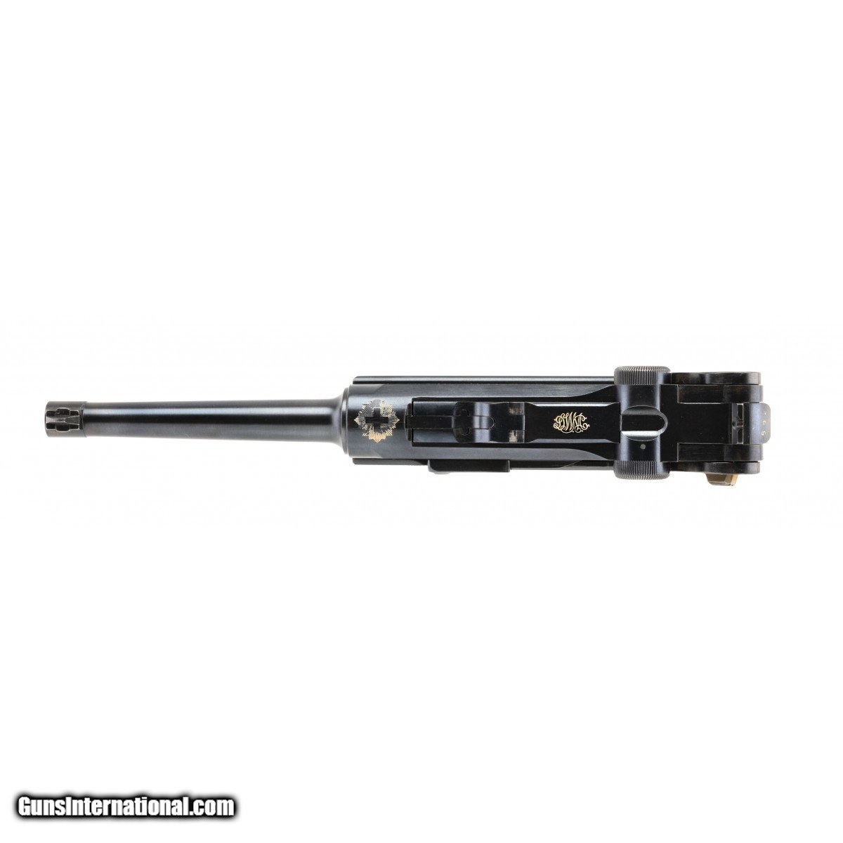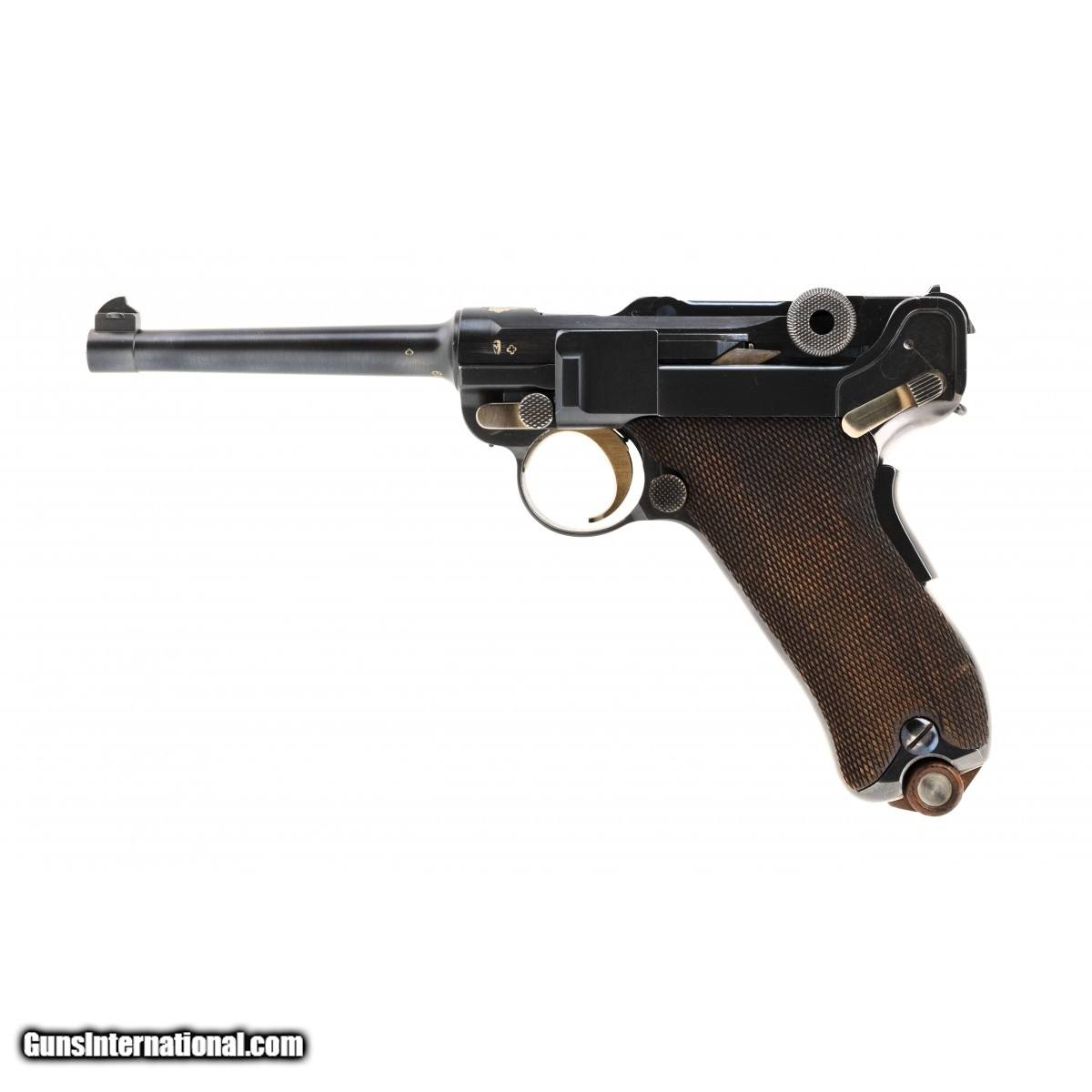 Description: " The DWM manufactured 1906 Swiss military Luger pistol can be identified by the combination of the late toggle knobs, the Cross in Sunburst over the chamber, the lack of a serial number on the left side of the frame, serial number range frome 5001 to 15215, no barrel inscription, and Swiss military proofs. This gun fits these charceristics. The 4.75"" 7.65mm caliber (30 Luger) barrel has an excellent bore with bright, strong rifling. The chamber has the Cross in Sunburst over it and the toggle has the DWM logo. The frame and barrrel have the full serial number, 7589, and the expected small parts, including the grip panels, are correctly numbered to the gun. P57 is stamped just below the frame serial number. The barrel, frame, and receiver have the Swiss rewrok proof on them and the receiver has the rectangular inspection mark of a cross over V which is the receiver rework proof for Swiss inspector Herr Voiglesang. The gun retains approx. 99% rework blue and straw. The excellent correctly unnumbered wood base magazine has the desirable roung metal insertes in the base. The action functions correctly. You won;t find one nicer than this one! SOLD Curio/Relic: Yes |