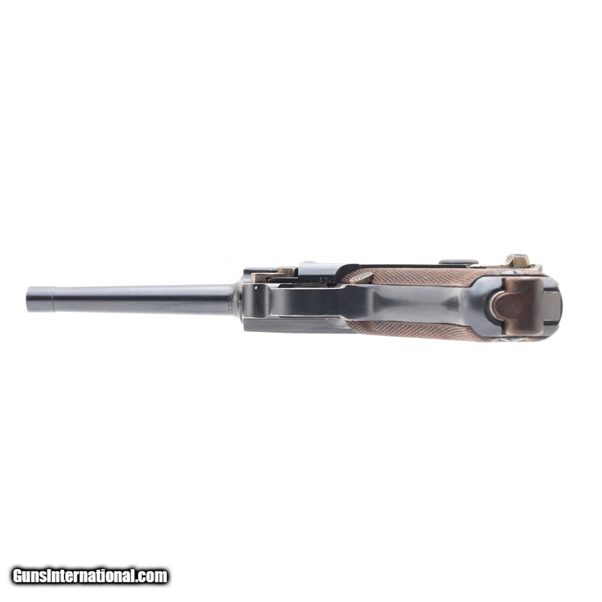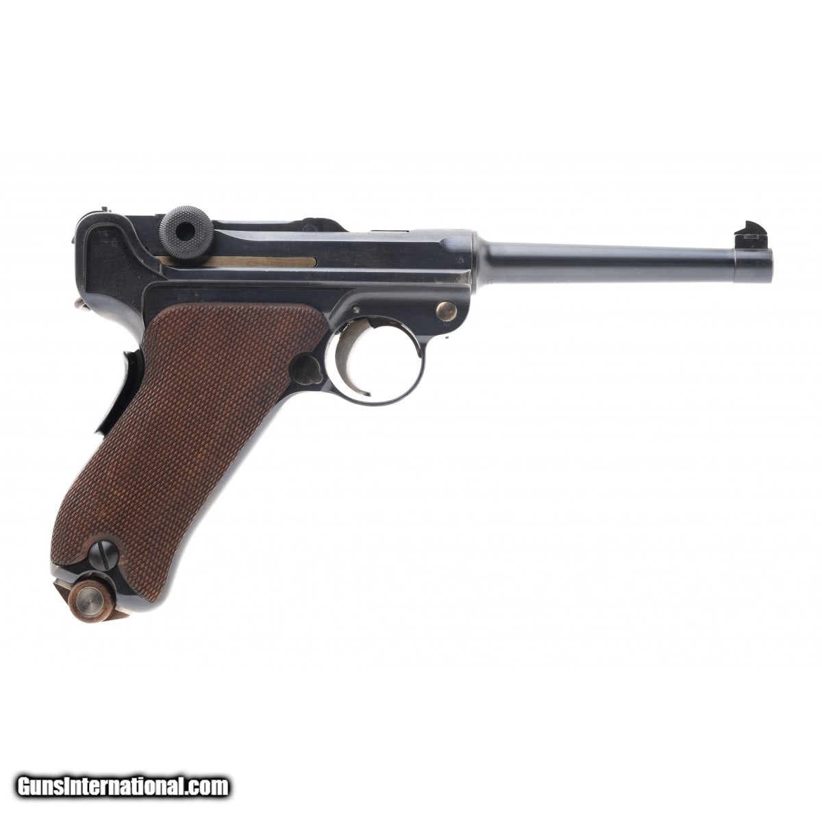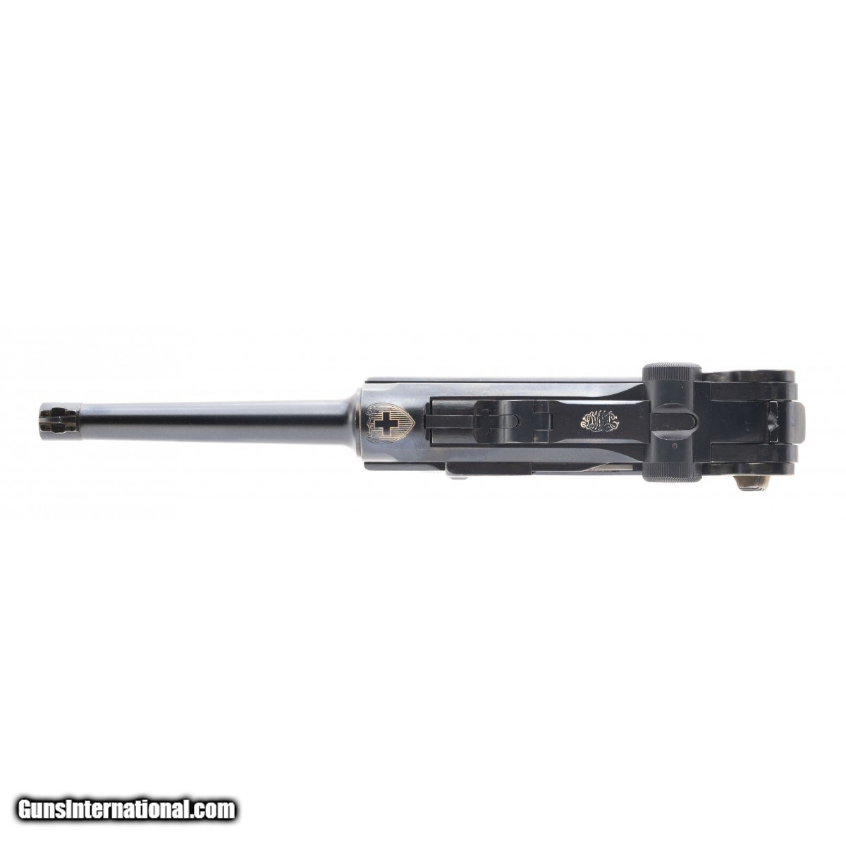 The 1906 Swiss Police Luger can be identified by the Swiss cross in shield logo on the chamber. They were made by DWM for the Swiss. The toggle has the DWM logo and the receiver has the Swiss cross rework proof. The left side of the receiver also is marked P50 which stands for the year (1950) it was released for sale by the Swiss police. The 4.75"" 7.65mm (30 Luger) caliber barrel has an excellent bore with bright, strong rifling. The gun retains approx. 98% of its rework blue and approx. 90% straw finish. All parts are matching. The grip panels are unnumbred. The correctly unnumbered wood base with the round metal inserts magazine is excellent. The acrtion functions properly. This cross in shield 1906 Swiss police Luger is ready for your collection!