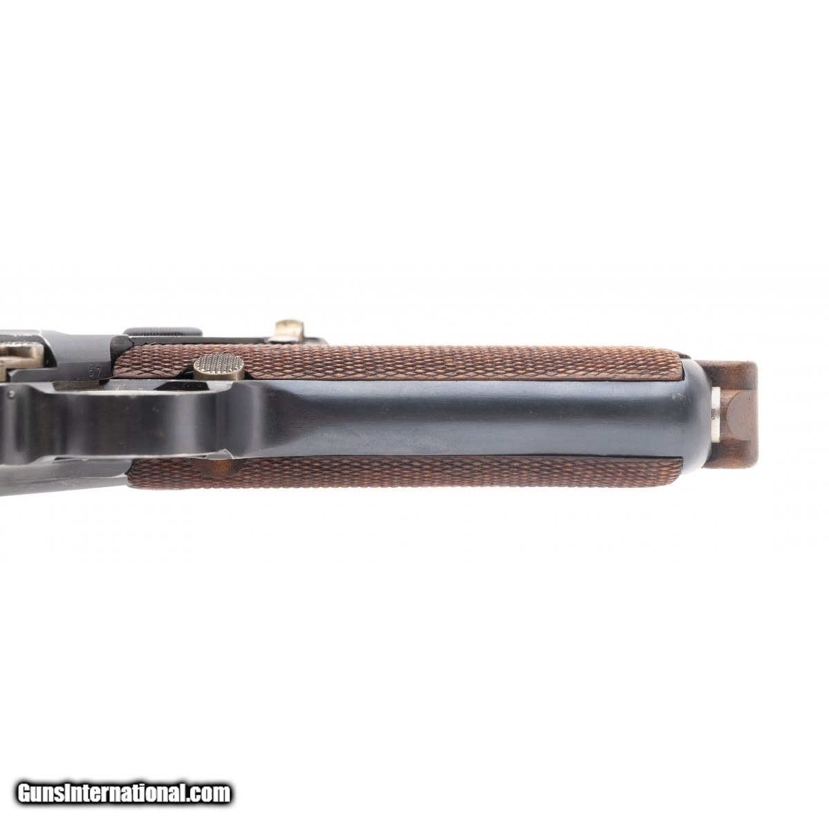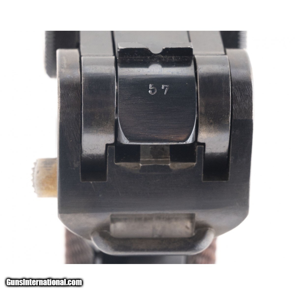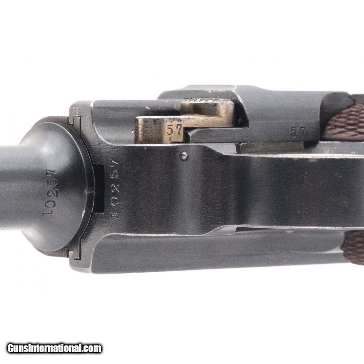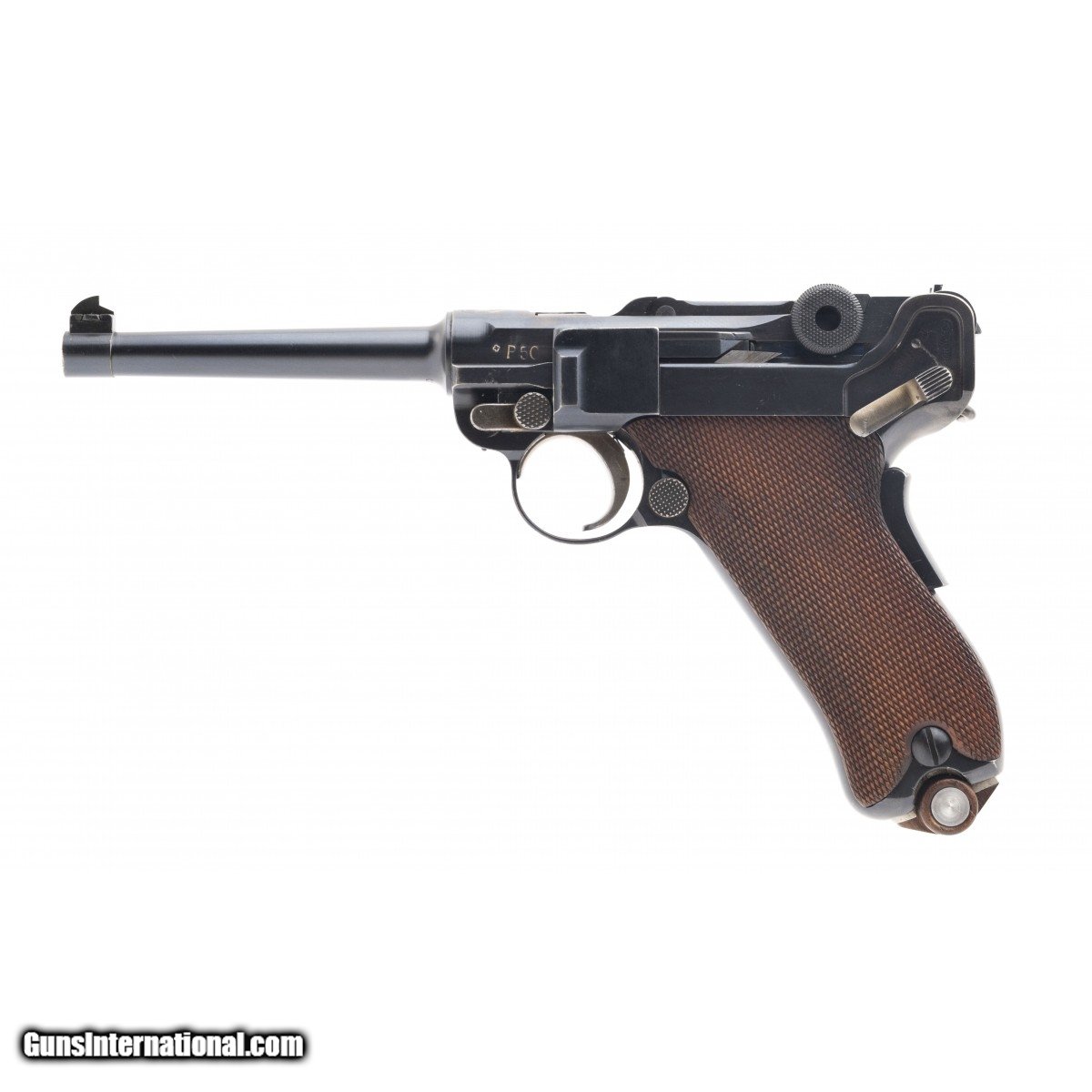 The 1906 Swiss Police Luger can be identified by the Swiss cross in shield logo on the chamber. They were made by DWM for the Swiss. The toggle has the DWM logo and the receiver has the Swiss cross rework proof. The left side of the receiver also is marked P50 which stands for the year (1950) it was released for sale by the Swiss police. The 4.75"" 7.65mm (30 Luger) caliber barrel has an excellent bore with bright, strong rifling. The gun retains approx. 98% of its rework blue and approx. 90% straw finish. All parts are matching. The grip panels are unnumbred. The correctly unnumbered wood base with the round metal inserts magazine is excellent. The acrtion functions properly. This cross in shield 1906 Swiss police Luger is ready for your collection!