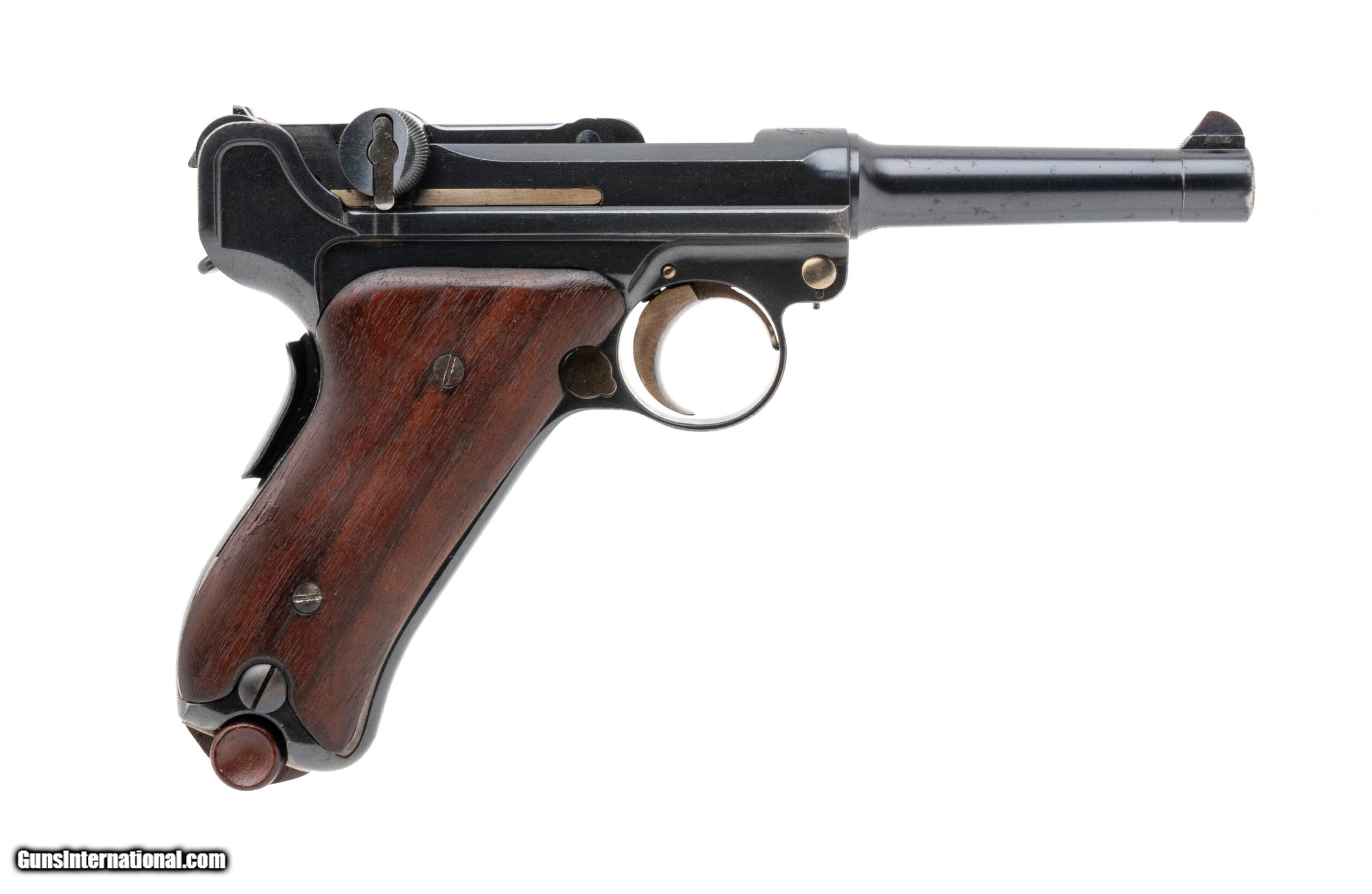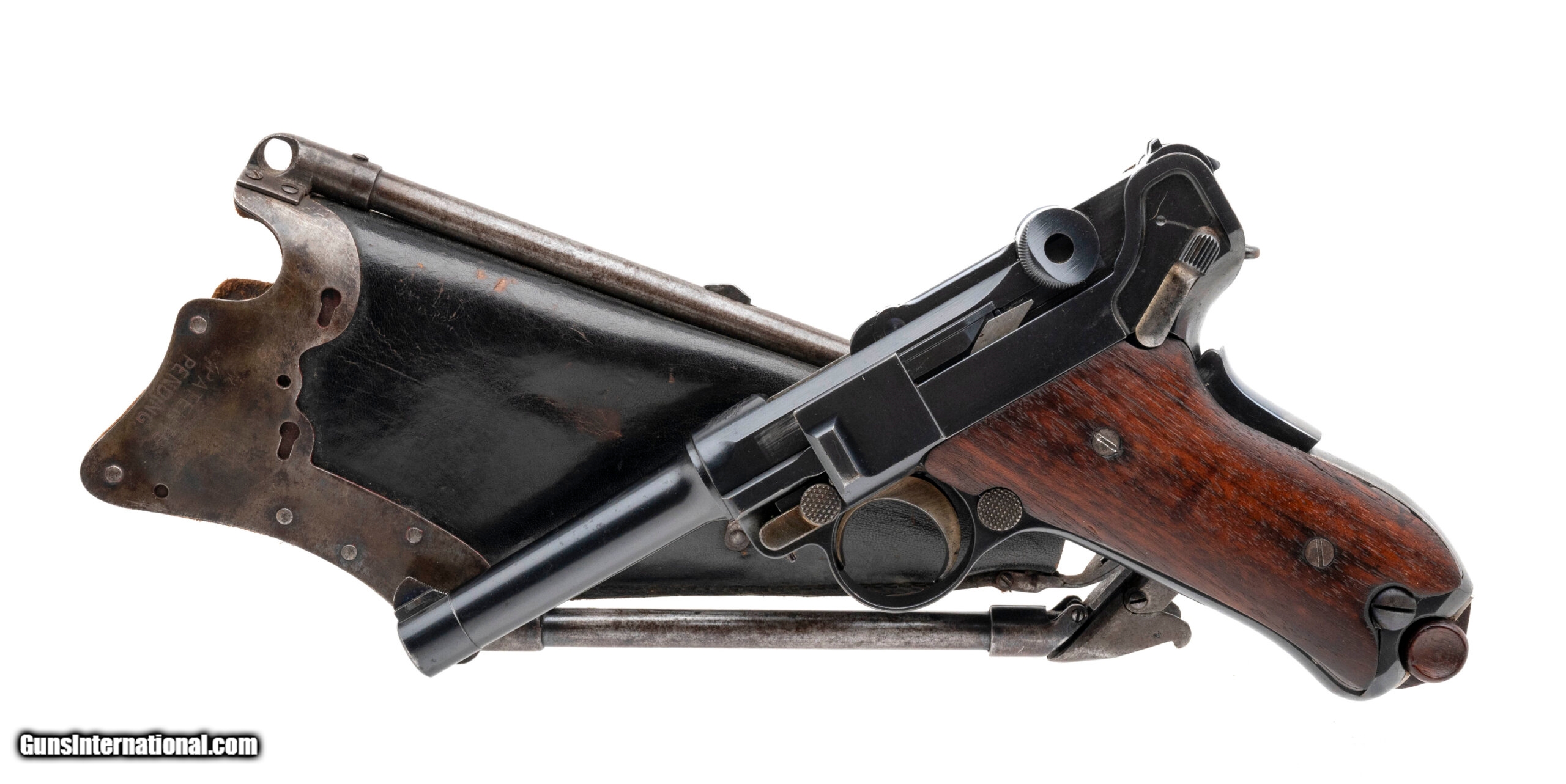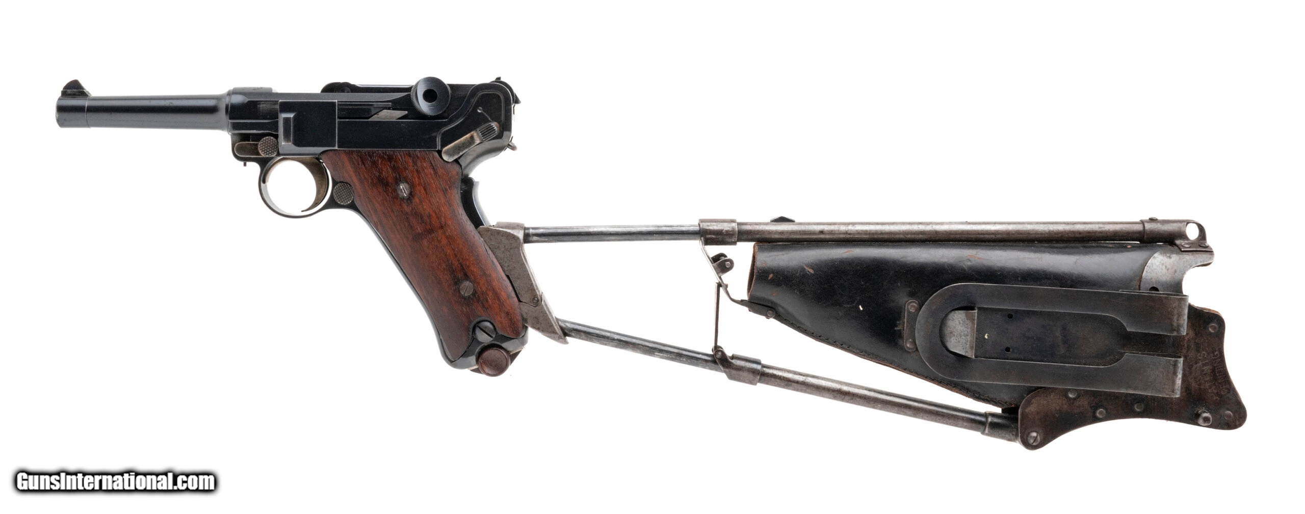 Description: "Serial number 22840. Made circa 1902. 9mm with a 4" barrel. This is a fantastic gun with 95% of the original blue finish. This is a rare American Eagle Model 1902 “Fat Barrel" Luger. It is estimated only 600-700 of the rare commercial guns were made for the American market. This gun comes with an Idea Shoulder stock. This was a Holster and stock combination that was patented in 1901. These stocks are on the curio and relics list as of 2007. Very rare gun with a very rare stock! Price: $16,500.00 Contact Seller |
