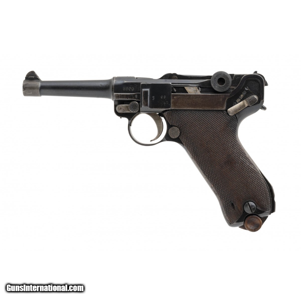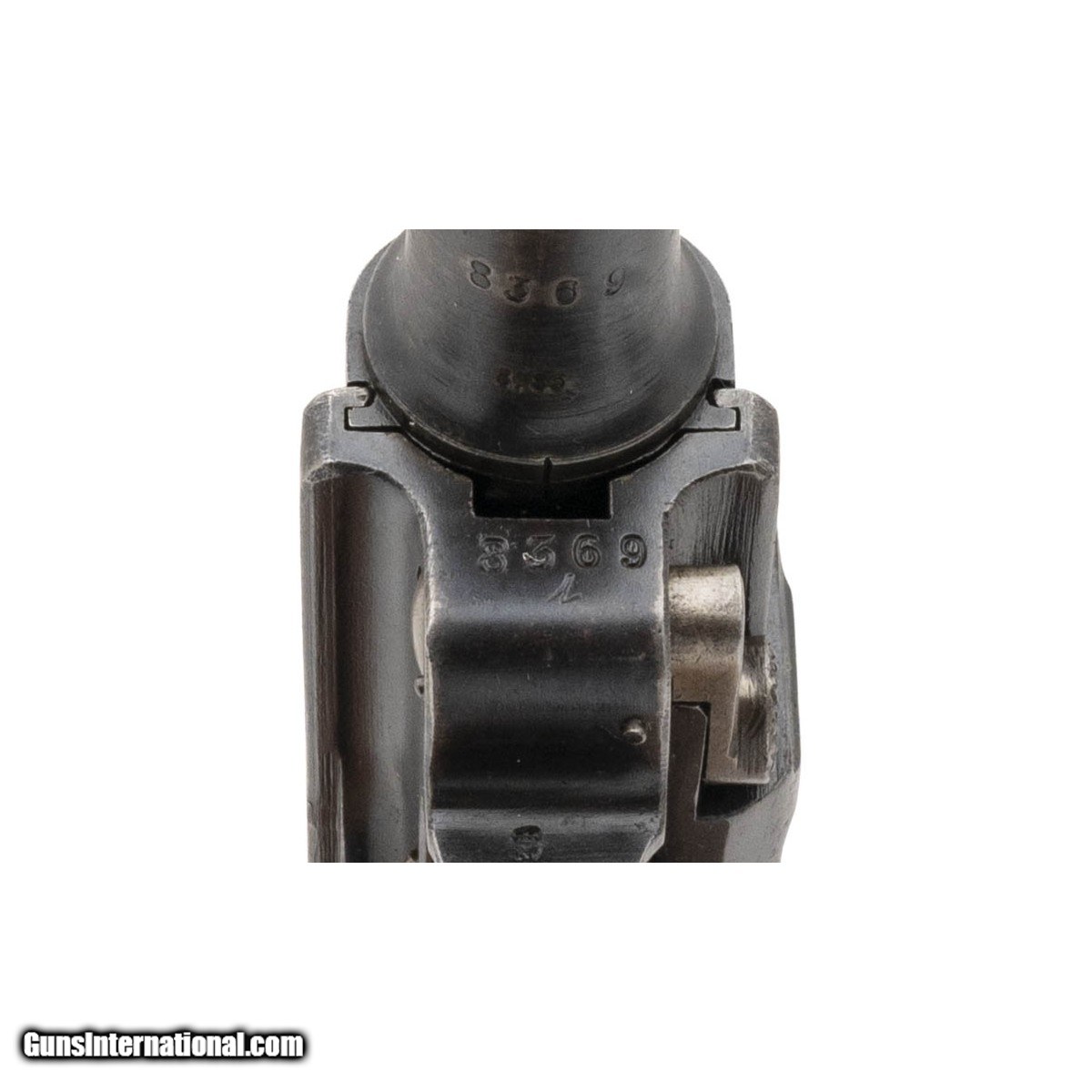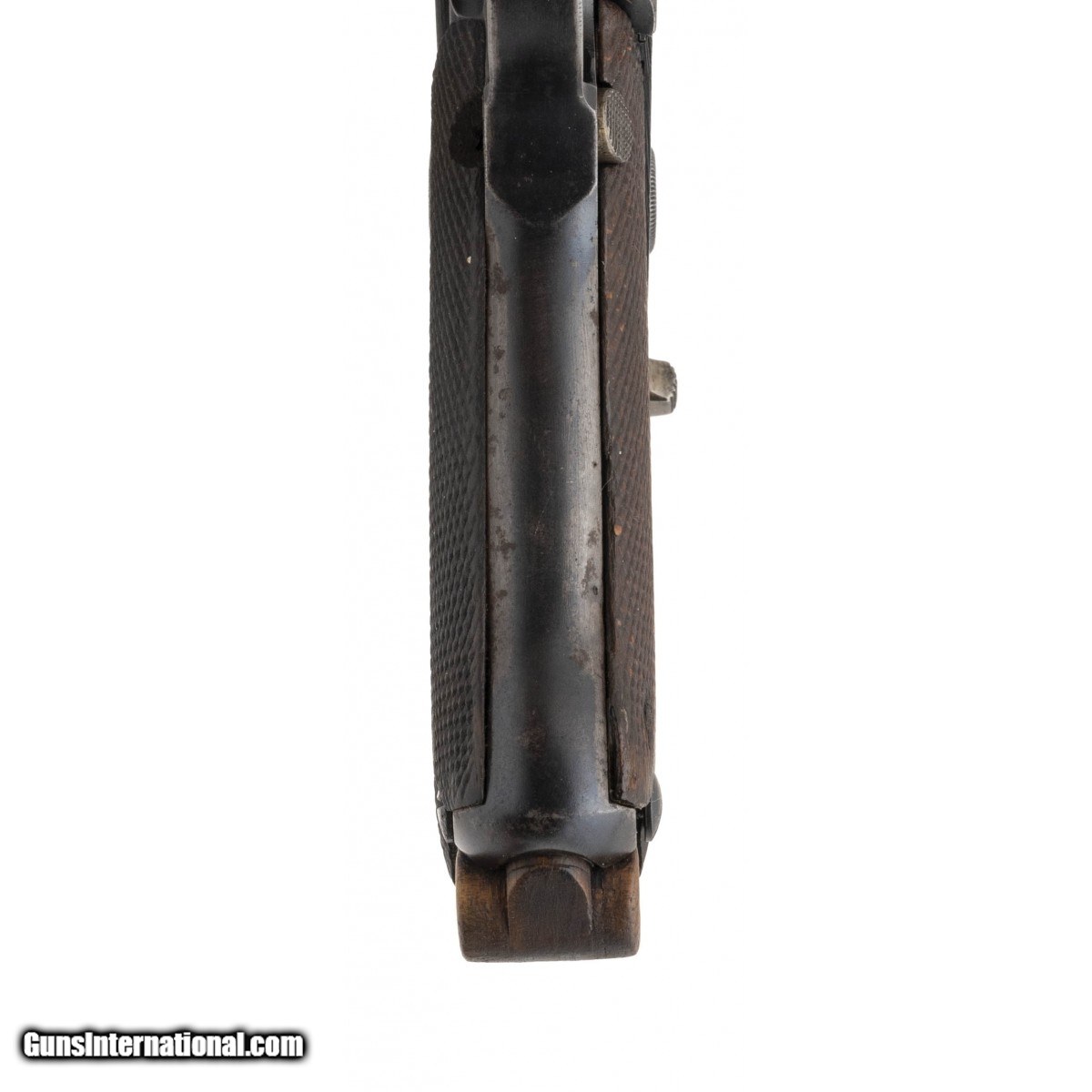 Serial No. 8369I, made in 1918 by Erfurt, 9mm, 4"" round Imperial marked barrel. Approximately 85% original blue remains with areas of thinning visible along the edges. Serial numbers are matching except for the magazine, grips only have ""6""stamped on the inside. Majority of straw remains with the trigger showing the most loss. Bore is shows frosting in the grooves, rifling remains strong. Action functions correctly. C&R