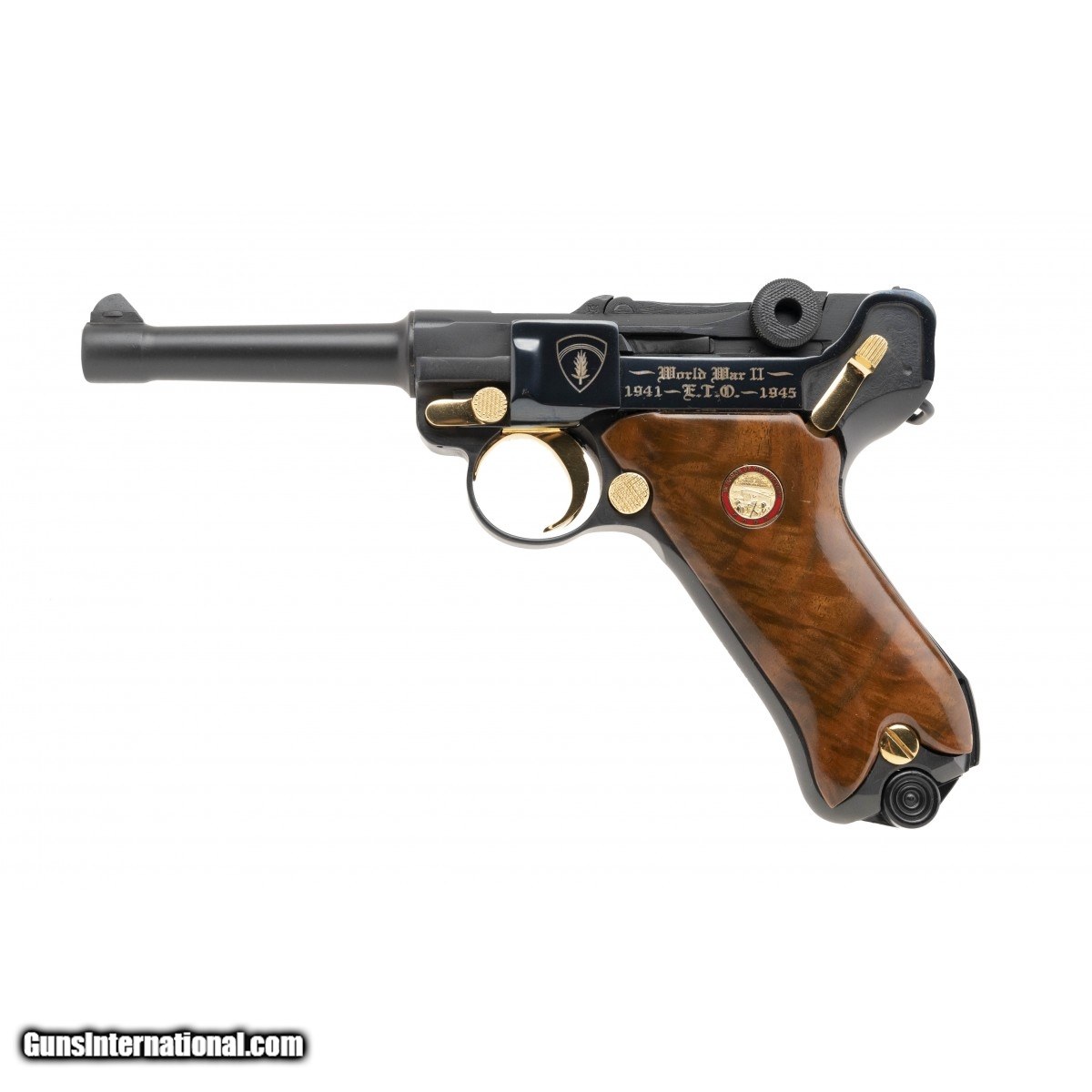 Eastern Theater of Operations Commemorative Luger with gold small parts, beautifully figured walnut grips inlayed with a medallion, and marked ""World War II 1941-E.TO.- 1945"" on left side of slide. A good looking Luger.