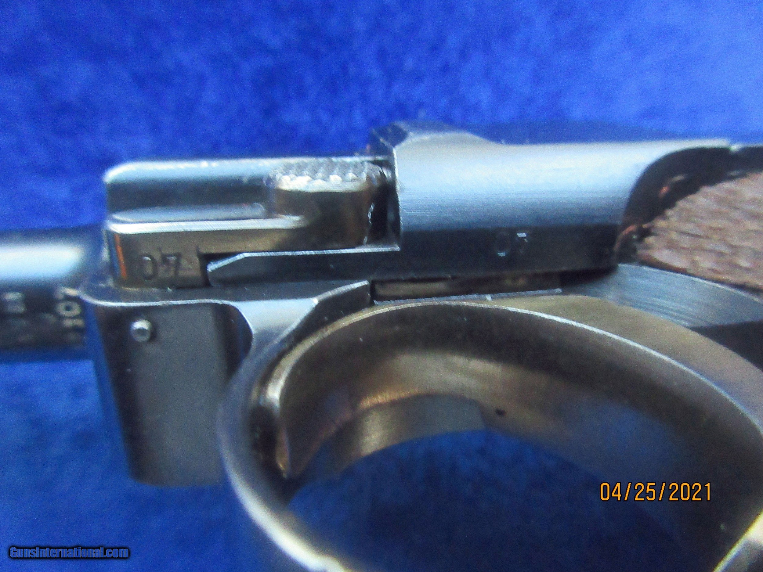 Description: DESCRIPTION: .30 cal./7.65 mm DWM Luger, unmarked chamber with DWM script on toggle, wide grip safety, new model knurled, flat toggle grips, correct B.U. proofs on frame and similar proofs + full serial number on underside of barrel, 100% all-matching s/n parts, 99% un-numbered wood grips, polished area under safety, 8 mm fluted safety lever, v-rear sight, 95-98% strawed parts, NRA blue graded F-E with only the slightest polishing/holster wear at the usual locations on the sideplate, trigger guard and front barrel band. There are various sources describing/estimating the number of Francaise d'Armes & Cycles de Sainte-Etienne Lugers, the numbers varying from 2-10 total guns of this type. Many active Luger collectors have never actually even seen one! This Luger variation, with the exception of the unobtainable .45 cal Luger, GL Lugers and one or two very low serial number Lugers, is among the rarest of the rare and 100% original in every way. It would be a highly-featured gun in any serious Luger collection. This is an all-matching, all-original noexcuses gun. $14,500; serious offers considered Buyer pays $100 shipping and insurance to qualified FFL?C&R license holder. Usual three-day inspection period. SOLD Curio/Relic: Yes Handgun Caliber: 7.65x22mm Parabellum (7.65x22mm Luger, .30 Luger) |