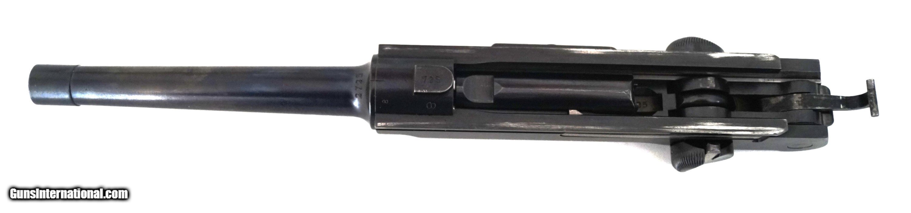 Description: THIS IS A 1900 DWM SWISS GERMAN LUGER RIG, 7.65MM. THE LUGER IS IN VERY GOOD CONDITION. ALL ORIGINAL, NUMBER MATCHING, VERY GOOD BORE AND GRIPS, MECHANICALLY CORRECT. THE RIG CONSISTS OF THE LUGER, 1 ORIGINAL MAGAZINE, 1 ORIGINAL HOLSTER AND 1 ORIGINAL SWISS CLEANING KIT. THEY DON'T COME BETTER THAN THIS. Curio/Relic: Yes Price: $4,900.00 Contact Seller |