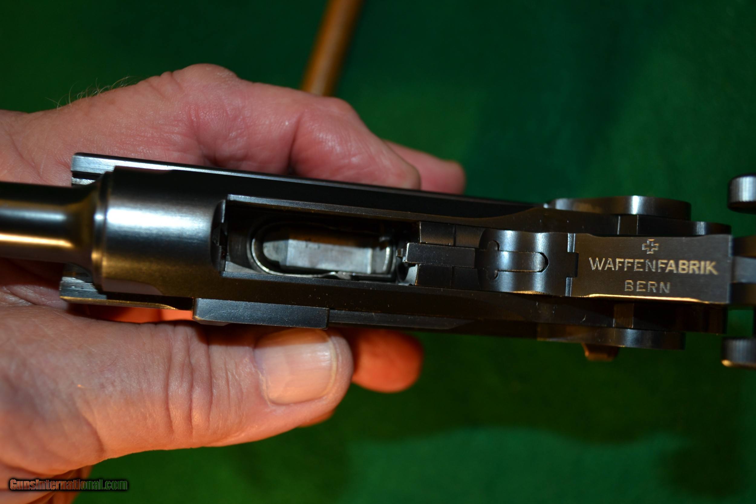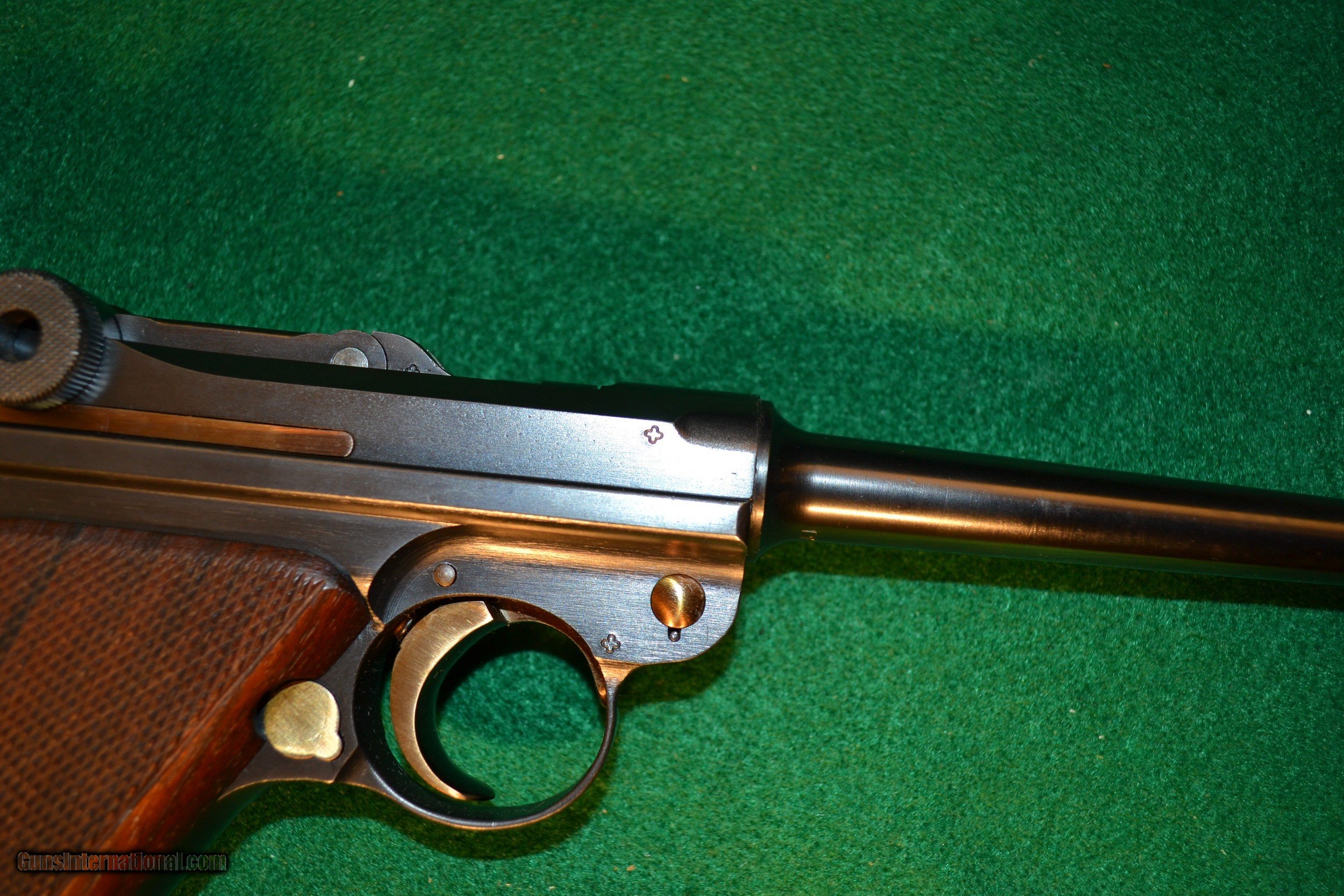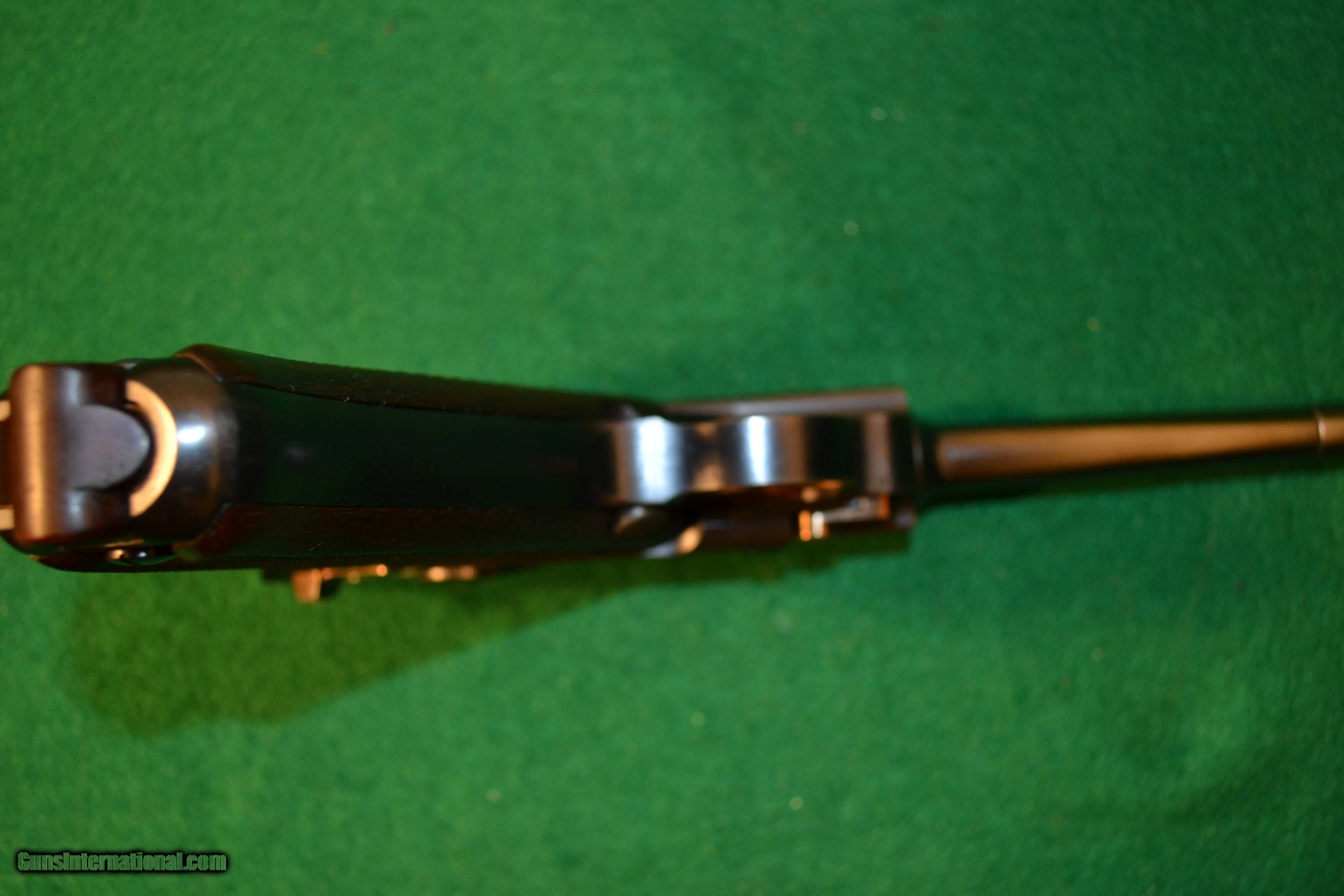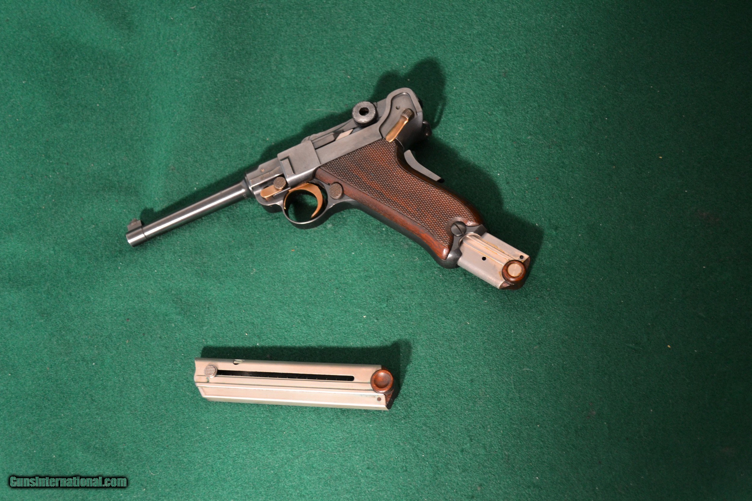 Description: Sale Pending !! This 1906 Bern Waffenbrik, Ser No 17817 was mfg at the Bern Facility in Bern , Switzerland. There were exacty 17,874 mfg.pf this model mfg at this plant. My references for info are from The Luger Handbook by Aaron Davis - 1997 and The Luger Story by John Walter. Accordinngly these Bern Plant Luger's were considered the best in design and free of the defects found in some German manufacturers. Undoubtebly caused by Wartime requirements. (World War I and Post economic issues) This Bern Luger is in Excellent condition (Abt 99%), The bluing is about 99% and the Wood Grips are 100%. Being the condition is so pristine I suspect that this was a Bern Plant remanufactured product. The following is a descriprion of the Bern - Luger's component's : Manufacturer - Waffenbrik - Bern, Toggle - Srrated Type marked Waffenbrik/Bern, Barrel - 4 3/4" in 7.65 Caliber, Frame - Long Type w/grip Safety, Wide Trigger, & narrow Trigger Guard, Receiver - New Long type, chamber is unmarked, Thumb Safety - lower Area Polished, safe in up position, Sights - Frt Fixed "V" Notch, Dovetail front, Extractor - New Type, Grips - Checkered walnut w/plain border - slotted for grip safety, Magazine - Wood Base, unumbered, Finish - Dull, flat blue. Ejector, magazine catch, takedown lever, thumb safety lever and trigger all are straw colored, Quantity Made - Exactly 17,874, Serial Range - 15216 - 33089, Serial Location - 2 digits: breechblock, extractor, grips,grip safety, rreceiver, side plate, takedown lever, toggle. Full Serial No - Front of Frame , bottom of barrel. History: This model was mfg for the Swiss Military & Police sales. It is the first Luger not made in Germany. Proofmark - + Location Receiver, "M" - Boxed Description - Colonel Muhlemann This Bern - Luger fufulls all of the above criteria and to me is an outstanding examble of true "Swiss" quality workmanship and no small wonder compared to their fine watches. Holster - Mfg by Andres Sattler Wynau - Dated 1/8 (? Year). Excellent supple Tan leather w/original strap (Not rotted - perfect) w/extra matching magazine. SOLD Curio/Relic: Yes Handgun Caliber: 7.65x22mm Parabellum (7.65x22mm Luger, .30 Luger) Manufacturer: Bern - Waffenbrik Model: Luger Serial Number: 17817 Barrel Length: 4 3/4 Inch Bore: Excellent Condition: Excellent Metal Condition: Excellent Wood Condition: Excellent Bore Condition: Mirror - Excellent Action: Semi Auto Triggers: Straw |