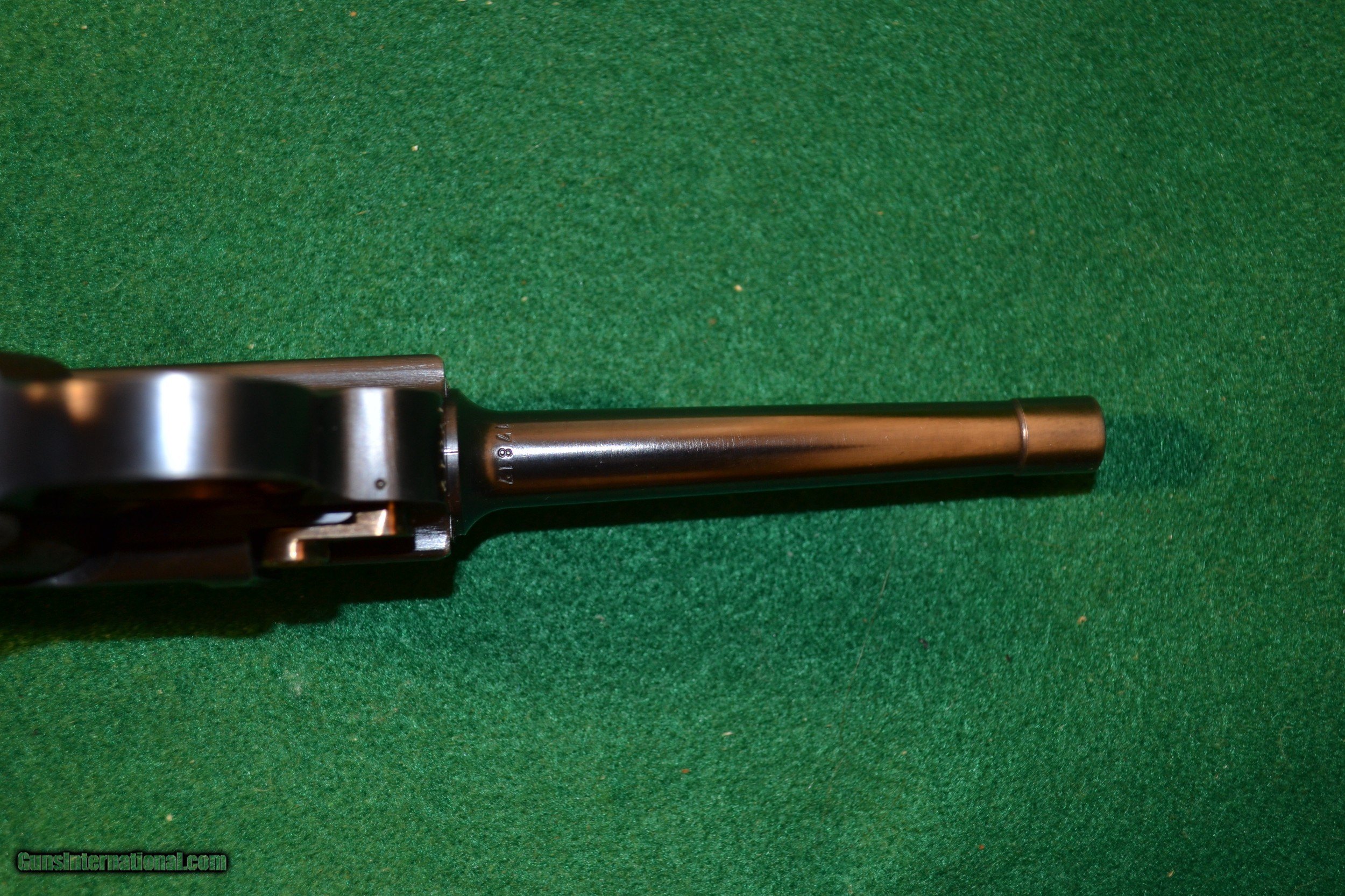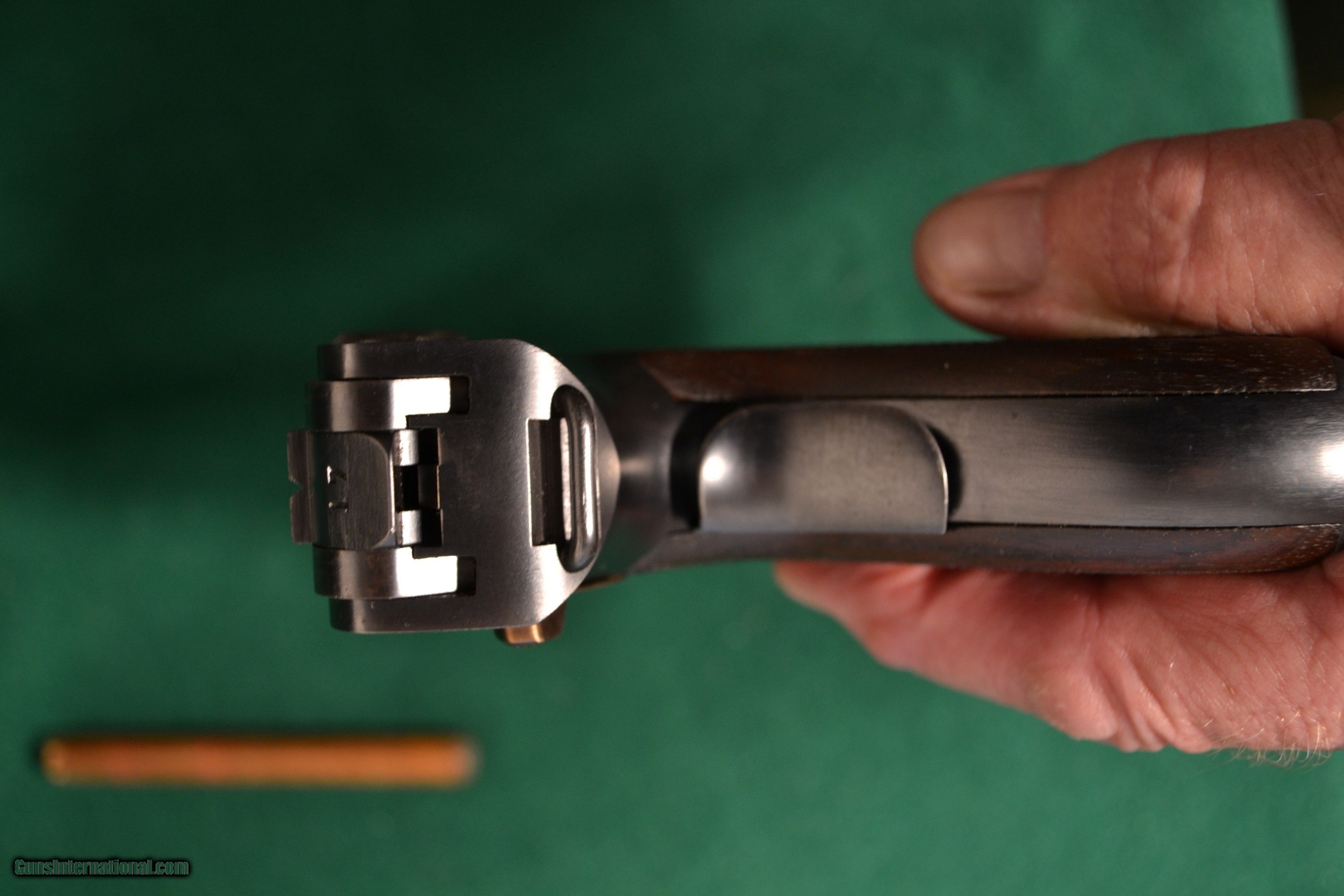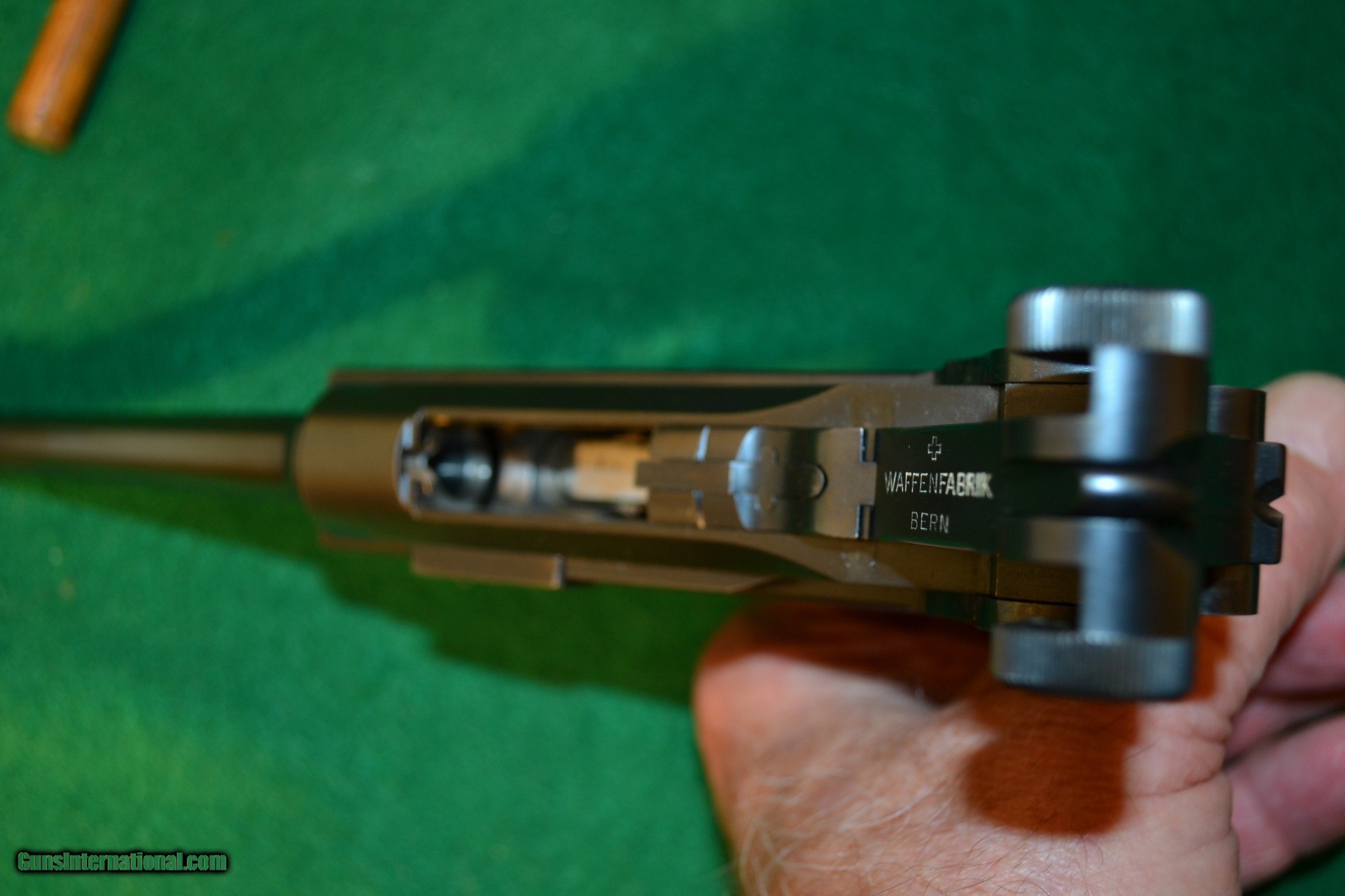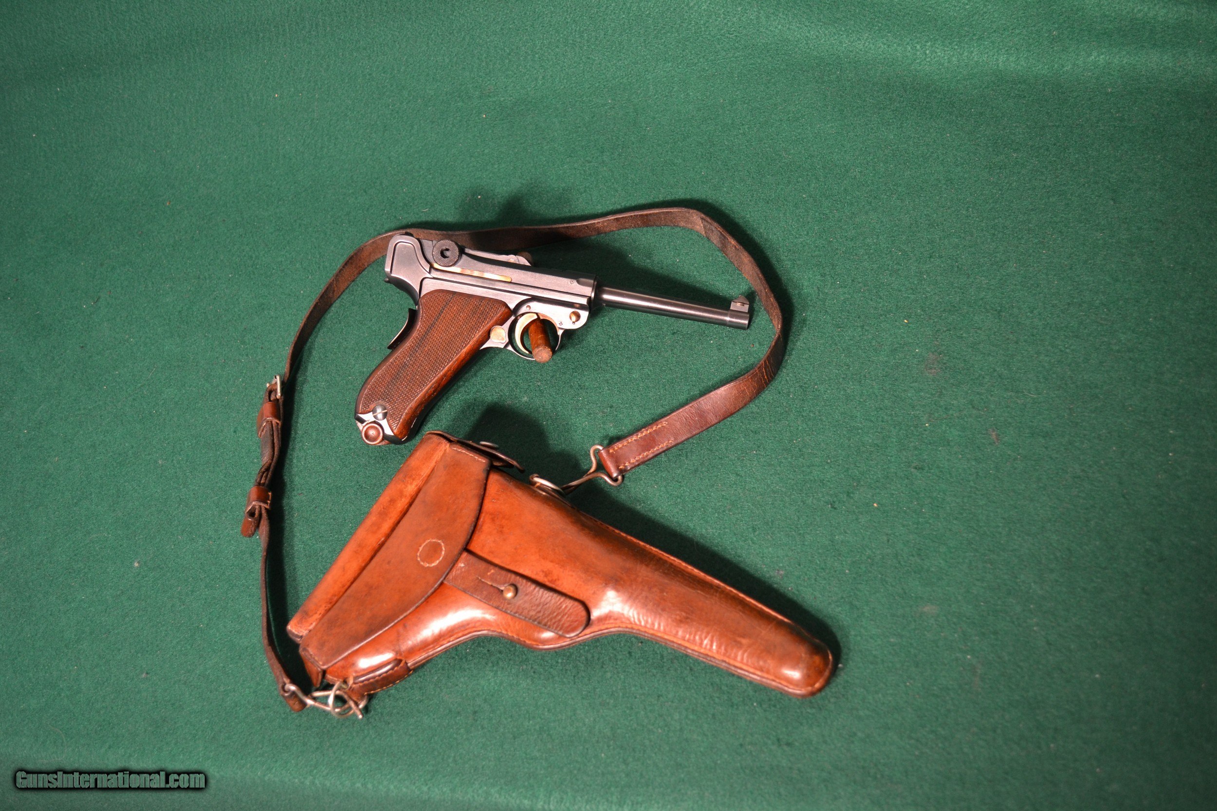 Description: Sale Pending !! This 1906 Bern Waffenbrik, Ser No 17817 was mfg at the Bern Facility in Bern , Switzerland. There were exacty 17,874 mfg.pf this model mfg at this plant. My references for info are from The Luger Handbook by Aaron Davis - 1997 and The Luger Story by John Walter. Accordinngly these Bern Plant Luger's were considered the best in design and free of the defects found in some German manufacturers. Undoubtebly caused by Wartime requirements. (World War I and Post economic issues) This Bern Luger is in Excellent condition (Abt 99%), The bluing is about 99% and the Wood Grips are 100%. Being the condition is so pristine I suspect that this was a Bern Plant remanufactured product. The following is a descriprion of the Bern - Luger's component's : Manufacturer - Waffenbrik - Bern, Toggle - Srrated Type marked Waffenbrik/Bern, Barrel - 4 3/4" in 7.65 Caliber, Frame - Long Type w/grip Safety, Wide Trigger, & narrow Trigger Guard, Receiver - New Long type, chamber is unmarked, Thumb Safety - lower Area Polished, safe in up position, Sights - Frt Fixed "V" Notch, Dovetail front, Extractor - New Type, Grips - Checkered walnut w/plain border - slotted for grip safety, Magazine - Wood Base, unumbered, Finish - Dull, flat blue. Ejector, magazine catch, takedown lever, thumb safety lever and trigger all are straw colored, Quantity Made - Exactly 17,874, Serial Range - 15216 - 33089, Serial Location - 2 digits: breechblock, extractor, grips,grip safety, rreceiver, side plate, takedown lever, toggle. Full Serial No - Front of Frame , bottom of barrel. History: This model was mfg for the Swiss Military & Police sales. It is the first Luger not made in Germany. Proofmark - + Location Receiver, "M" - Boxed Description - Colonel Muhlemann This Bern - Luger fufulls all of the above criteria and to me is an outstanding examble of true "Swiss" quality workmanship and no small wonder compared to their fine watches. Holster - Mfg by Andres Sattler Wynau - Dated 1/8 (? Year). Excellent supple Tan leather w/original strap (Not rotted - perfect) w/extra matching magazine. SOLD Curio/Relic: Yes Handgun Caliber: 7.65x22mm Parabellum (7.65x22mm Luger, .30 Luger) Manufacturer: Bern - Waffenbrik Model: Luger Serial Number: 17817 Barrel Length: 4 3/4 Inch Bore: Excellent Condition: Excellent Metal Condition: Excellent Wood Condition: Excellent Bore Condition: Mirror - Excellent Action: Semi Auto Triggers: Straw |