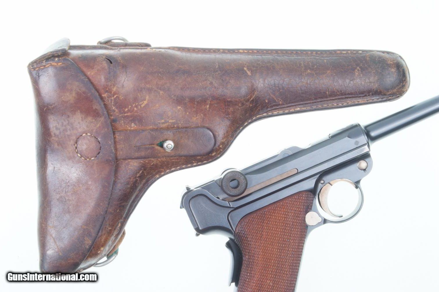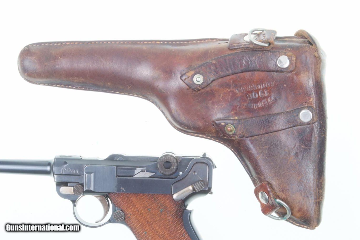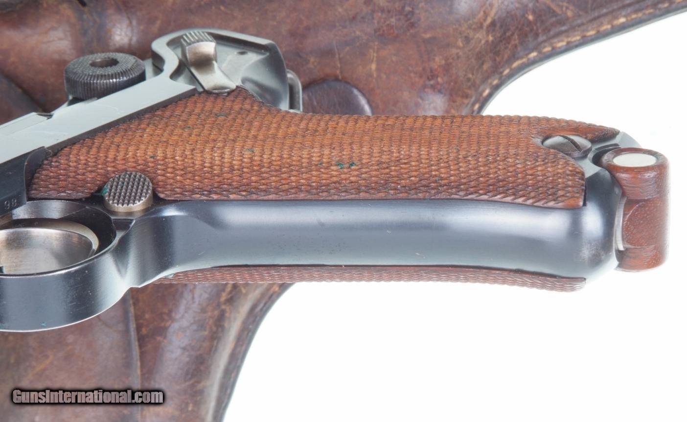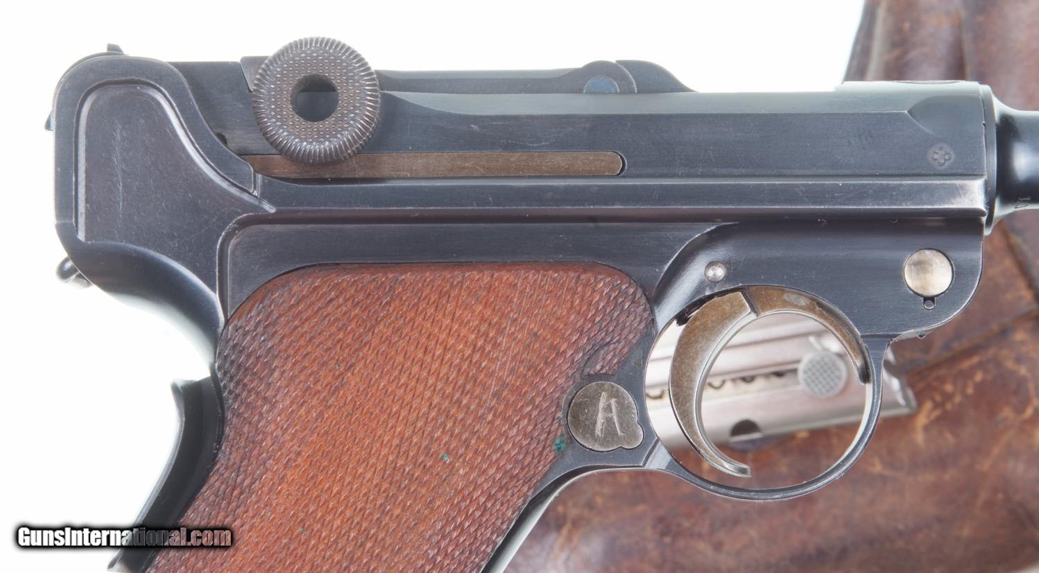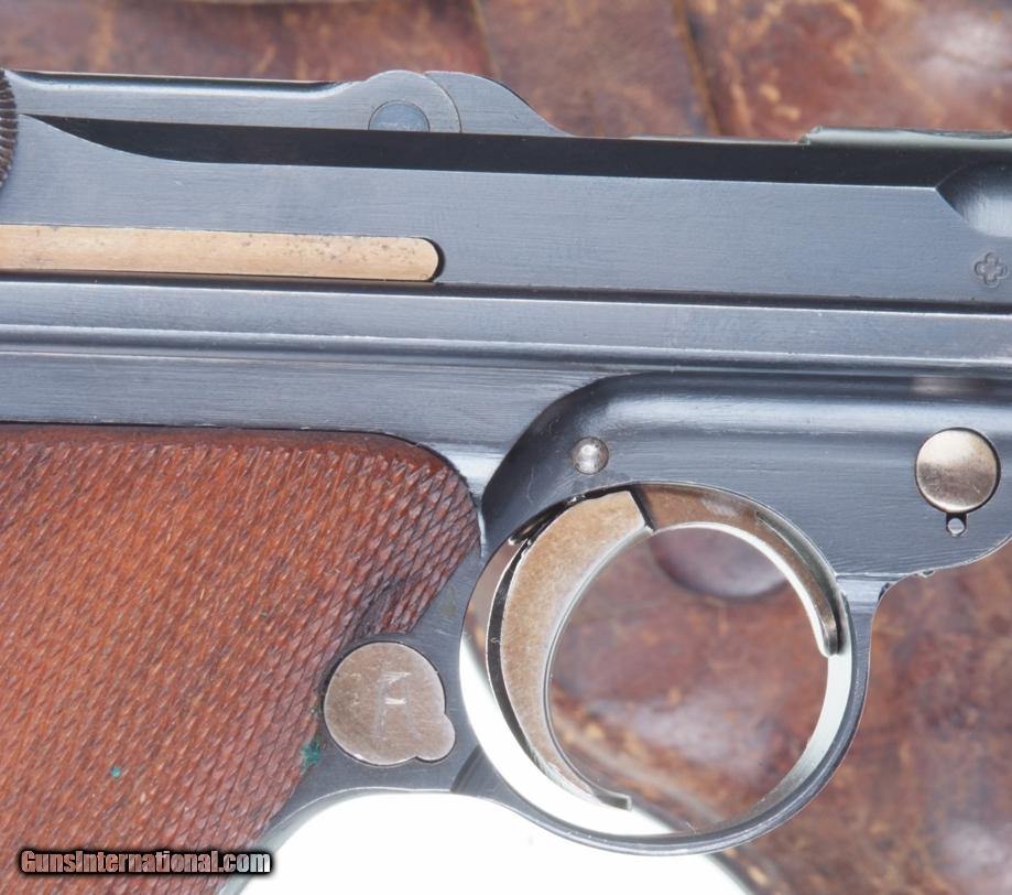 Description: Standard M1906 Cross in Shield military with 4 ¾” barrel having a drift adjustable front sight and fixed V-notch rear sight. Deeply impressed cross in shield over chamber with usual DWM over middle toggle link. Full serial number under barrel and on forward frame. Small Swiss cross acceptance on left side of barrel and left receiver. Numbered small parts are all matching, excepting the grips that have small inspector markings. Release marking “P46” on left side of receiver. Correct magazine with tinned body and disc inserts. Leather holster manufacturer marked and dated “1906” with repaired beltloops and shoulder strap attachments. Synopsis: Very high condition DWM Luger Model 1906 Swiss, Cross in Shield, with holster. Condition: Approximately 97-98% original rust blue with arguable touch up to the back of the receiver, just below the rear toggle link. Minimal thinning of front and backstraps. Comparable condition straw though the right side of the magazine release button personalized with a lightly scribed “A”. Sharply checkered grips with no cracks or losses. Mirror bore. Perfect manual mechanics. Grubby holster with numerous riveted repairs and several areas of stitching loss. An extremely attractive M1906 Cross in Shield whose holster is a throw-away. A HISTORIC INVESTMENT! ~~Insured shipping fee of $65; most packages shipped using FedEx 2nd Day.~~ SOLD Curio/Relic: Yes Manufacturer: DWM Serial Number: 10098 Caliber Info: 7.65mm Luger |