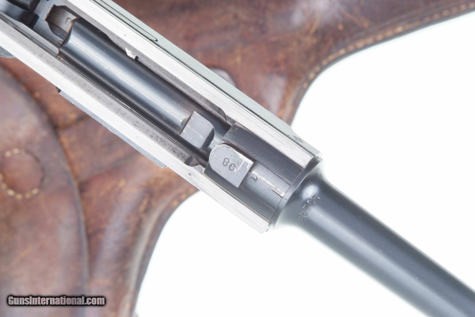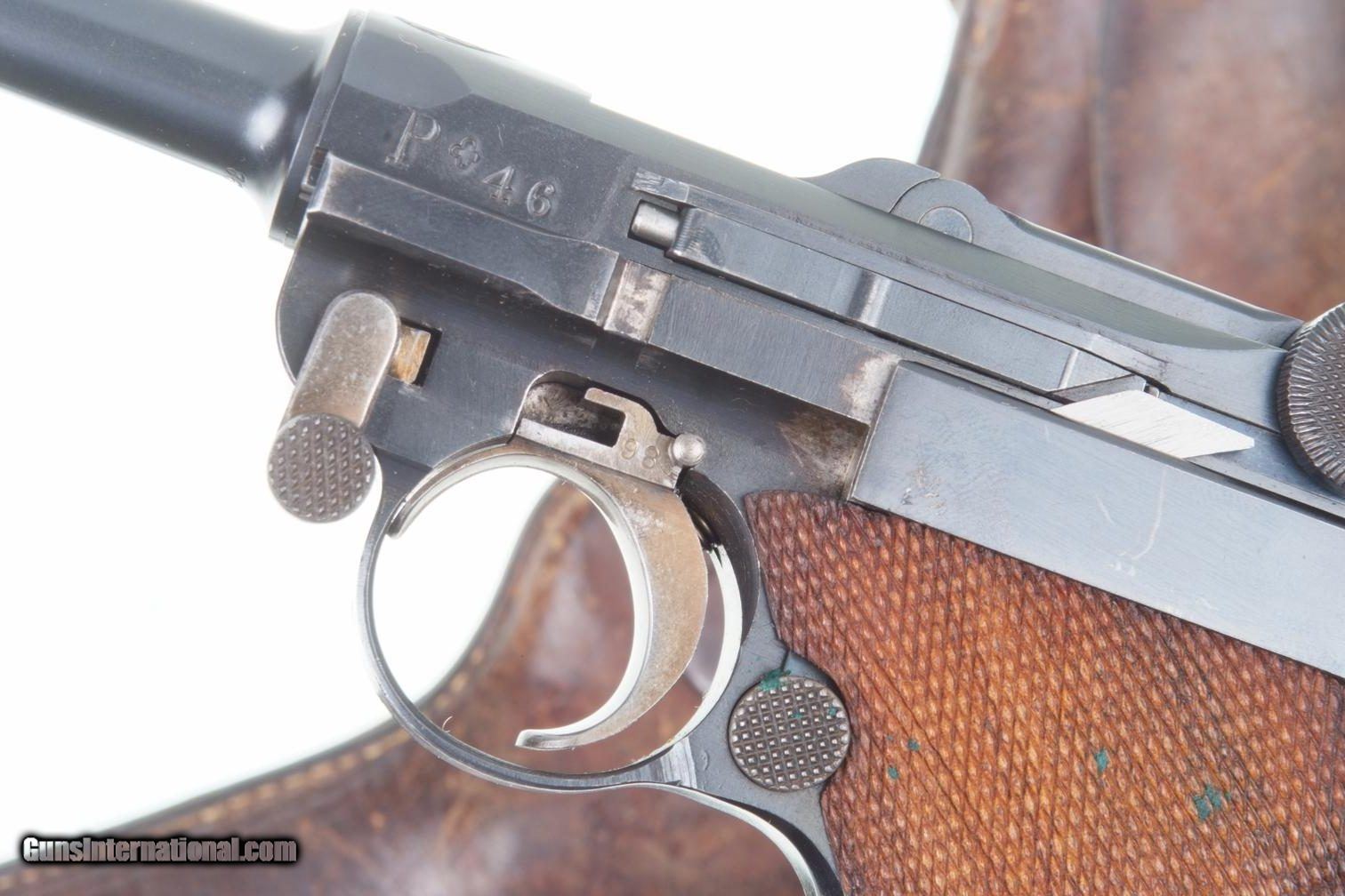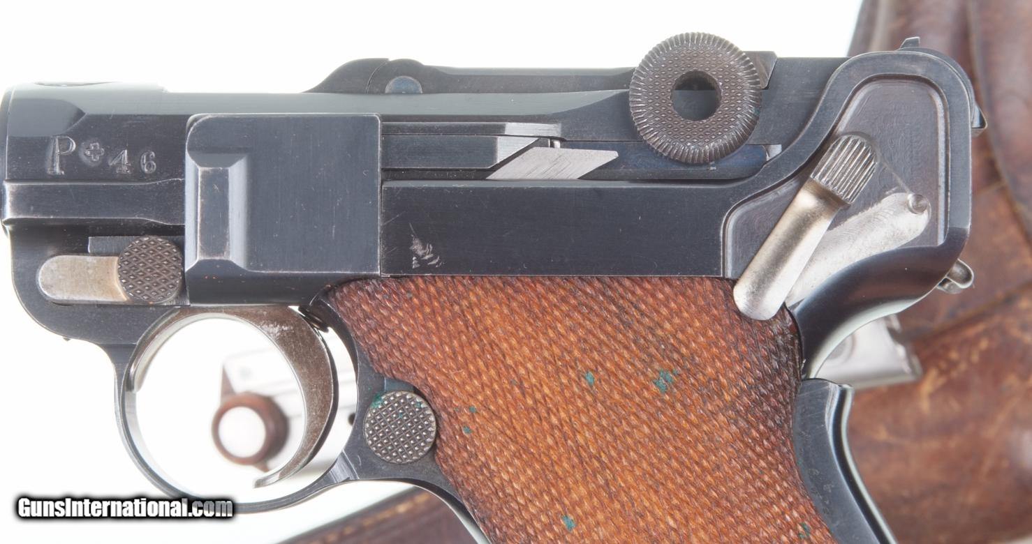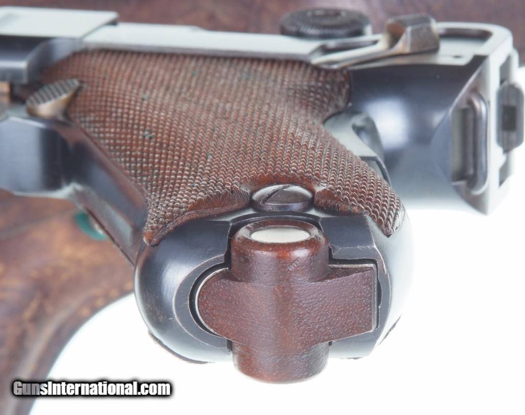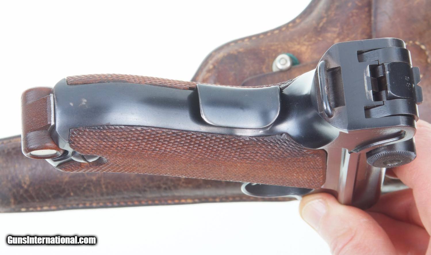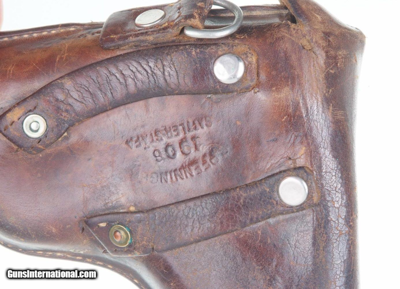 Description: Standard M1906 Cross in Shield military with 4 ¾” barrel having a drift adjustable front sight and fixed V-notch rear sight. Deeply impressed cross in shield over chamber with usual DWM over middle toggle link. Full serial number under barrel and on forward frame. Small Swiss cross acceptance on left side of barrel and left receiver. Numbered small parts are all matching, excepting the grips that have small inspector markings. Release marking “P46” on left side of receiver. Correct magazine with tinned body and disc inserts. Leather holster manufacturer marked and dated “1906” with repaired beltloops and shoulder strap attachments. Synopsis: Very high condition DWM Luger Model 1906 Swiss, Cross in Shield, with holster. Condition: Approximately 97-98% original rust blue with arguable touch up to the back of the receiver, just below the rear toggle link. Minimal thinning of front and backstraps. Comparable condition straw though the right side of the magazine release button personalized with a lightly scribed “A”. Sharply checkered grips with no cracks or losses. Mirror bore. Perfect manual mechanics. Grubby holster with numerous riveted repairs and several areas of stitching loss. An extremely attractive M1906 Cross in Shield whose holster is a throw-away. A HISTORIC INVESTMENT! ~~Insured shipping fee of $65; most packages shipped using FedEx 2nd Day.~~ SOLD Curio/Relic: Yes Manufacturer: DWM Serial Number: 10098 Caliber Info: 7.65mm Luger |
