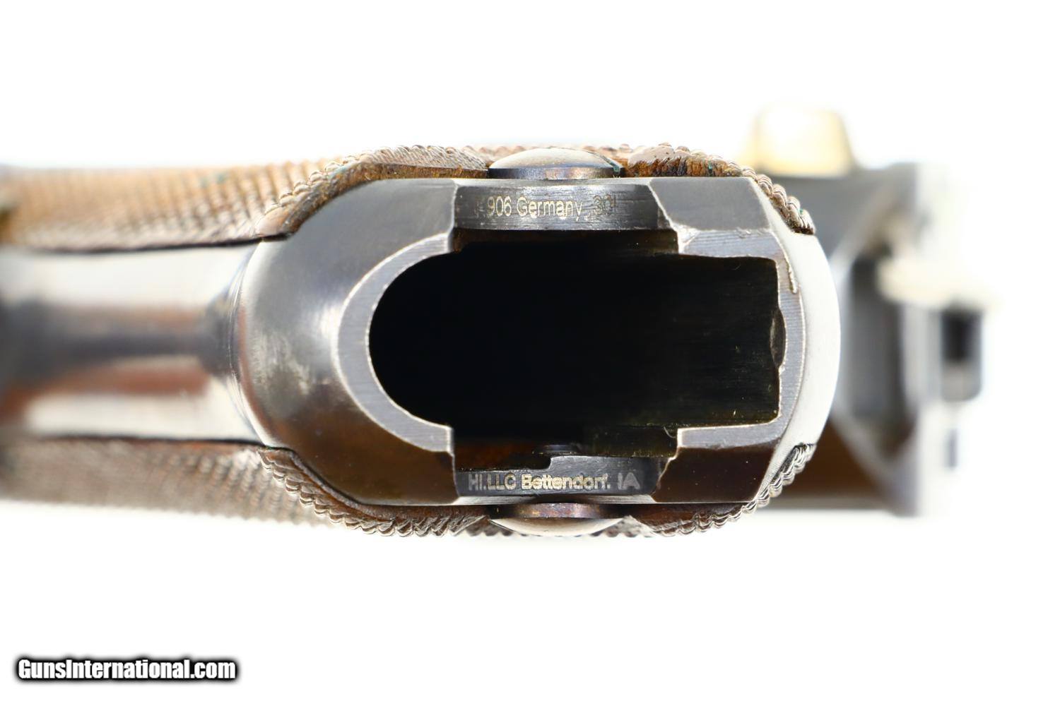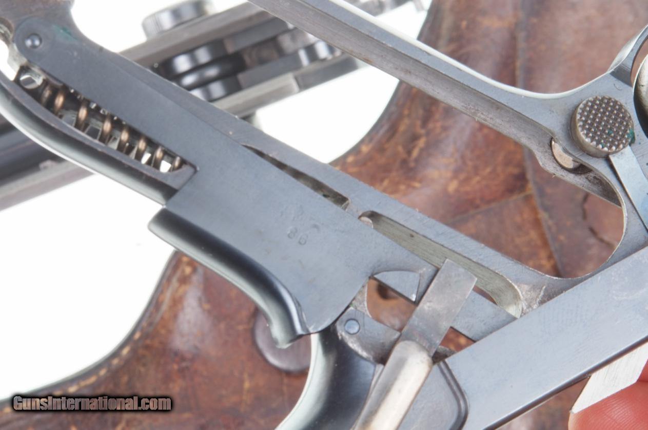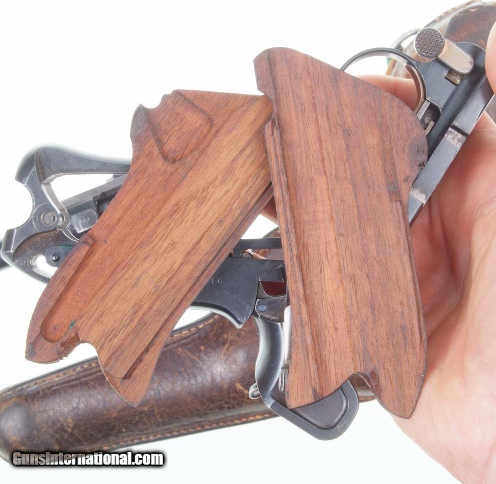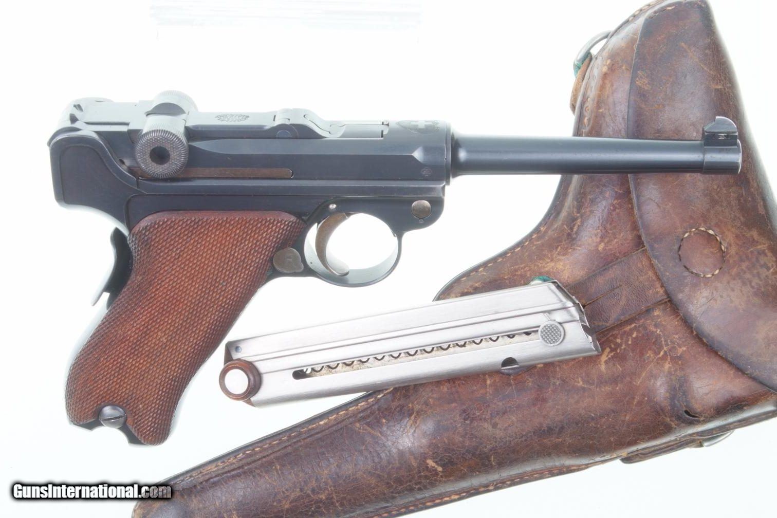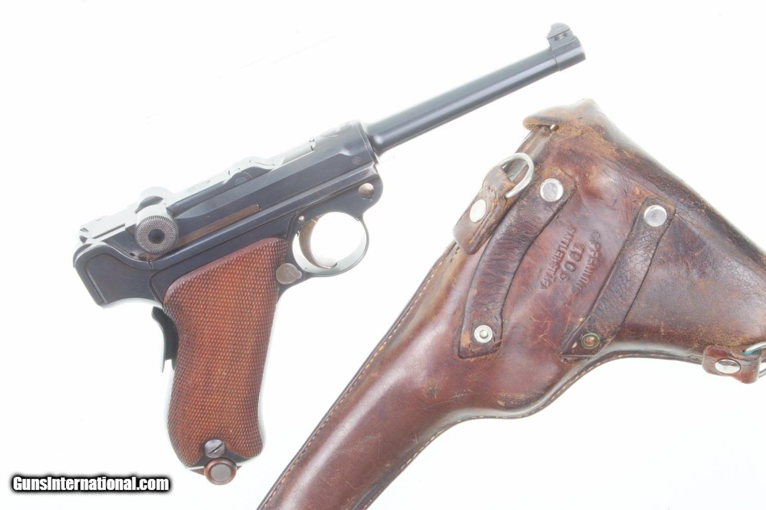 Description: Standard M1906 Cross in Shield military with 4 ¾” barrel having a drift adjustable front sight and fixed V-notch rear sight. Deeply impressed cross in shield over chamber with usual DWM over middle toggle link. Full serial number under barrel and on forward frame. Small Swiss cross acceptance on left side of barrel and left receiver. Numbered small parts are all matching, excepting the grips that have small inspector markings. Release marking “P46” on left side of receiver. Correct magazine with tinned body and disc inserts. Leather holster manufacturer marked and dated “1906” with repaired beltloops and shoulder strap attachments. Synopsis: Very high condition DWM Luger Model 1906 Swiss, Cross in Shield, with holster. Condition: Approximately 97-98% original rust blue with arguable touch up to the back of the receiver, just below the rear toggle link. Minimal thinning of front and backstraps. Comparable condition straw though the right side of the magazine release button personalized with a lightly scribed “A”. Sharply checkered grips with no cracks or losses. Mirror bore. Perfect manual mechanics. Grubby holster with numerous riveted repairs and several areas of stitching loss. An extremely attractive M1906 Cross in Shield whose holster is a throw-away. A HISTORIC INVESTMENT! ~~Insured shipping fee of $65; most packages shipped using FedEx 2nd Day.~~ SOLD Curio/Relic: Yes Manufacturer: DWM Serial Number: 10098 Caliber Info: 7.65mm Luger |