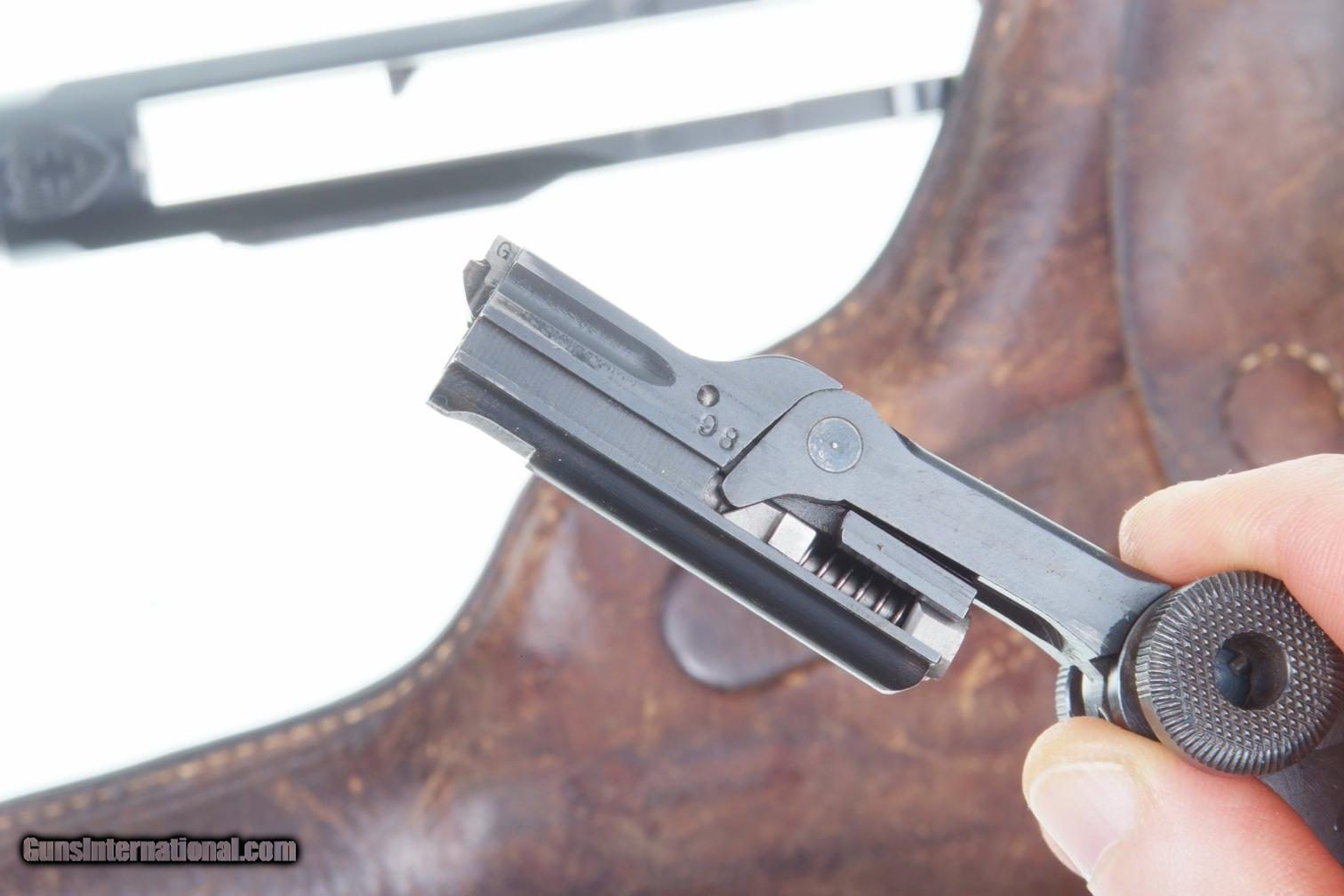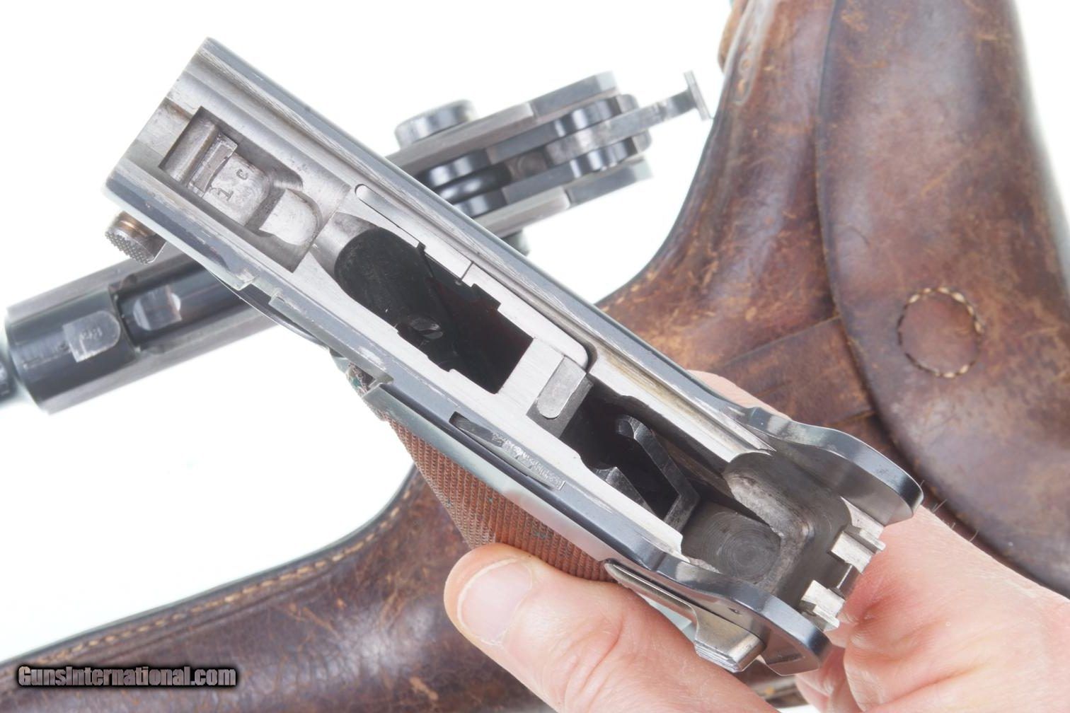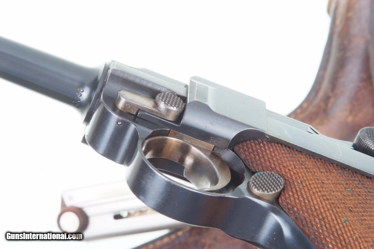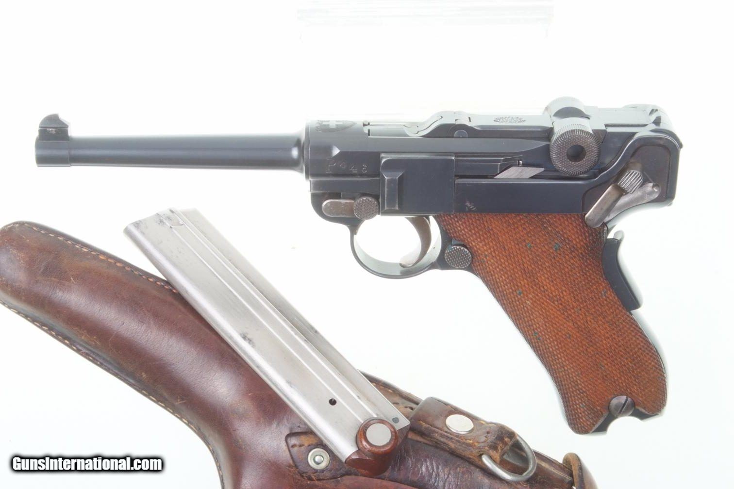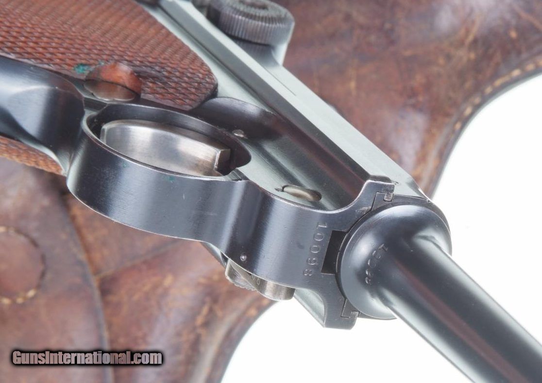 Description: Standard M1906 Cross in Shield military with 4 ¾” barrel having a drift adjustable front sight and fixed V-notch rear sight. Deeply impressed cross in shield over chamber with usual DWM over middle toggle link. Full serial number under barrel and on forward frame. Small Swiss cross acceptance on left side of barrel and left receiver. Numbered small parts are all matching, excepting the grips that have small inspector markings. Release marking “P46” on left side of receiver. Correct magazine with tinned body and disc inserts. Leather holster manufacturer marked and dated “1906” with repaired beltloops and shoulder strap attachments. Synopsis: Very high condition DWM Luger Model 1906 Swiss, Cross in Shield, with holster. Condition: Approximately 97-98% original rust blue with arguable touch up to the back of the receiver, just below the rear toggle link. Minimal thinning of front and backstraps. Comparable condition straw though the right side of the magazine release button personalized with a lightly scribed “A”. Sharply checkered grips with no cracks or losses. Mirror bore. Perfect manual mechanics. Grubby holster with numerous riveted repairs and several areas of stitching loss. An extremely attractive M1906 Cross in Shield whose holster is a throw-away. A HISTORIC INVESTMENT! ~~Insured shipping fee of $65; most packages shipped using FedEx 2nd Day.~~ SOLD Curio/Relic: Yes Manufacturer: DWM Serial Number: 10098 Caliber Info: 7.65mm Luger |