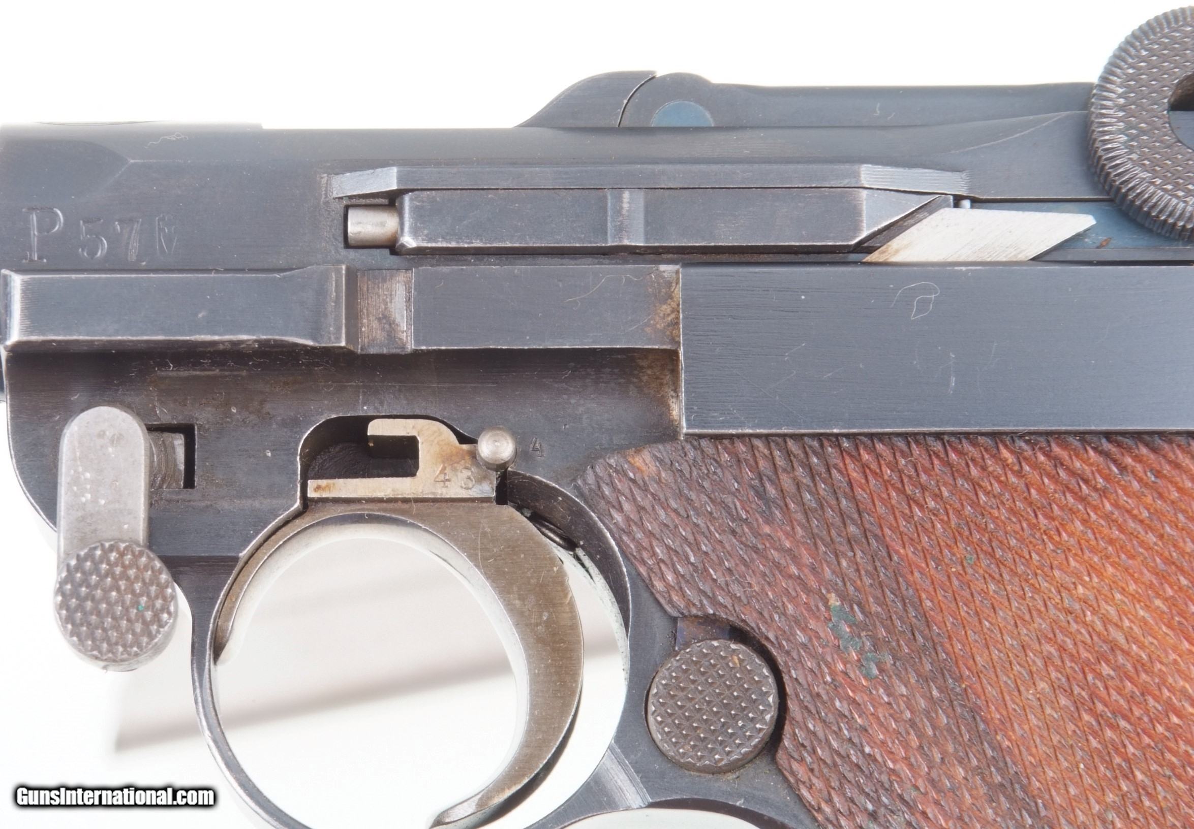 Standard M1906 Cross in Shield military with 4 ¾” barrel having a drift adjustable front sight and fixed V-notch rear sight. Deeply impressed cross in shield over chamber with usual DWM over middle toggle link. Full serial number under barrel and on forward frame. Numbered small parts are all matching, including the grips, each with an impressed “3”. Magazine with tinned body and walnut base marked with a “2”. Pistol was decommissioned in 1957 as refected by “P57” marked on the left side of the receiver.