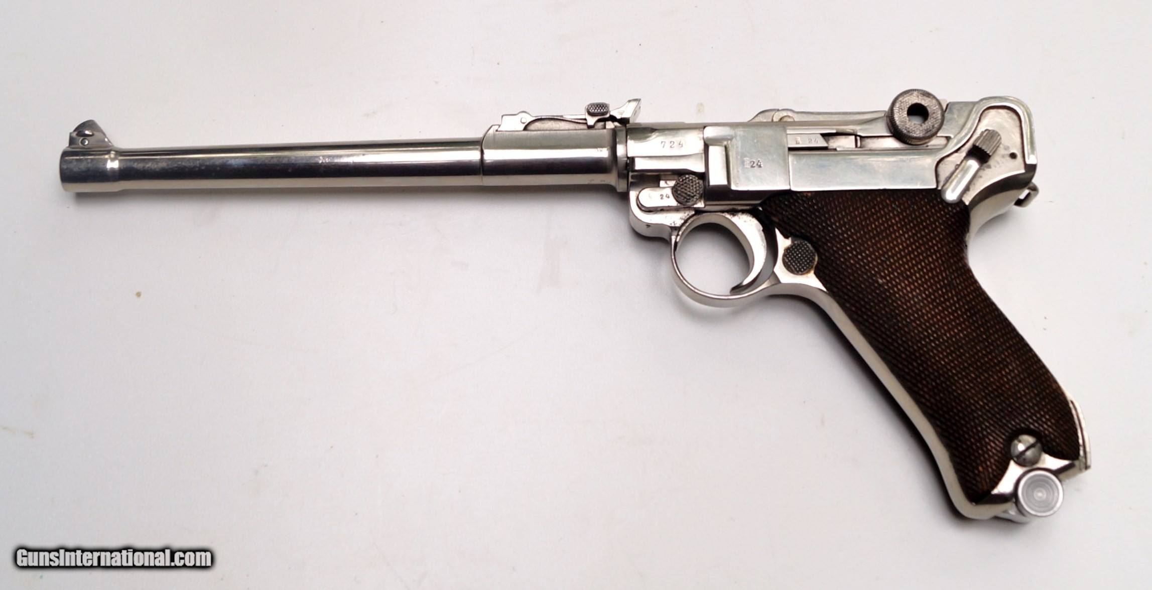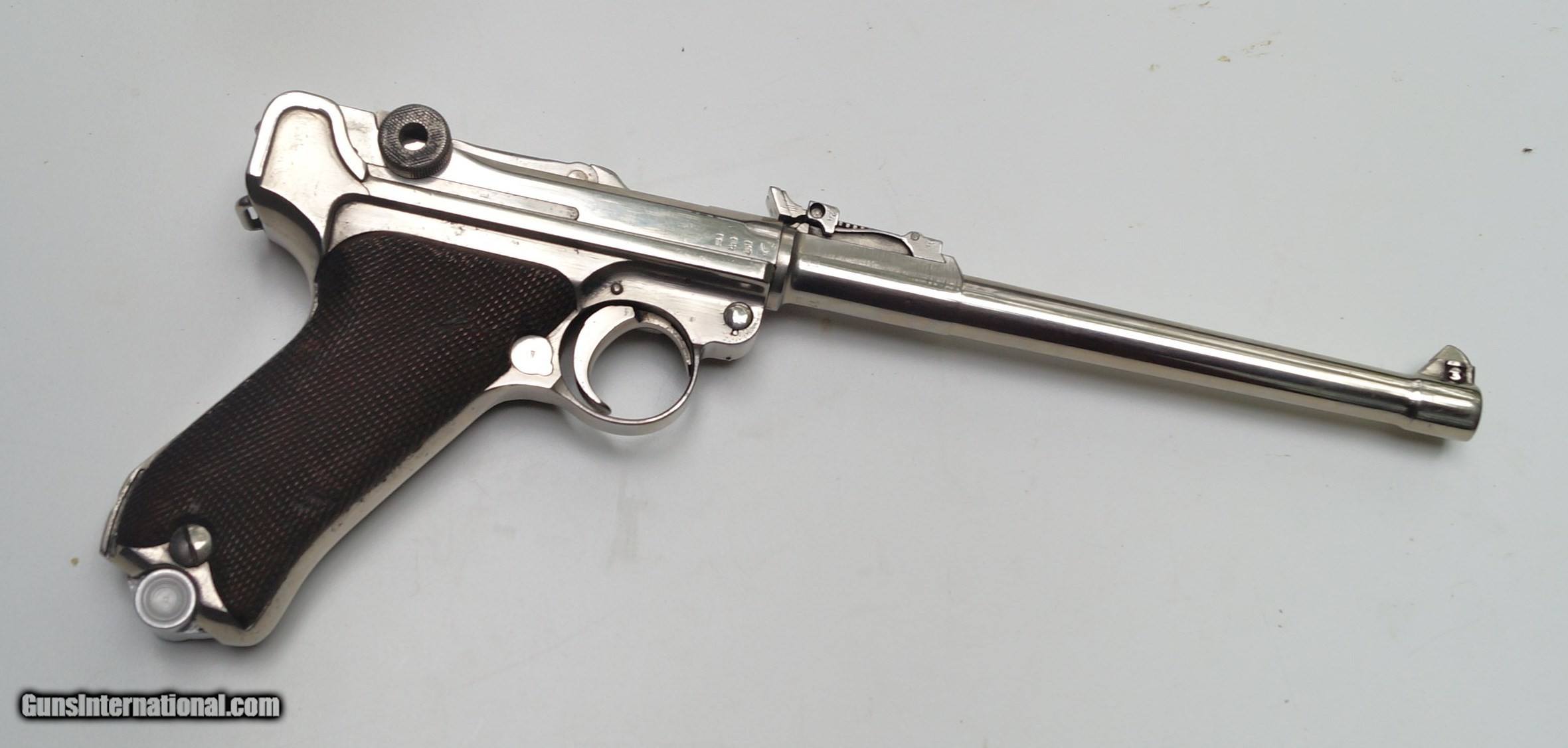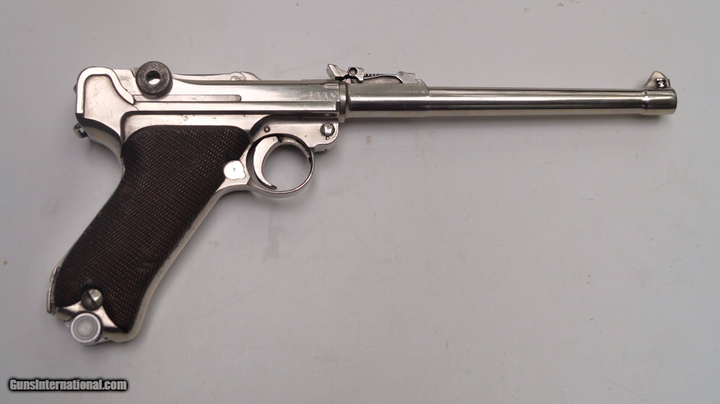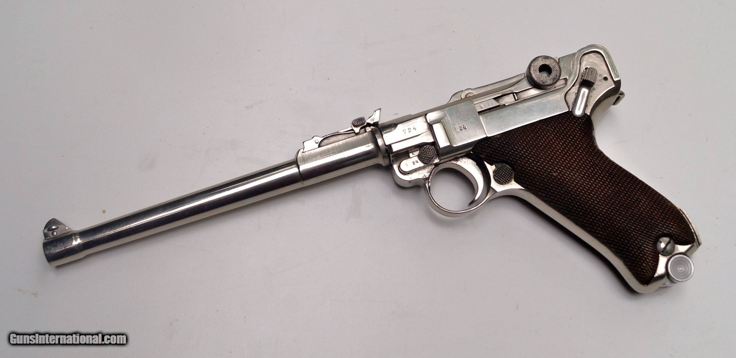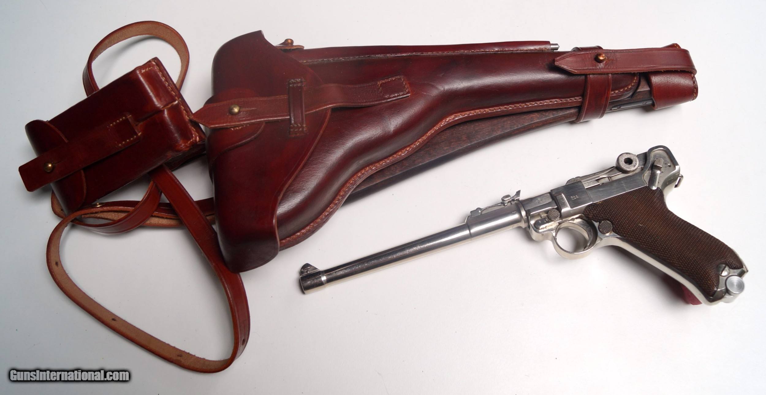 Description: THIS IS A 1914 ERFURT MILITARY ARTILLERY GERMAN LUGER RIG - NICKEL FINISH, 9MM. THE LUGER IS IN VERY GOOD CONDITION. IT HAS BEEN PROFESSIONALLY RESTORED WITH A NICKEL FINISH (ALL PROOF MARKINGS ARE VIVID & NONE LOST), VERY GOOD BORE AND GRIPS, MECHANICALLY CORRECT (THE GUN WILL SHOOT). THE RIG CONSISTS OF THE LUGER, 1 ARTILLERY HOSTER WITH WOODEN STOCK (THAT FITS AND LOCKS ONTO THE GUN, CARRING HARNESS WITH MAGAZINE CARTRIDGE CASE, CLEANING ROD AND LOADING TOOL. THEY DON'T COME BETTER THAN THIS. SOLD Curio/Relic: Yes |