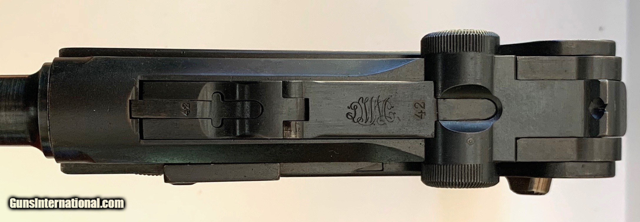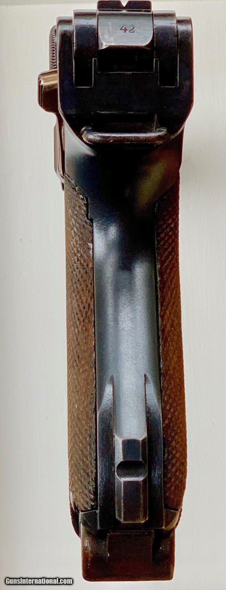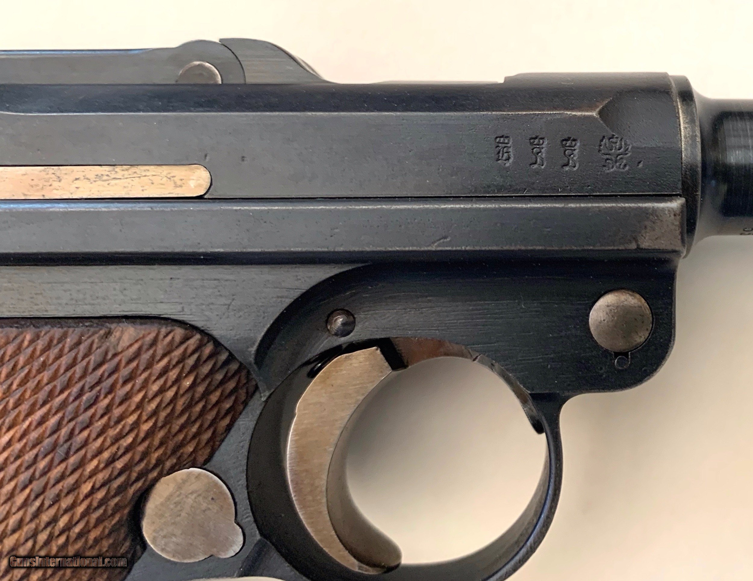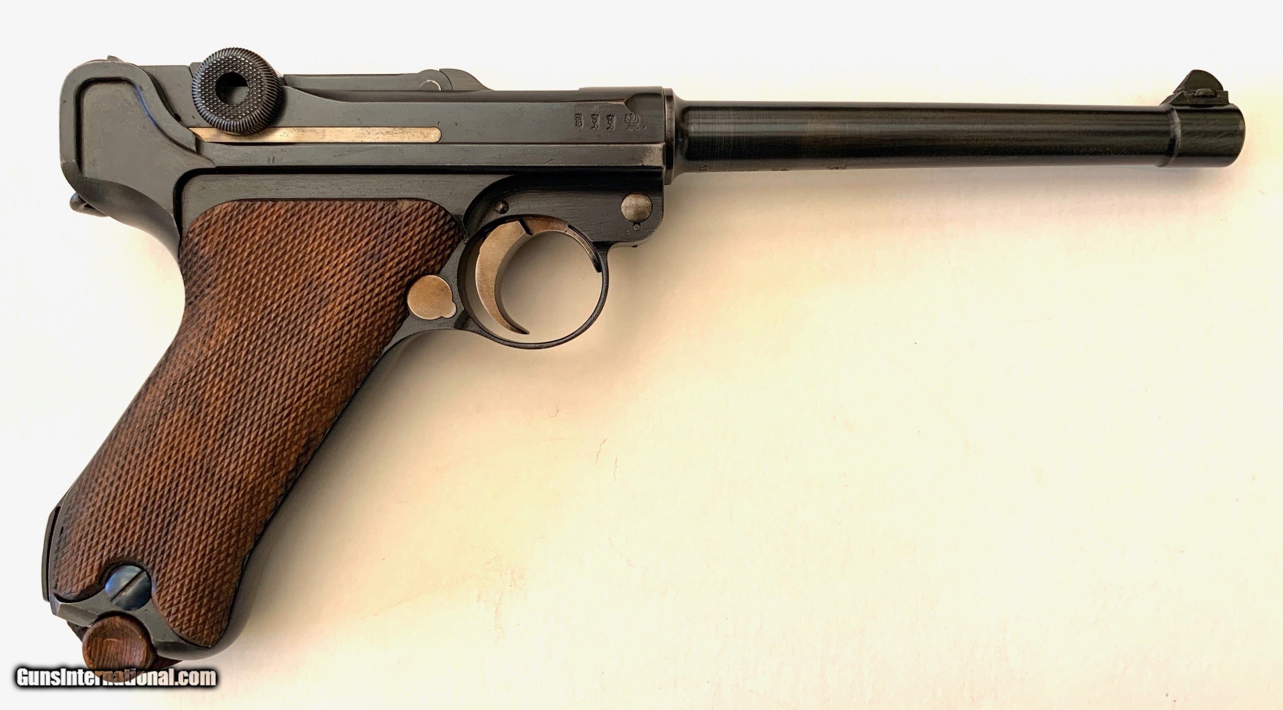 Description: Excellent condition DWM WWI Imperial German military pistol. Rare bright shiny 6 inch 7.65mm parabellum barrel. Original factory blue finish, nice grips and all matching serial numbers. Following WWI sold to commercial market. No importers markings. Money orders or bank checks only. SOLD Curio/Relic: Yes |