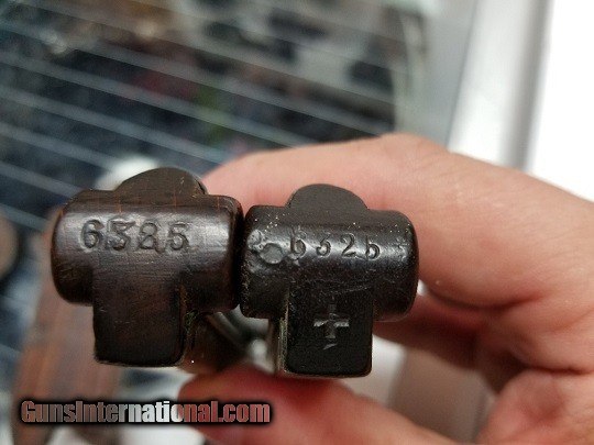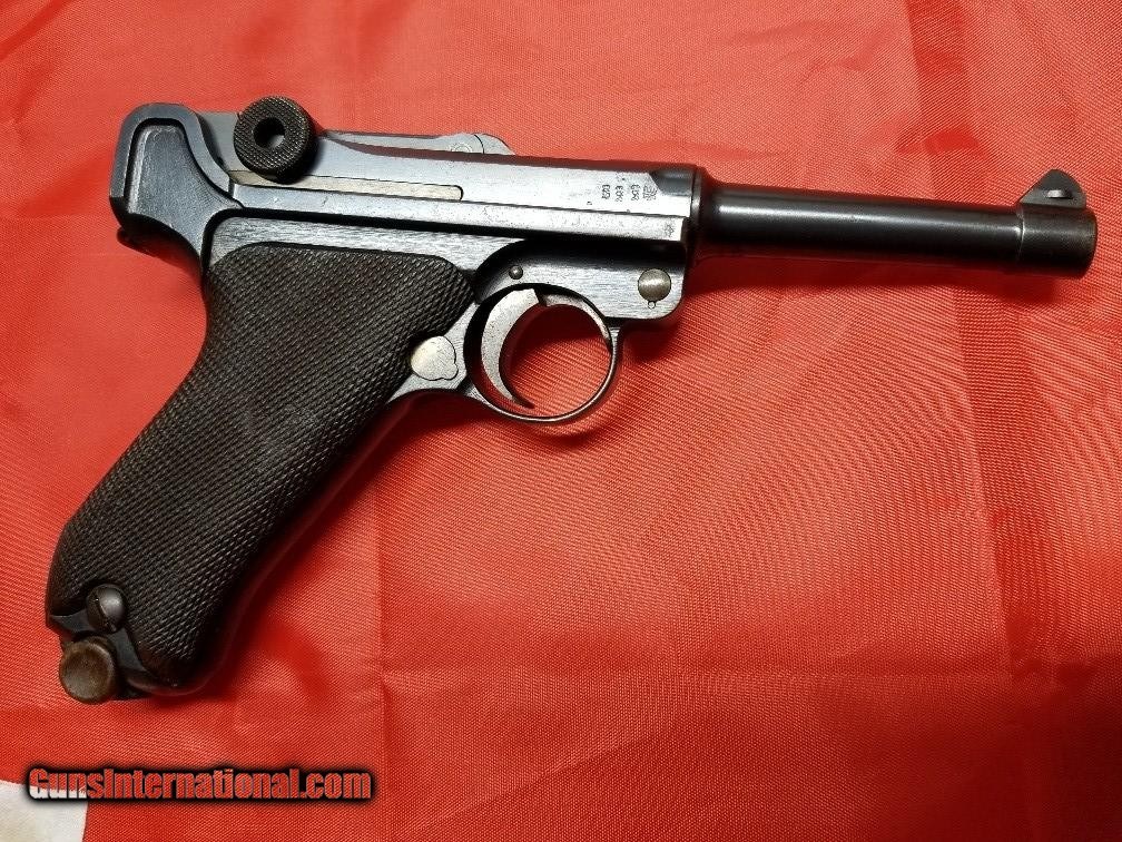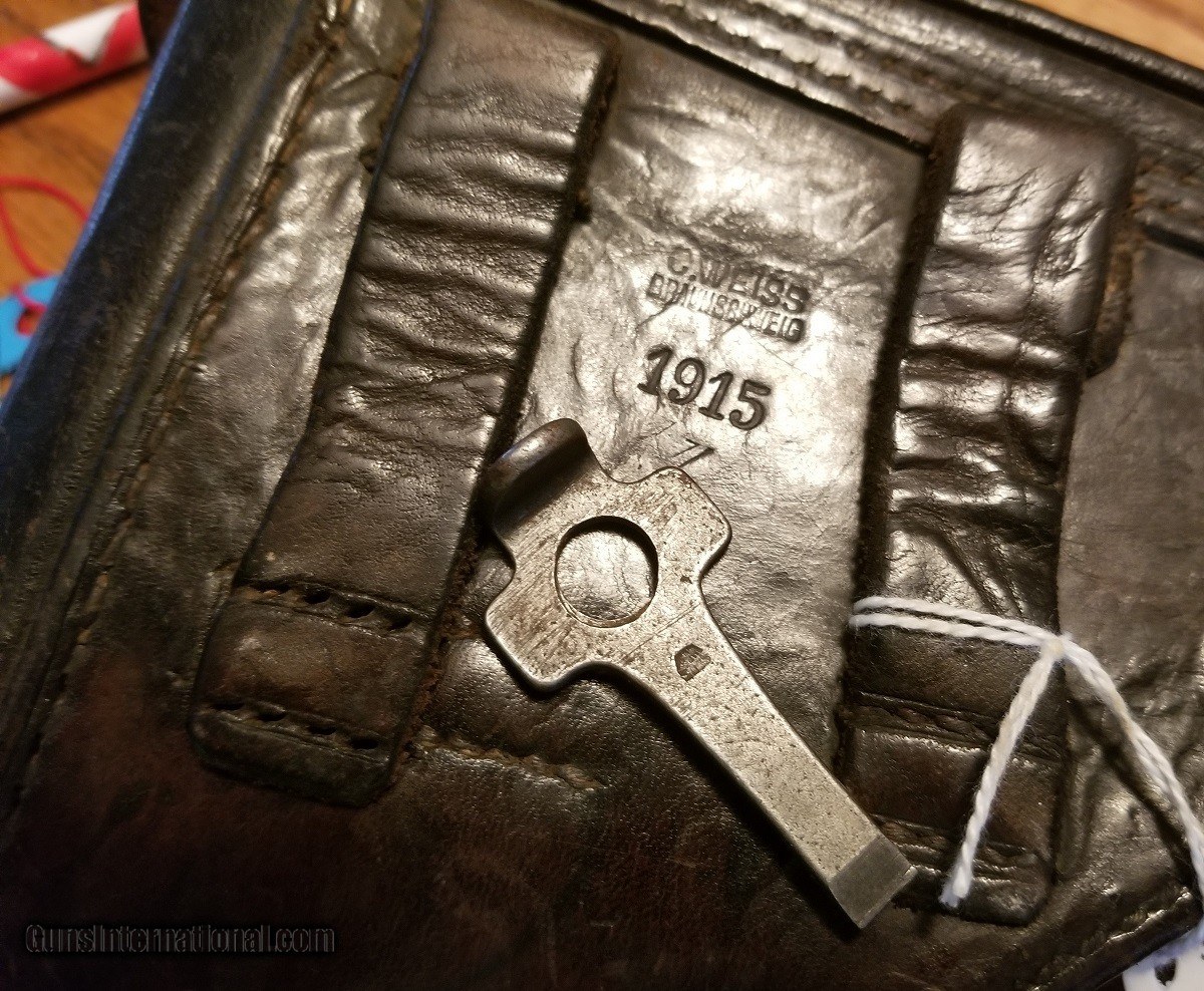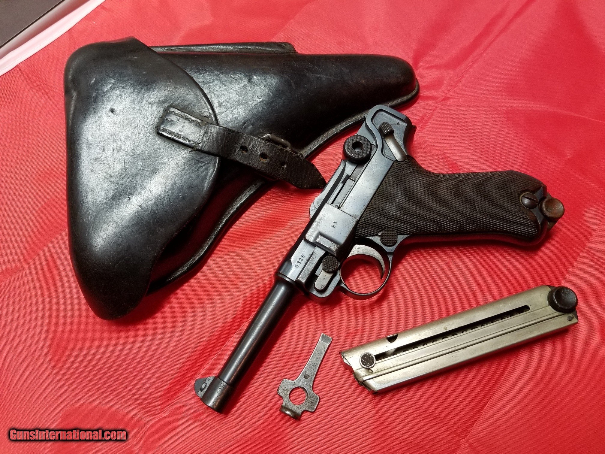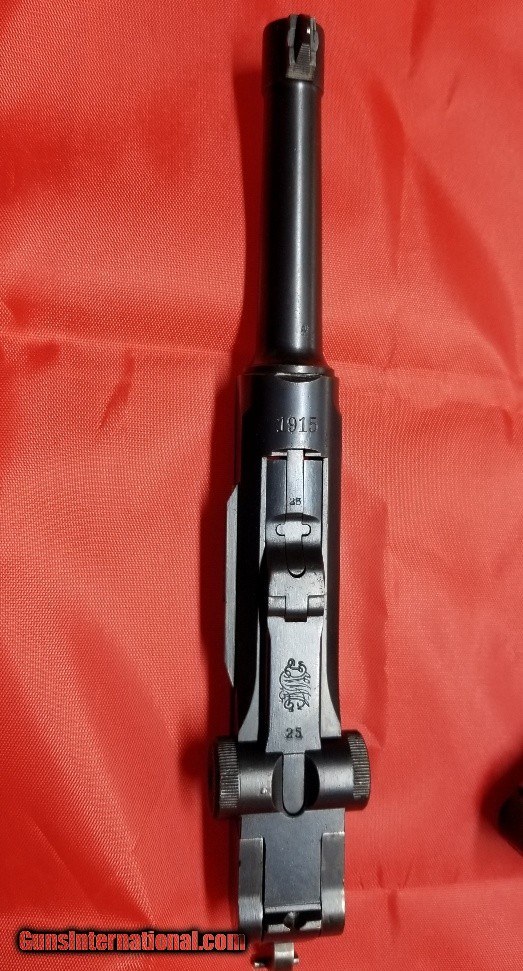 Description: *** Sale Pending *** 1915 DWM Luger with original finish with normal service wear. All numbers matching, including original wood grips and two wood base magazines (see photos). No import marks. Complete with a 1915 dated holster and the correct combination tool. The holster maker is C. Weiss of Brownschweig and is also marked "B.A. IV" on the inside of the holster flap (IV Army Corps, German Imperial Army). Holster is in good condition with some loose stitching on one of the belt loops. Overall a very nice, original WWI rig. C&R eligible. $75 shipping. SOLD Curio/Relic: Yes Manufacturer: DWM Model: Luger Caliber Info: 9mm |
