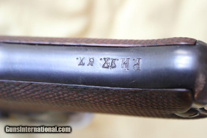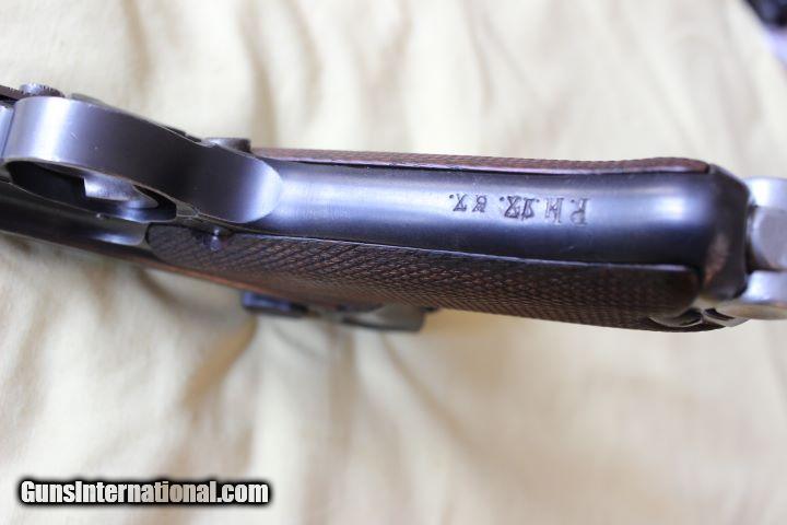 Description: DWM Luger 1916 with stock lug and what appears to be an arsenal replaced barrel, The barrel has the correct serial number and an Imperial eagle and another proof above it that appears to be a TP (technical police) The barrel has a dimple and flat where it meets the frame on top. It also has XXX out WWI unit markings.R.H.1.7.67. SOLD Curio/Relic: Yes |