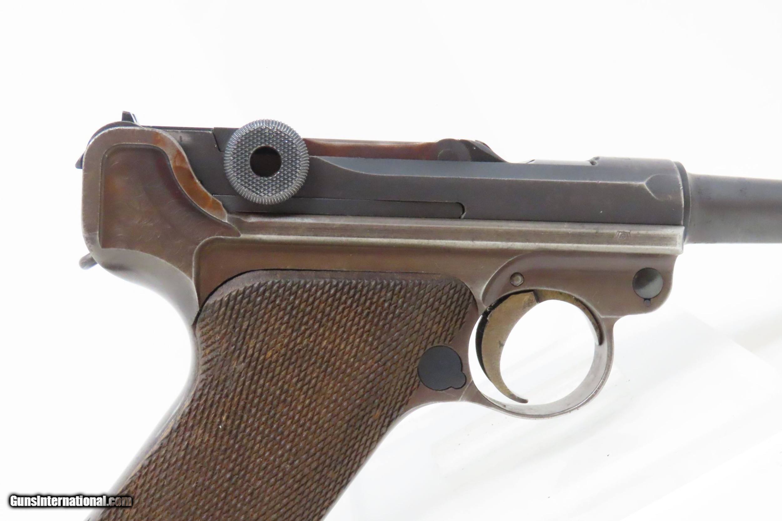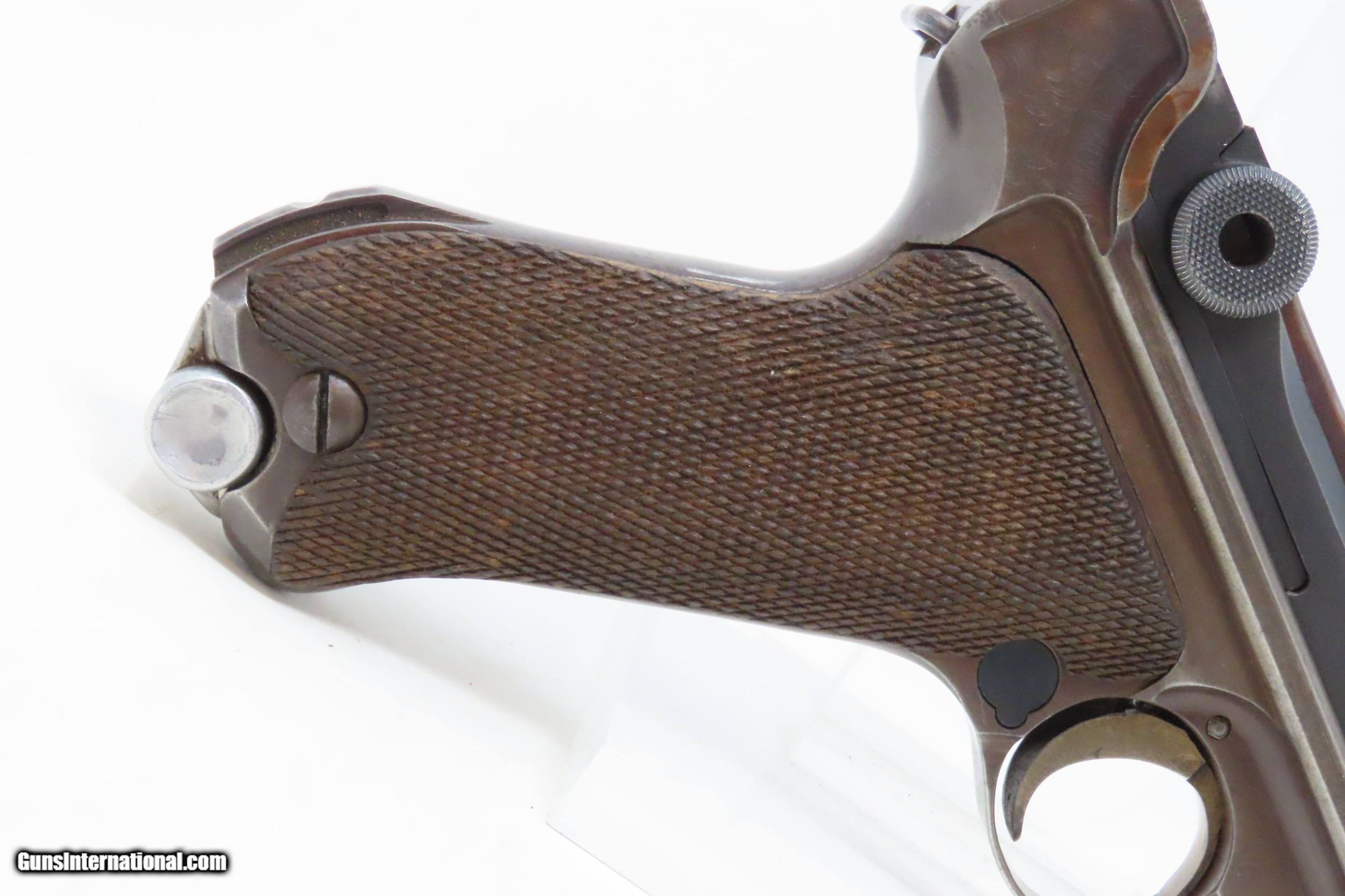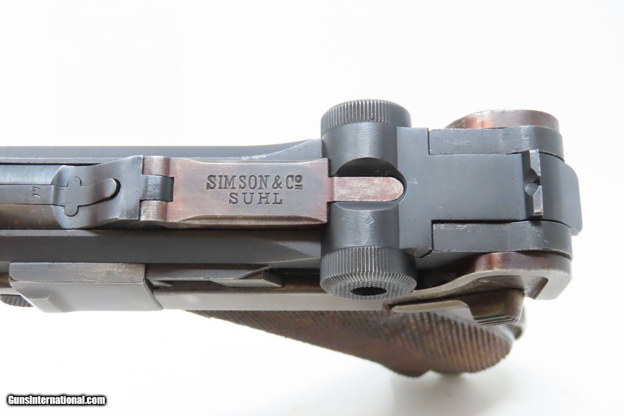 Description: 1917 Dated WORLD WAR I Era Semi-Automatic 9x19mm GERMAN LUGER C&R Pistol SIMSON & CO. Toggle with “CROWN/M” IMPERIAL NAVY Proofs Here we present a C&R World War I Era P.08 Luger Pistol, made circa 1917 likely at the Erfurt Arsenal in Erfurt, Germany. The “Crown over M” proof mark is the proof for the Imperial Navy on the barrel extension. The top of the toggle is marked “Simson & Co./Suhl”, though this gun was not made by Simson. Simson & Company began production of luger pistols in 1925 and continued until 1933 when the Nazi party took control of their factory. The overall condition is good. Bright bore. Both grips are in good shape with sharp checkering and an expected amount of handling. Clear markings. The action is strong. Portions of the toggle are refinished/replacement parts. “1917” dated. This firearm is classified as a Curio & Relic. Barrel is 4 inches. Caliber: 9mm Luger (Parabellum) Overall condition as seen in photos. Very Fast. Very Safe. FREE SHIPPING. Will need to be sent to your local FFL or C&R licensee. This firearm is classified as a Curio & Relic. Guaranteed AUTHENTIC & Includes CERTIFICATE OF AUTHENTICITY. ancestryguns $2200 #217946 SOLD Curio/Relic: Yes |