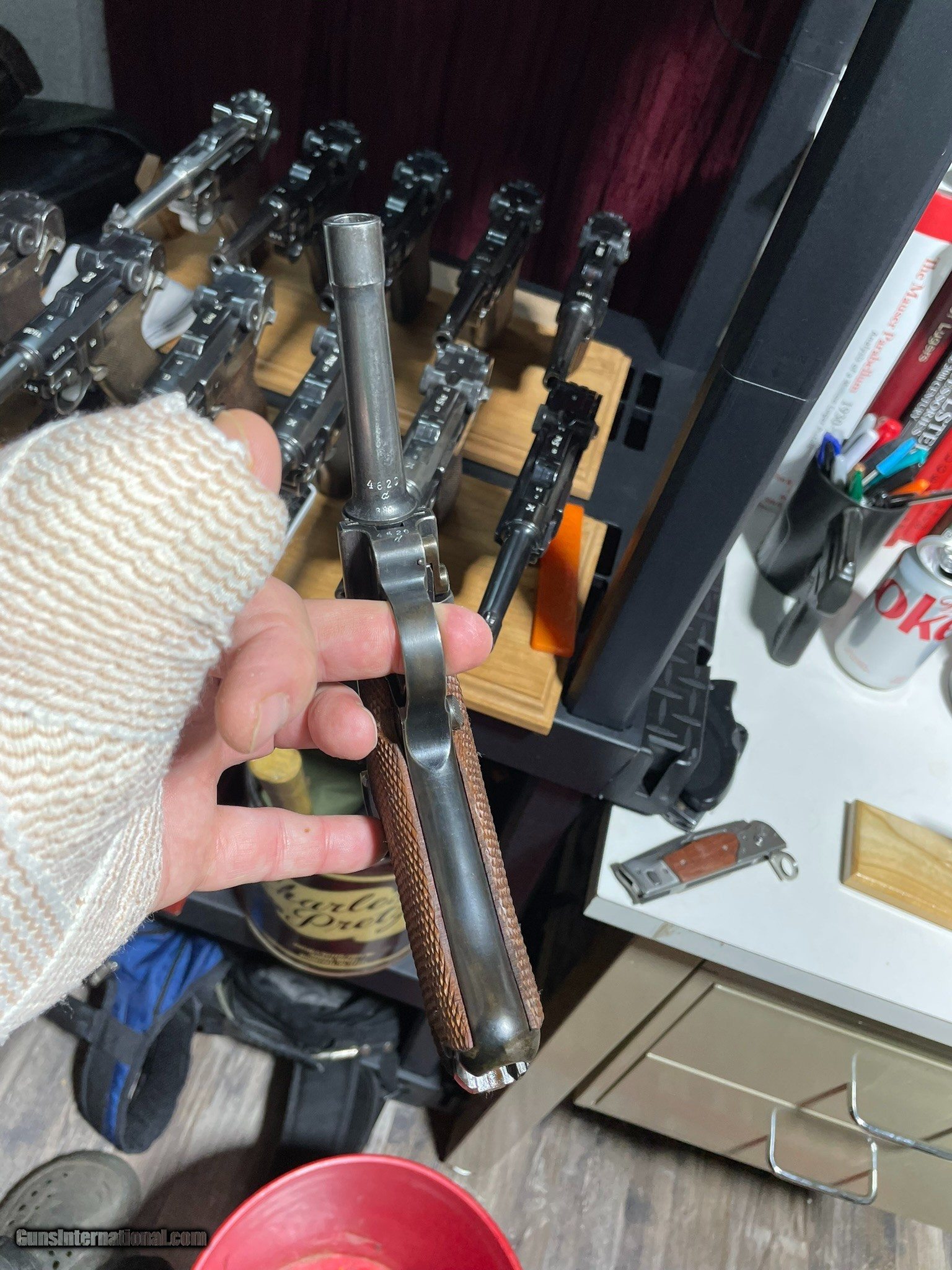 Description: All matching except for a blank toggle pin. Looks to have been touched up on back strap and maybe front strap. Comes with 1 numbered wooden mag that is NOT matching to the gun. Looks like replacement grips, but they fit well. Surgery forces sale. SOLD Curio/Relic: Yes Handgun Caliber: 9x19mm Parabellum (9mm Luger, 9x19mm NATO) Manufacturer: dwm |