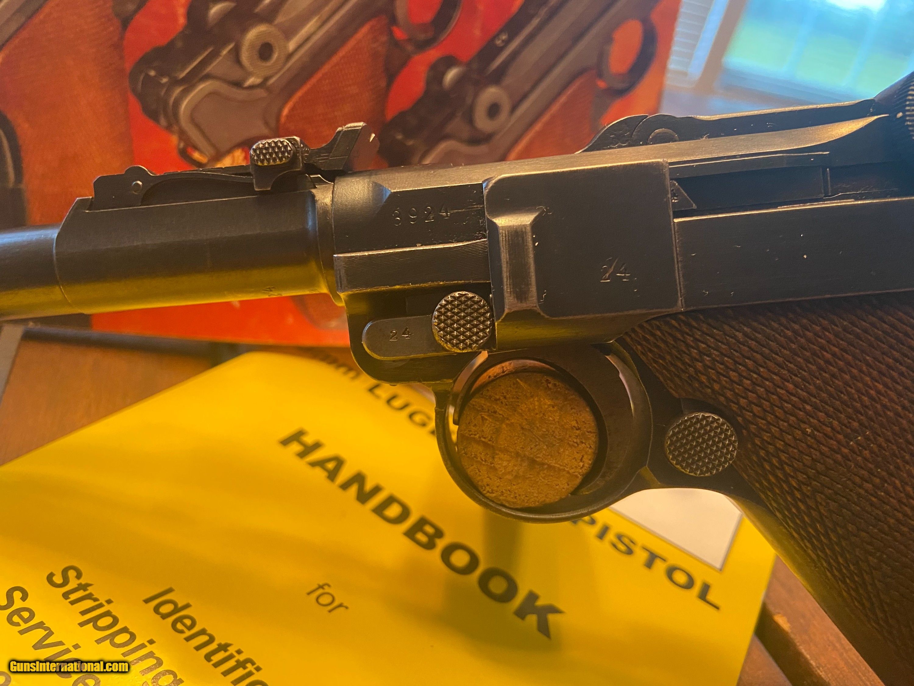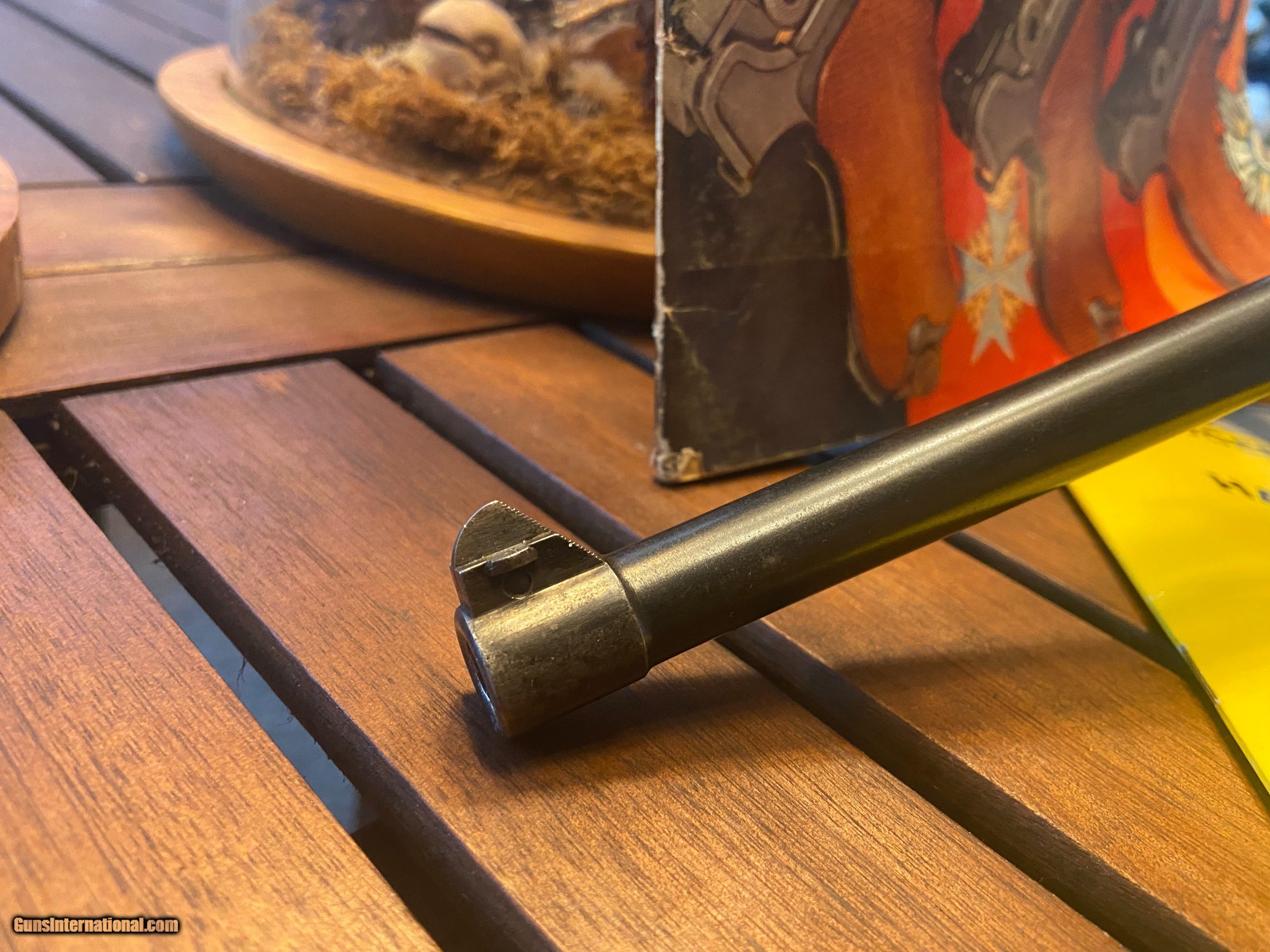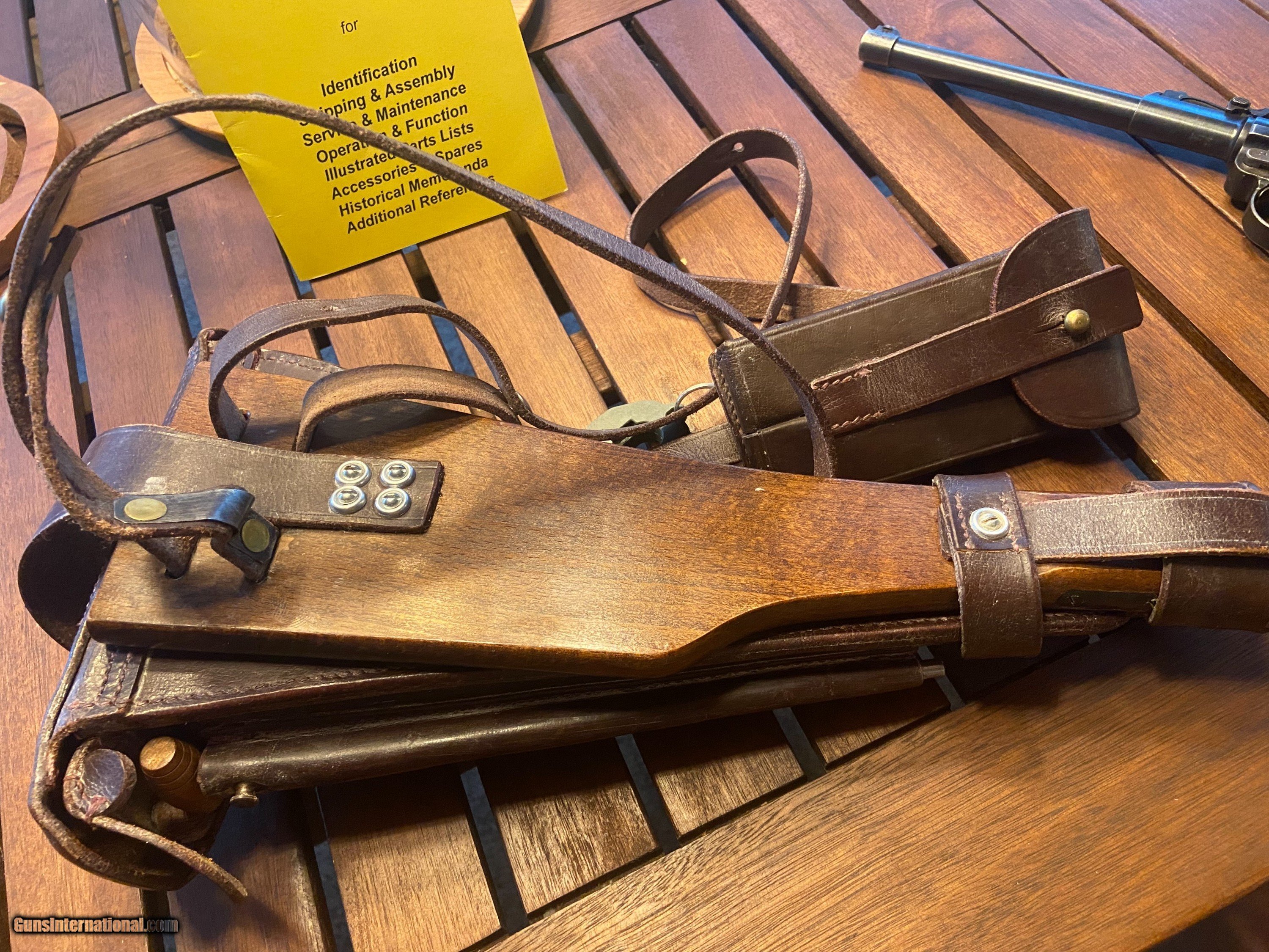 Description: 1917 ARTILLERY LUGER DWM Model 1914 Pistol Stock & Holster Rig LATE WORLD WAR I 8-Inch Barreled Pistol w Detachable Shoulder Stock The Luger is certainly one of the most iconic firearms in history, made so by its association with Germany during both World Wars. The top of the chamber is Great War dated “1917”. The top of the toggle is marked “DWM”. The right side of the frame bears German military acceptance marks. The adoption of the Lange Pistole, aka the “Artillery Luger”, was authorized by the Kaiser on July 2, 1913. This P08 variation was equipped with a 200 mm (7.9 in) barrel, an 8-position tangent rear sight (calibrated to 800 meters (870 yd)) and a board-type shoulder stock with an attached leather holster. In the event of close combat, the pistol was intended to be used as a carbine with the shoulder stock attached to a lug mounted on the heel of the pistol frame. When set for long range use the rear sight element visibly moves to the left to compensate for spin drift. This pistol was intended for use by German artillery units who could not be encumbered by the long and heavy K.98 rifle. The overall condition is fine. The action is strong and tight. The bore is mirror bright. All numbers match. Both grips have retained sharp checkering with a small chip on the left grip in upper corner adjacent to safety. This example showcases a fine adjustment front sight blade and tangent rear sight. The shoulder stock, artillery pattern holster, takedown tool, and bore rod are all in very nice shape. In Fine original condition. SOLD Handgun Caliber: 9x19mm Parabellum (9mm Luger, 9x19mm NATO) Manufacturer: LUGER Model: P08 ARTILLERY Barrel Length: 8 Condition: EXCELLENT Metal Condition: EXCELLENT |
