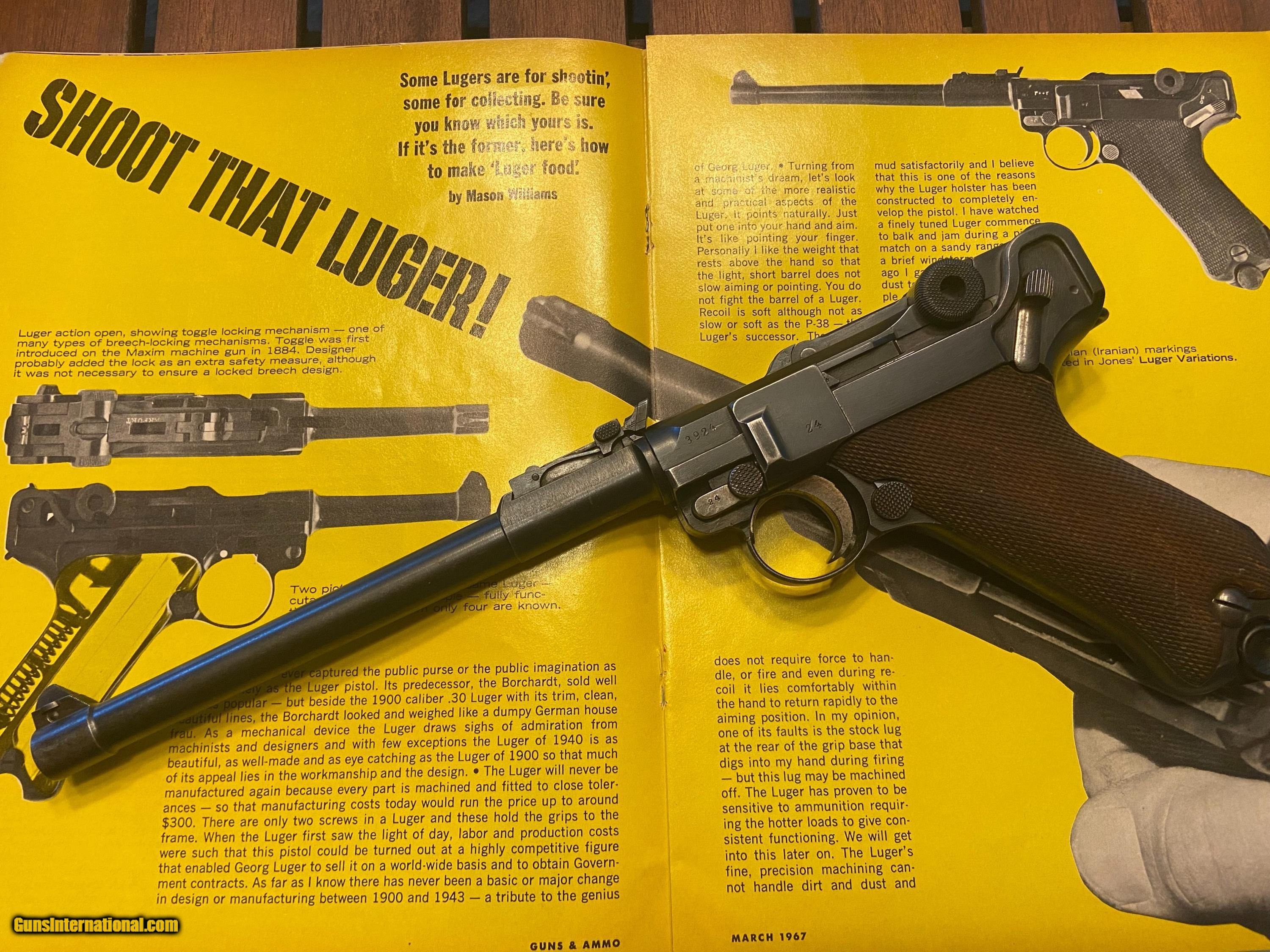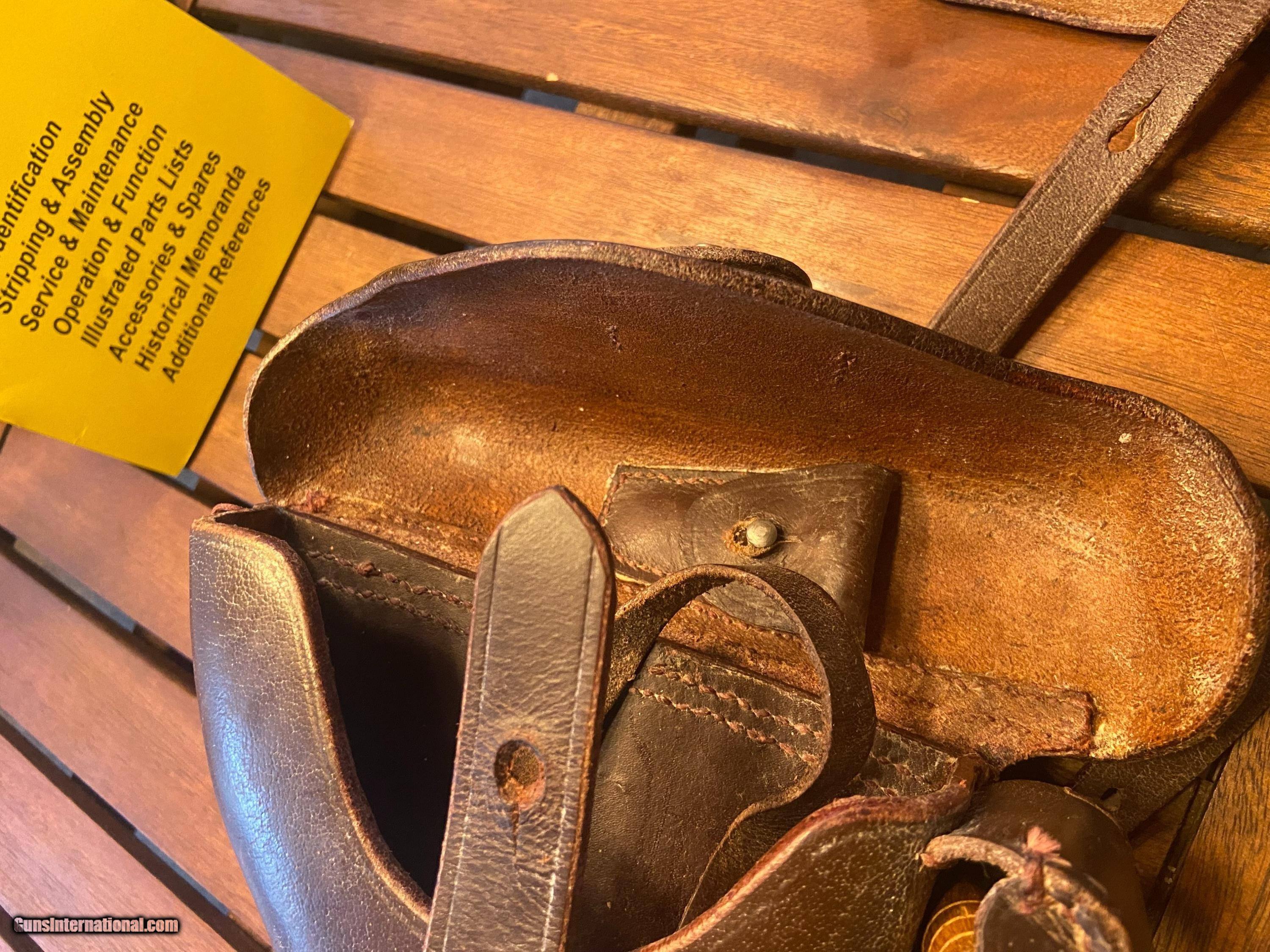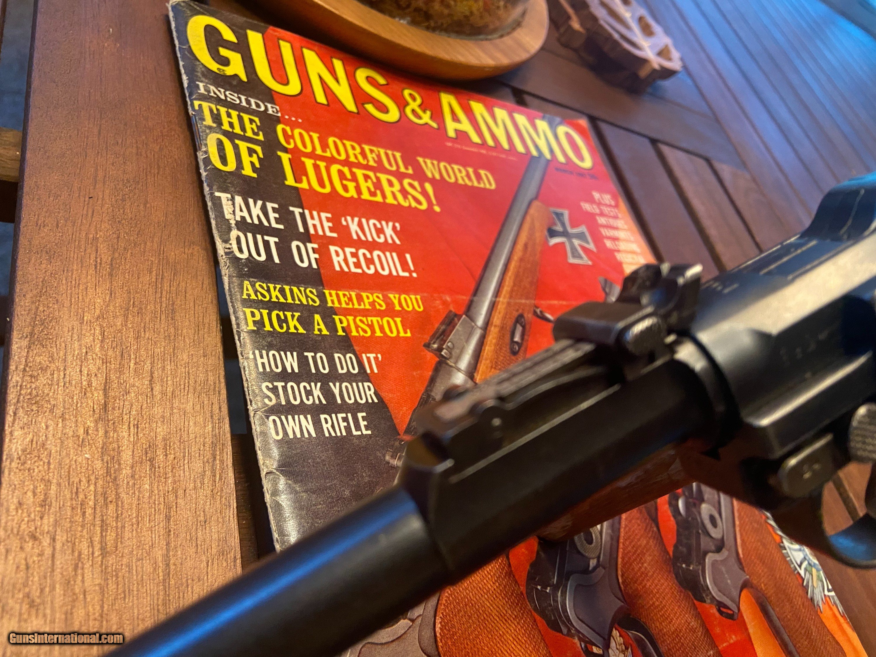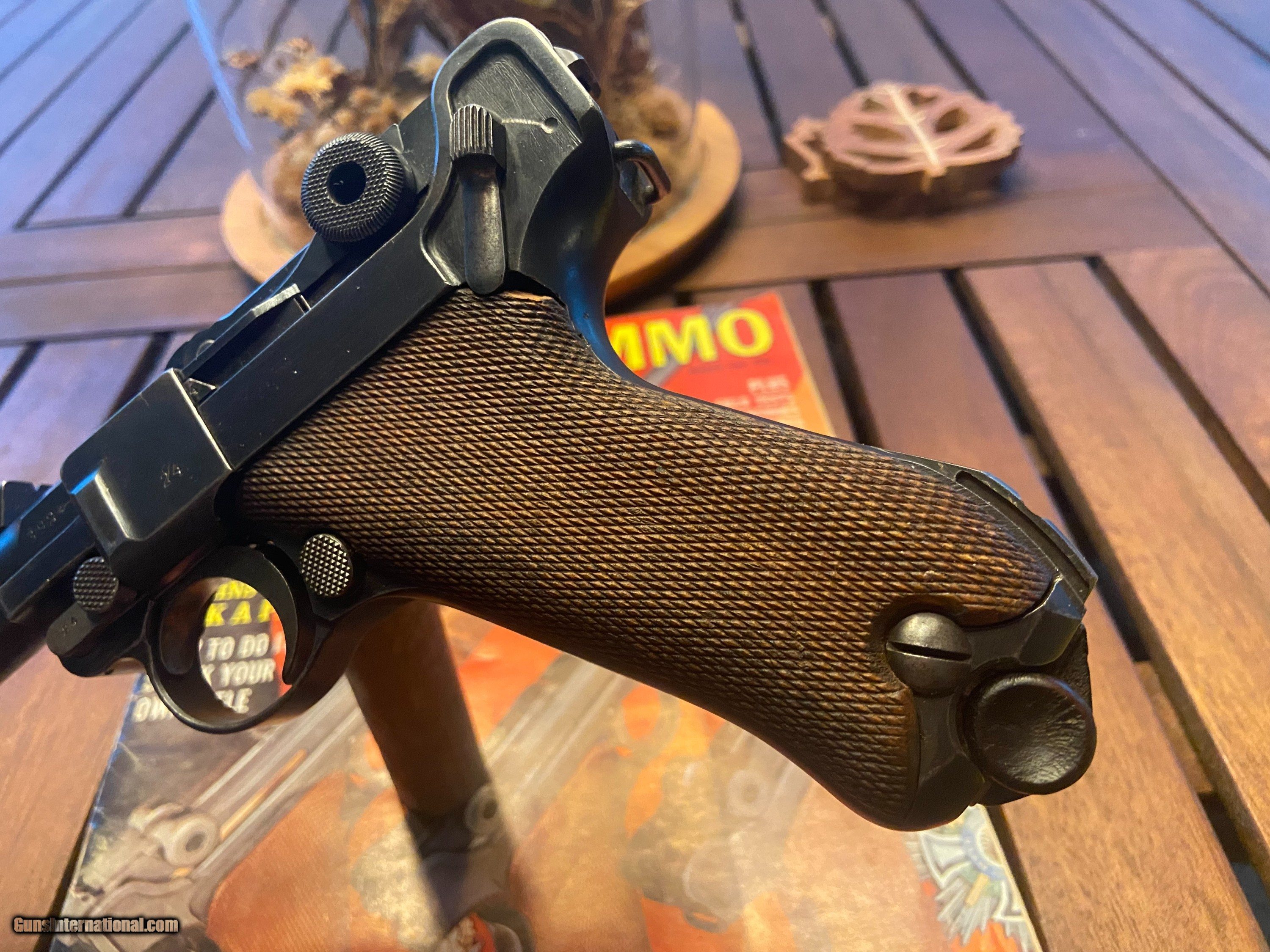 Description: 1917 ARTILLERY LUGER DWM Model 1914 Pistol Stock & Holster Rig LATE WORLD WAR I 8-Inch Barreled Pistol w Detachable Shoulder Stock The Luger is certainly one of the most iconic firearms in history, made so by its association with Germany during both World Wars. The top of the chamber is Great War dated “1917”. The top of the toggle is marked “DWM”. The right side of the frame bears German military acceptance marks. The adoption of the Lange Pistole, aka the “Artillery Luger”, was authorized by the Kaiser on July 2, 1913. This P08 variation was equipped with a 200 mm (7.9 in) barrel, an 8-position tangent rear sight (calibrated to 800 meters (870 yd)) and a board-type shoulder stock with an attached leather holster. In the event of close combat, the pistol was intended to be used as a carbine with the shoulder stock attached to a lug mounted on the heel of the pistol frame. When set for long range use the rear sight element visibly moves to the left to compensate for spin drift. This pistol was intended for use by German artillery units who could not be encumbered by the long and heavy K.98 rifle. The overall condition is fine. The action is strong and tight. The bore is mirror bright. All numbers match. Both grips have retained sharp checkering with a small chip on the left grip in upper corner adjacent to safety. This example showcases a fine adjustment front sight blade and tangent rear sight. The shoulder stock, artillery pattern holster, takedown tool, and bore rod are all in very nice shape. In Fine original condition. SOLD Handgun Caliber: 9x19mm Parabellum (9mm Luger, 9x19mm NATO) Manufacturer: LUGER Model: P08 ARTILLERY Barrel Length: 8 Condition: EXCELLENT Metal Condition: EXCELLENT |