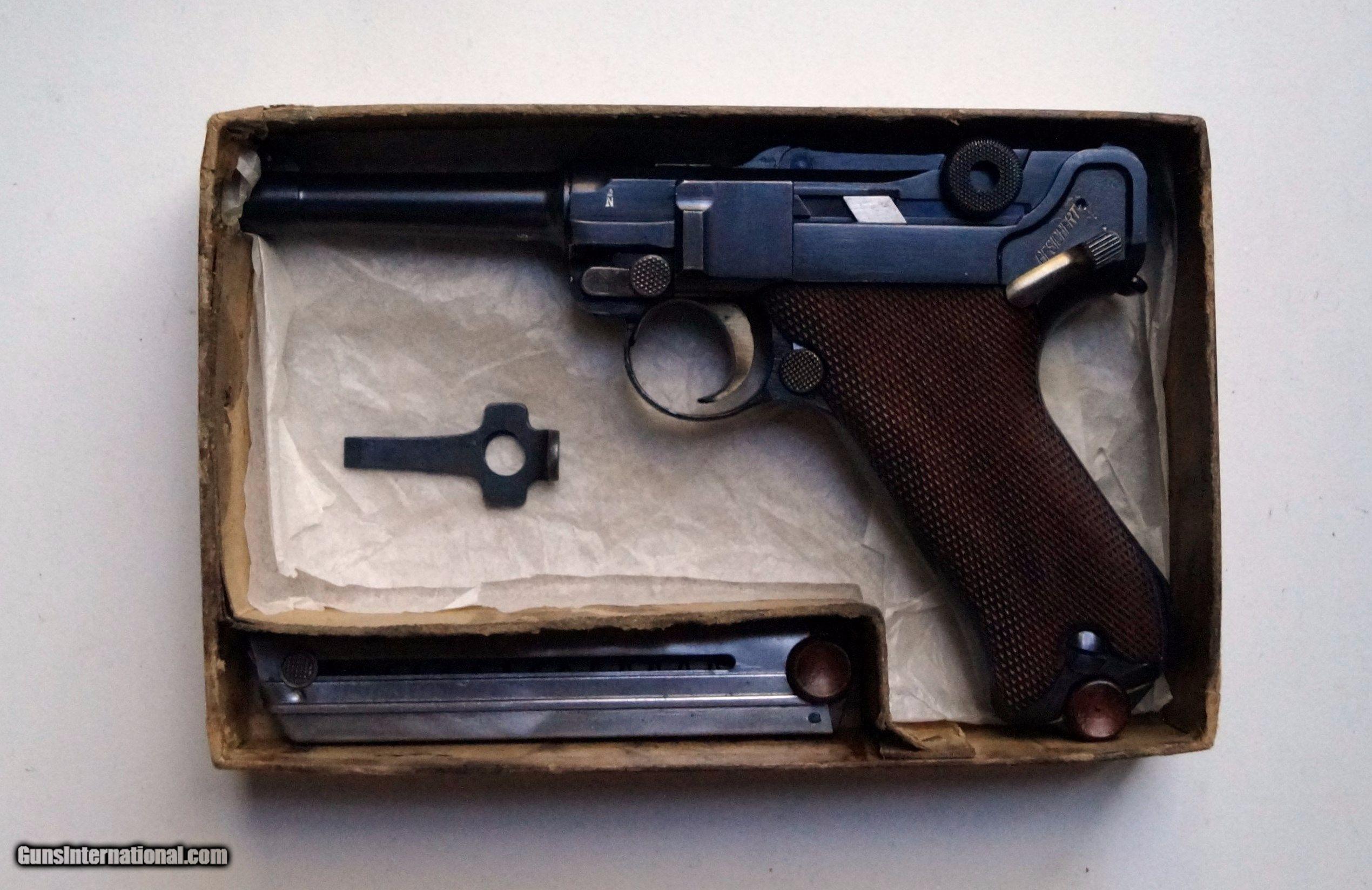 Description: THIS IS A 1920 A.F. STOEGER GERMAN LUGER, 7.65MM. THE LUGER IS IN COLLECTOR CONDITION. ALLINAL, NUMBER MATCHING VERY GOOD BORE AND GRIPS, MECHANICALLY CORRECT AND TIGHT. A VERY RARE GERMAN LUGER WHICH IS SELDOM FOUND IN THIS ORIGINAL CONDITION. NOTE: THE LUGER COMES WITH ITS ORIGINAL BOX THAT CONTAINS AN EXTRA ORIGINAL MAGAZINE AND 1 ORIGINAL LOADING TOOL. SOLD Curio/Relic: Yes |