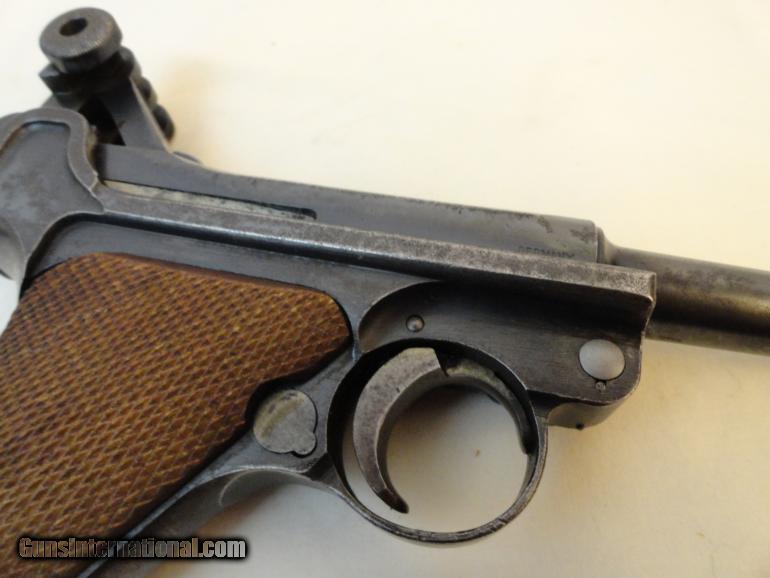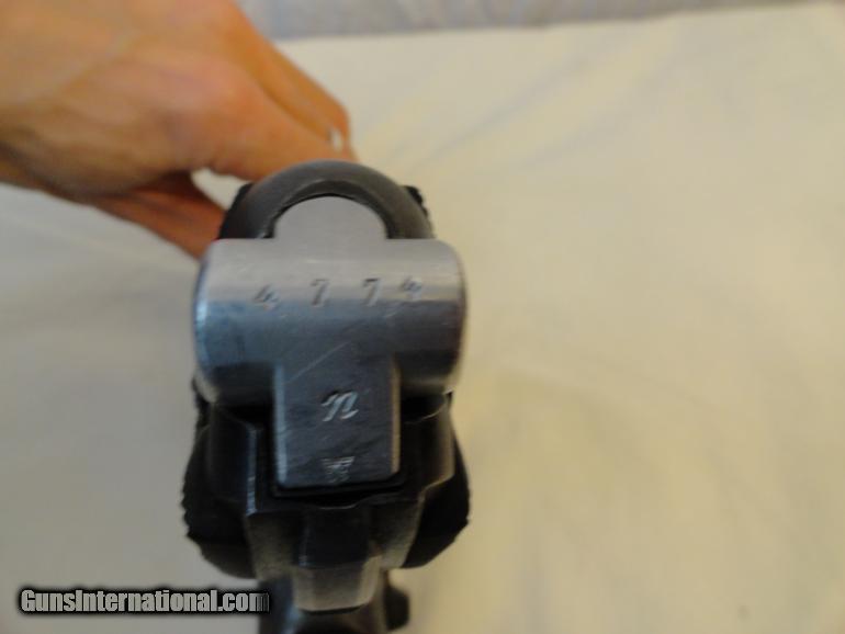Description: Sold commercially after the war. This is a standard .30 caliber Luger. It retains 85% original factory blue with most wear to the high spots from a holster. Bore is excellent. Works fine. All matching numbers including the clip. SOLD Curio/Relic: Yes Manufacturer: DWM Model: 1908 Serial Number: 81474 Caliber Info: 30 Luger Bore: Exc Condition: FINE Finish: blue Manufacture Date: 1920's Proof:Nitro: yes |