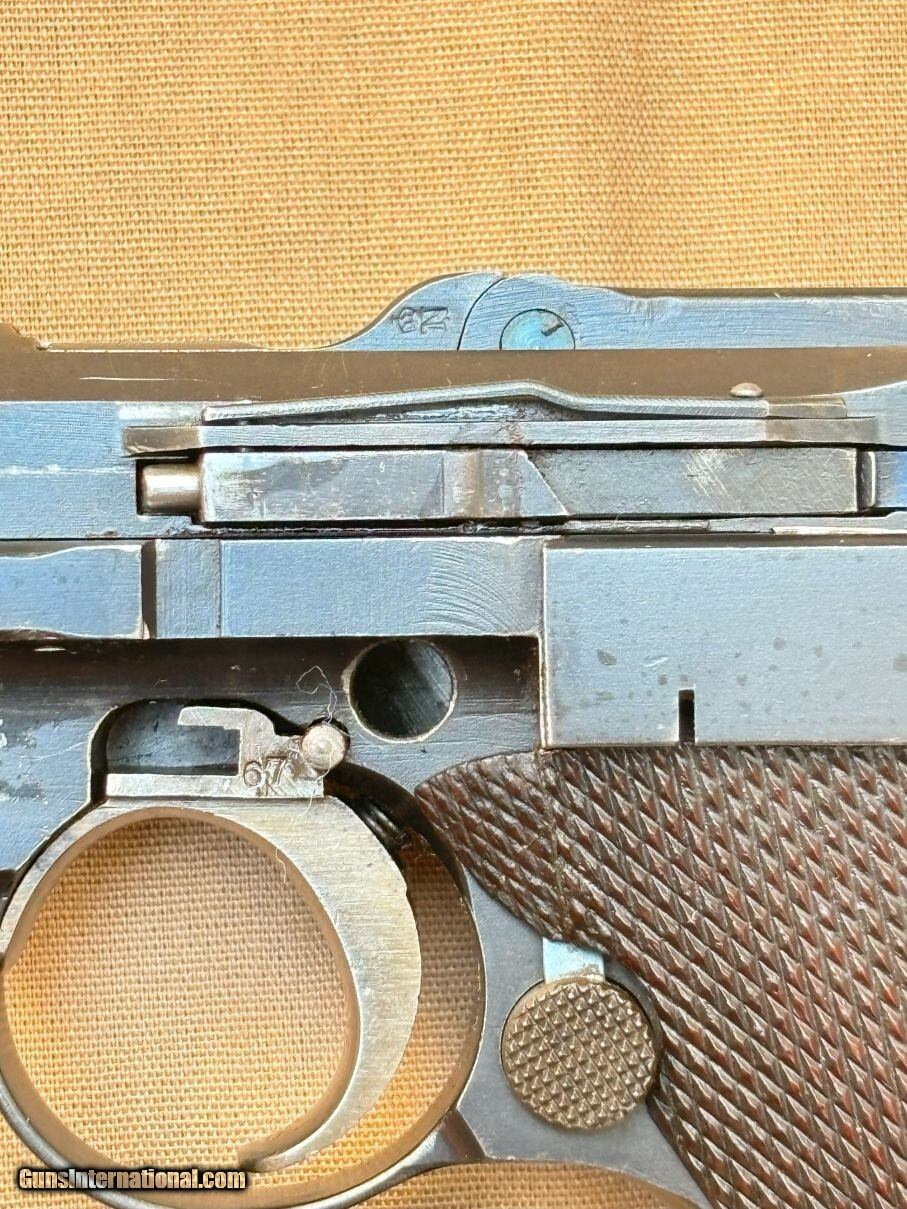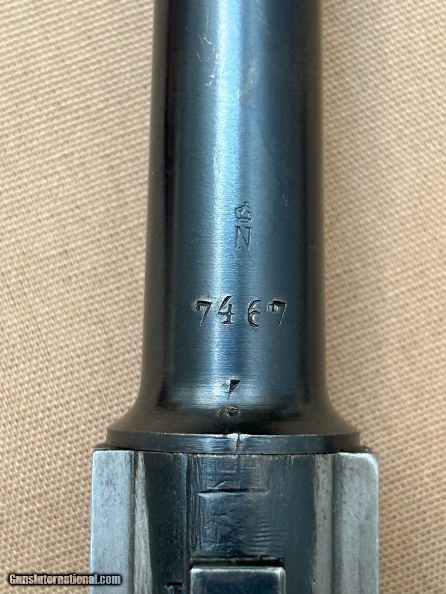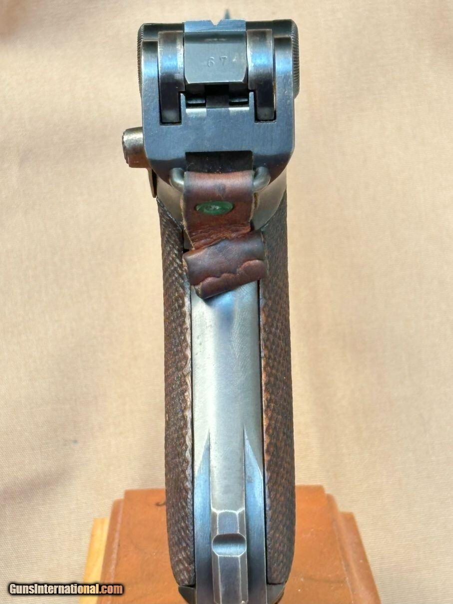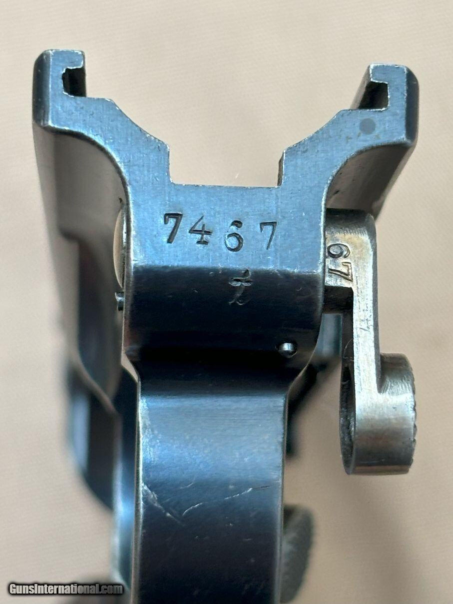 Description: Offered for sale is one (1) 1929 DWM Police Luger s/n 7467t. The DWM-BKIW post-war Luger production was from 1919-1930. In 1929, the "Alphabet DWM" as it is sometimes referred to as, produced the "s-t-u" block of guns. This production block was mostly police production with the E/WaA66 stamp on the right side of the slide extension, which s/n7467t has . This example has all matching serials stamped in the commercial manner, including one original serial matching Police marked wood base magazine, the front grip marked with a Prussian District Police Landjagerei, "L.Ka. 134" with halos which means it was stamped after finish and has not been refinished thereafter. Halos are also present on underside matching barrel serial number Blue and straw finish are both original, blue has the police sear safety intact with the magazine safety removed. Left grip has a small repair to the upper left corner just above the mag release button. This was where the mag safety came out from underneath the grip. (Often, this small area will be seen broken away, and not repaired). This Police Luger has that small area of checkered wood restored. Bore rates 8.5/10, grips are not numbered as is the firing pin which is correct, blue rates 94-95% with normal edge wear, straw 80-85% with most color gone from safety lever, but trigger, take down lever, and ejector have strong remaining color. Hold open works perfectly. $2450 shipped, Lower 48 states USA. Payment accepted is USPS Money Order or Personal Check, will hold to clears. I ship thru a local dealer, once payment clears, they will contact your FFL dealer for a copy of their license. Curio/Relic: Yes Handgun Caliber: 9x19mm Parabellum (9mm Luger, 9x19mm NATO) Manufacturer: DWM Serial Number: 7467t Metal Condition: 93-94% Bore Condition: 8.5/10 Price: $2,450.00 Buy Now Contact Seller |