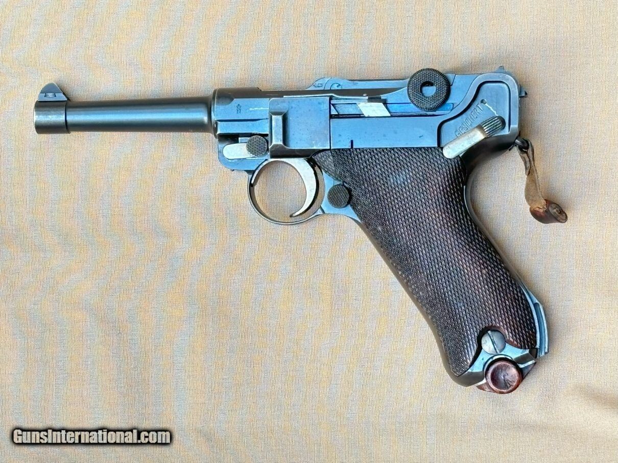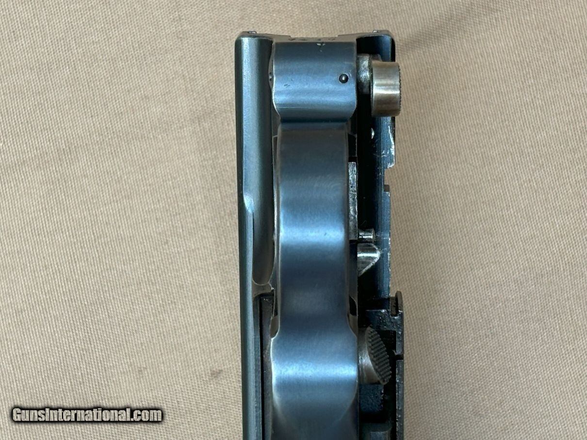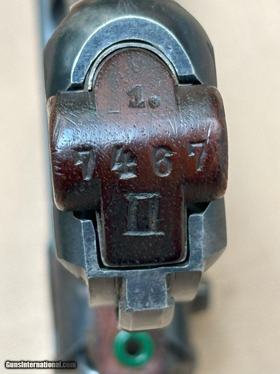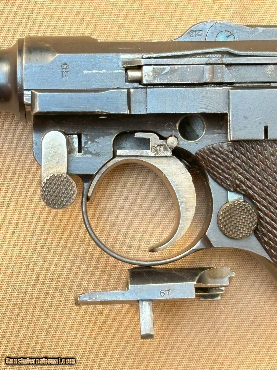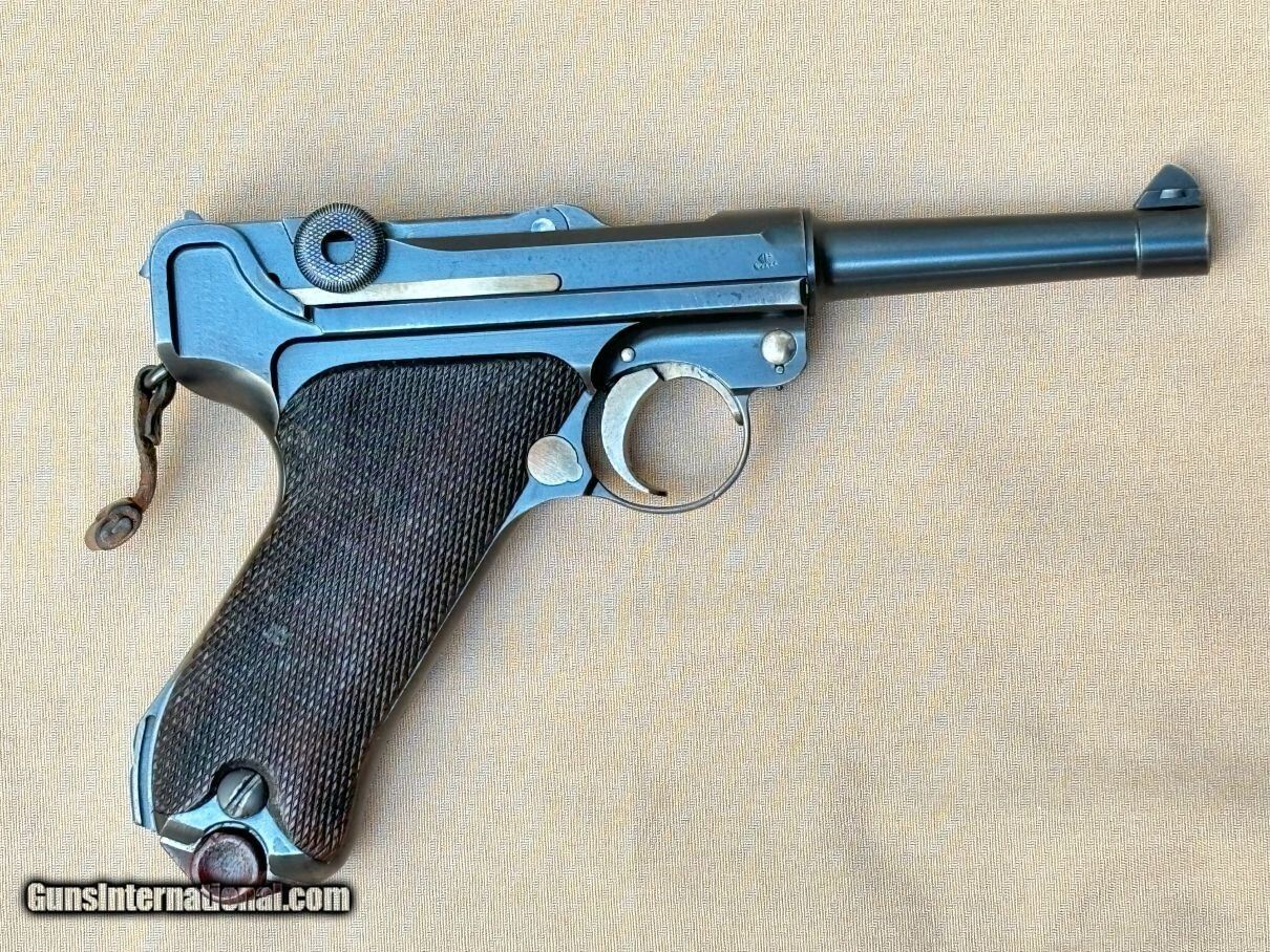 Description: Offered for sale is one (1) 1929 DWM Police Luger s/n 7467t. The DWM-BKIW post-war Luger production was from 1919-1930. In 1929, the "Alphabet DWM" as it is sometimes referred to as, produced the "s-t-u" block of guns. This production block was mostly police production with the E/WaA66 stamp on the right side of the slide extension, which s/n7467t has . This example has all matching serials stamped in the commercial manner, including one original serial matching Police marked wood base magazine, the front grip marked with a Prussian District Police Landjagerei, "L.Ka. 134" with halos which means it was stamped after finish and has not been refinished thereafter. Halos are also present on underside matching barrel serial number Blue and straw finish are both original, blue has the police sear safety intact with the magazine safety removed. Left grip has a small repair to the upper left corner just above the mag release button. This was where the mag safety came out from underneath the grip. (Often, this small area will be seen broken away, and not repaired). This Police Luger has that small area of checkered wood restored. Bore rates 8.5/10, grips are not numbered as is the firing pin which is correct, blue rates 94-95% with normal edge wear, straw 80-85% with most color gone from safety lever, but trigger, take down lever, and ejector have strong remaining color. Hold open works perfectly. $2450 shipped, Lower 48 states USA. Payment accepted is USPS Money Order or Personal Check, will hold to clears. I ship thru a local dealer, once payment clears, they will contact your FFL dealer for a copy of their license. Curio/Relic: Yes Handgun Caliber: 9x19mm Parabellum (9mm Luger, 9x19mm NATO) Manufacturer: DWM Serial Number: 7467t Metal Condition: 93-94% Bore Condition: 8.5/10 Price: $2,450.00 Buy Now Contact Seller |