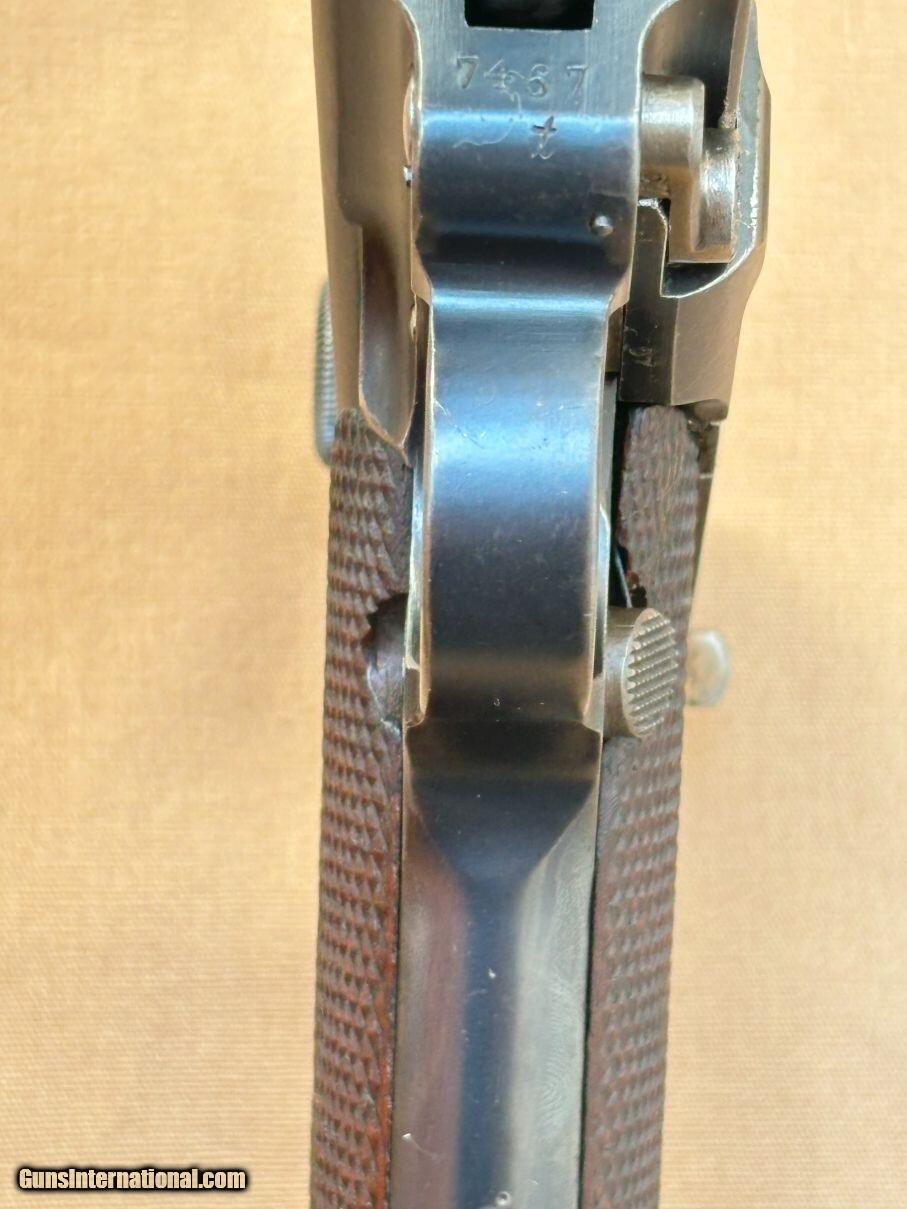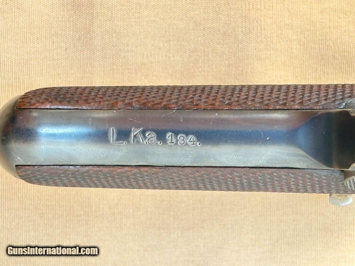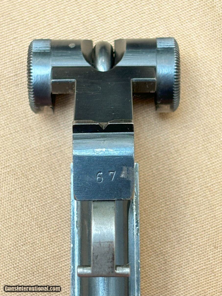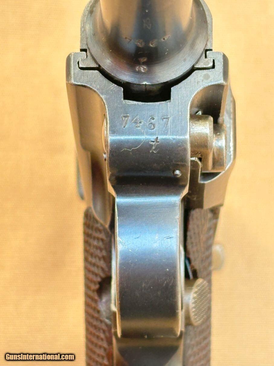 Description: Offered for sale is one (1) 1929 DWM Police Luger s/n 7467t. The DWM-BKIW post-war Luger production was from 1919-1930. In 1929, the "Alphabet DWM" as it is sometimes referred to as, produced the "s-t-u" block of guns. This production block was mostly police production with the E/WaA66 stamp on the right side of the slide extension, which s/n7467t has . This example has all matching serials stamped in the commercial manner, including one original serial matching Police marked wood base magazine, the front grip marked with a Prussian District Police Landjagerei, "L.Ka. 134" with halos which means it was stamped after finish and has not been refinished thereafter. Halos are also present on underside matching barrel serial number Blue and straw finish are both original, blue has the police sear safety intact with the magazine safety removed. Left grip has a small repair to the upper left corner just above the mag release button. This was where the mag safety came out from underneath the grip. (Often, this small area will be seen broken away, and not repaired). This Police Luger has that small area of checkered wood restored. Bore rates 8.5/10, grips are not numbered as is the firing pin which is correct, blue rates 94-95% with normal edge wear, straw 80-85% with most color gone from safety lever, but trigger, take down lever, and ejector have strong remaining color. Hold open works perfectly. $2450 shipped, Lower 48 states USA. Payment accepted is USPS Money Order or Personal Check, will hold to clears. I ship thru a local dealer, once payment clears, they will contact your FFL dealer for a copy of their license. Curio/Relic: Yes Handgun Caliber: 9x19mm Parabellum (9mm Luger, 9x19mm NATO) Manufacturer: DWM Serial Number: 7467t Metal Condition: 93-94% Bore Condition: 8.5/10 Price: $2,450.00 Buy Now Contact Seller |