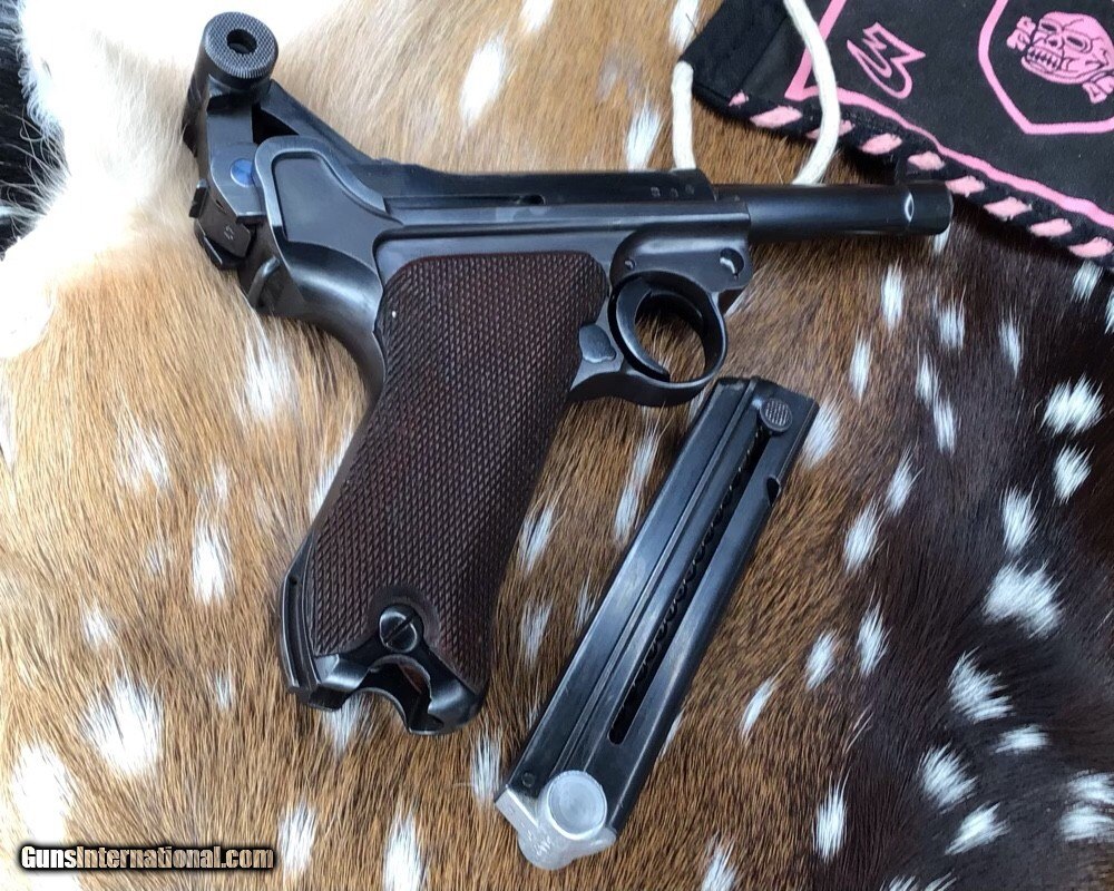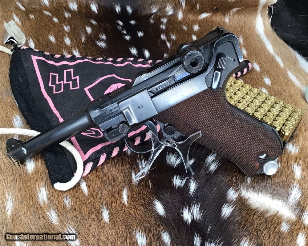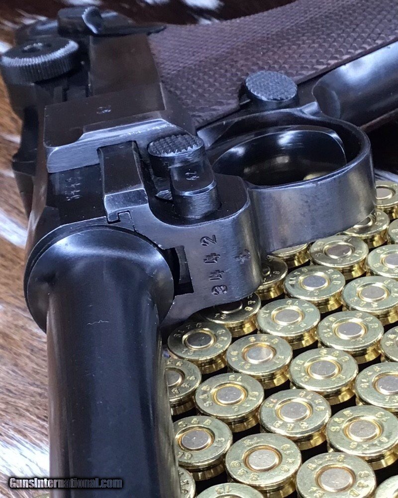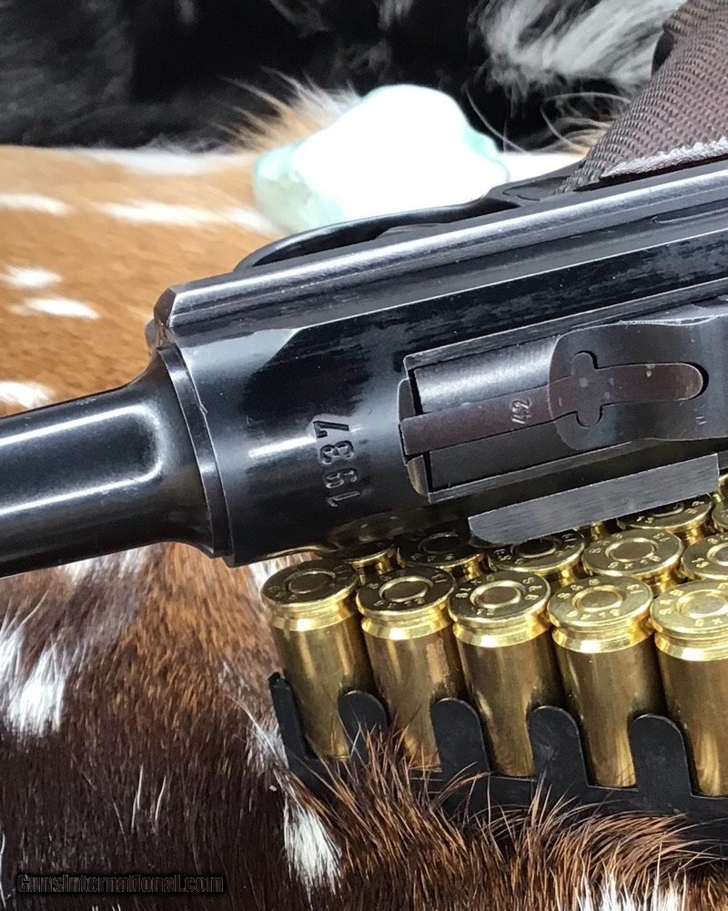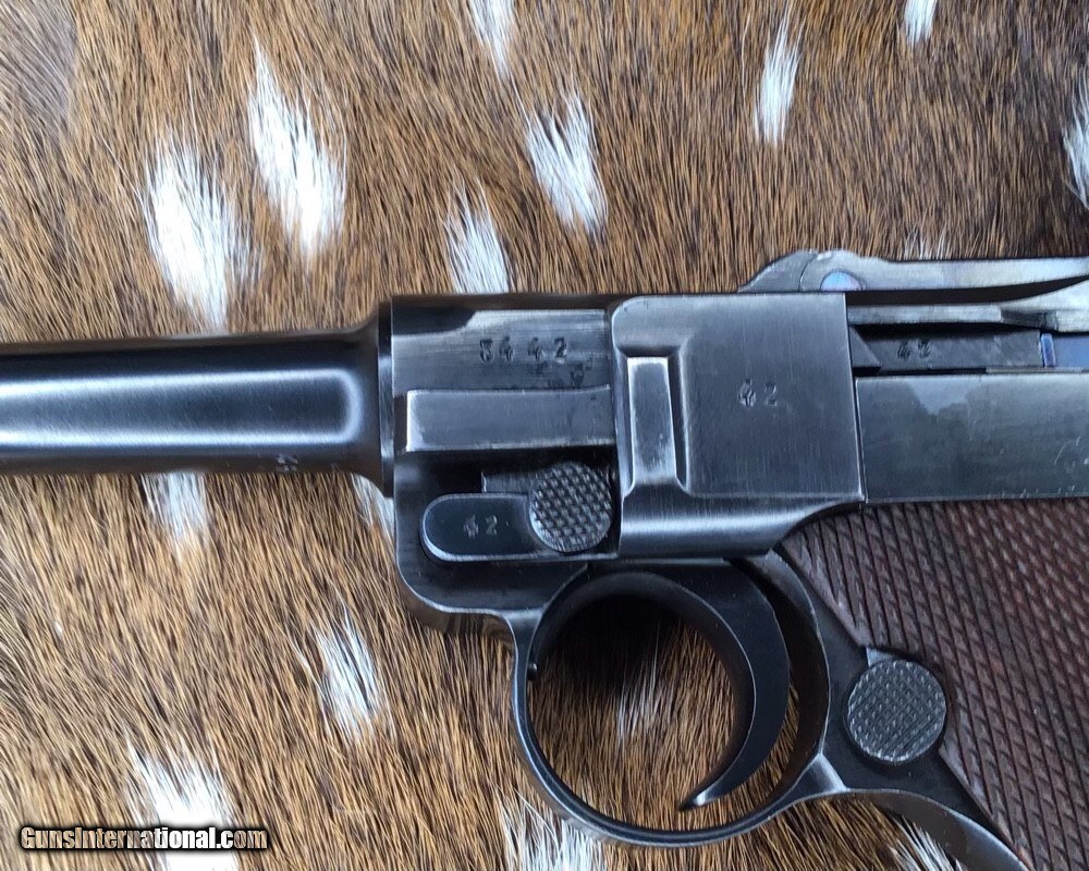 Description: 1937 WWII GERMAN MAUSER S/42 MODEL P.08 9mm PISTOL | 1937 German Mauser S/42 Model P.08 9x19mm Semi Automatic Pistol. Matching serial stamped on the chamber, barrel, frame, toggle, magazine,grips and small components Chamber is stamped "1937". The toggle is stamped "S/42". Blued finish. Checkered number match walnut grips. one magazine. Fixed sights. | Caliber / Gauge: 9x19mm | Barrel Length: 3.75" | Serial Number: 3442 . Gorgeous 90% or better condition on a WWII Mauser Luger with all visible numbers matching. God Bless America from a proud American, and a Viet Nam Vet , thankful for our freedoms.. paid for by the Blood ,Sweat and Tears of our brave men and women in uniform. Ten Below Firearms is a Veteran owned and operated business. We specialize in out of production models of high quality firearms. We love to ship! If you are out of state or can't make it to our store, just give us a call! Handguns normally ship for $30 and Long guns for $40 to $65 for extra length long guns. That's 2-3 day USPS Priority shipping, Delivery conformation and with tracking number. Optional Postal insurance is additional $1.70 per $100 and highly recommended. SOLD Curio/Relic: Yes Handgun Caliber: 9x19mm Parabellum (9mm Luger, 9x19mm NATO) Manufacturer: Mauser Model: P08 Luger Serial Number: 3442 Barrel Length: 3.75 inch Condition: 90% or better Metal Condition: Very good Wood Condition: Very good Bore Condition: Very good Action: Semi- Auto Finish: Blued Sights: Fixed Manufacture Date: 1937 Item Location: Mn |