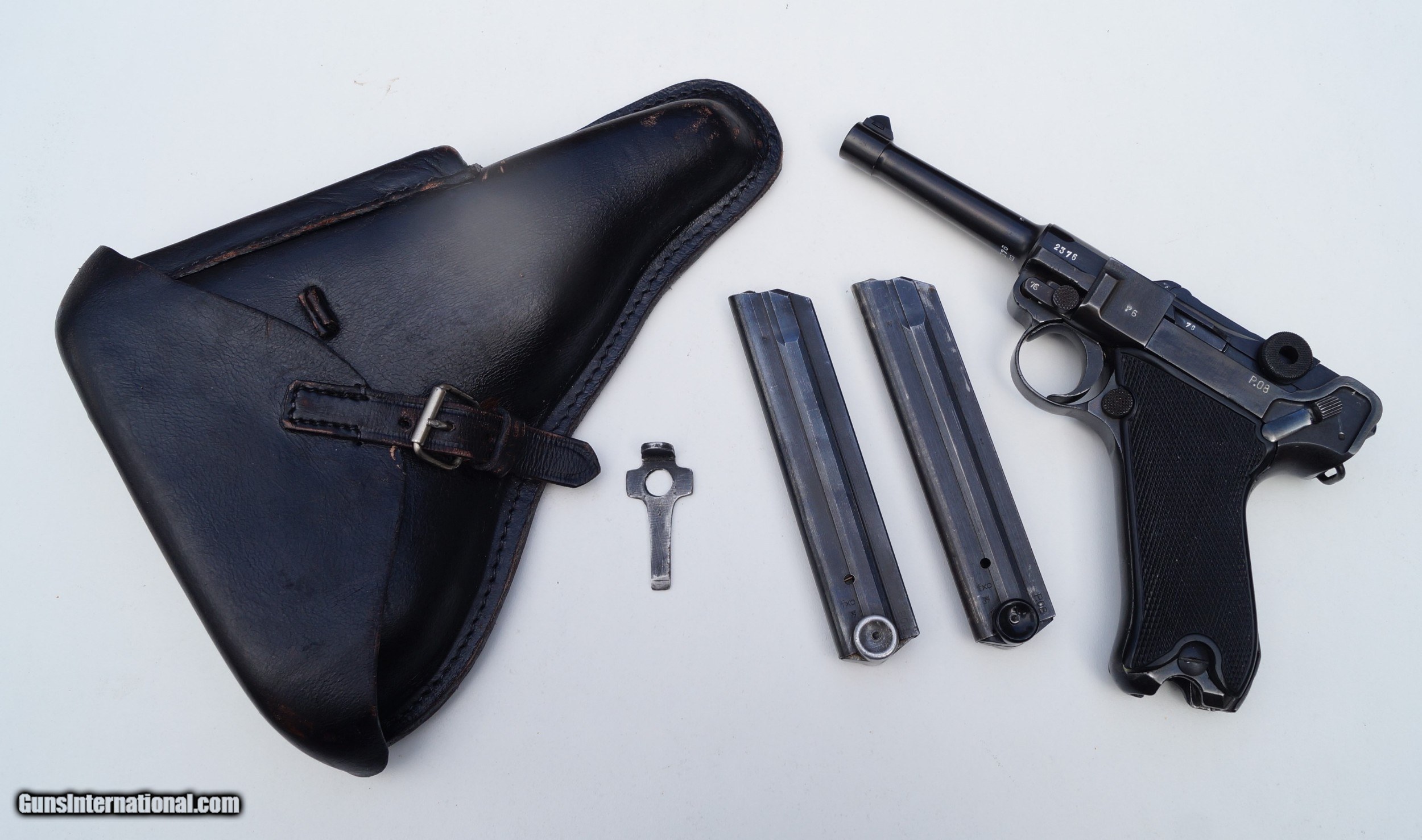Description: THIS IS A 41 BYF "BLACK WIDOW" NAZI GERMAN LUGER RIG, 9MM. THE LUGER IS IN VERY GOOD CONDITION, ALL ORIGINAL, NUMBER MATCHING (THIS INCLUDES 1 NAZI MARKED FXO MAGAZINE), VERY GOOD BORE AND GRIPS, MECHANICALLY CORRECT (THE GUN WILL SHOOT), THE RIG CONSISTS OF THE LUGER, 2 ORIGINAL NAZI FXO MAGAZINES, 1 ORIGINAL NAZI MARKED 1941 DATED HOLSTER AND 1 ORIGINAL NAZI MARKED LOADING TOOL. THEY DON'T COME BETTER THAN THIS. SOLD Curio/Relic: Yes |