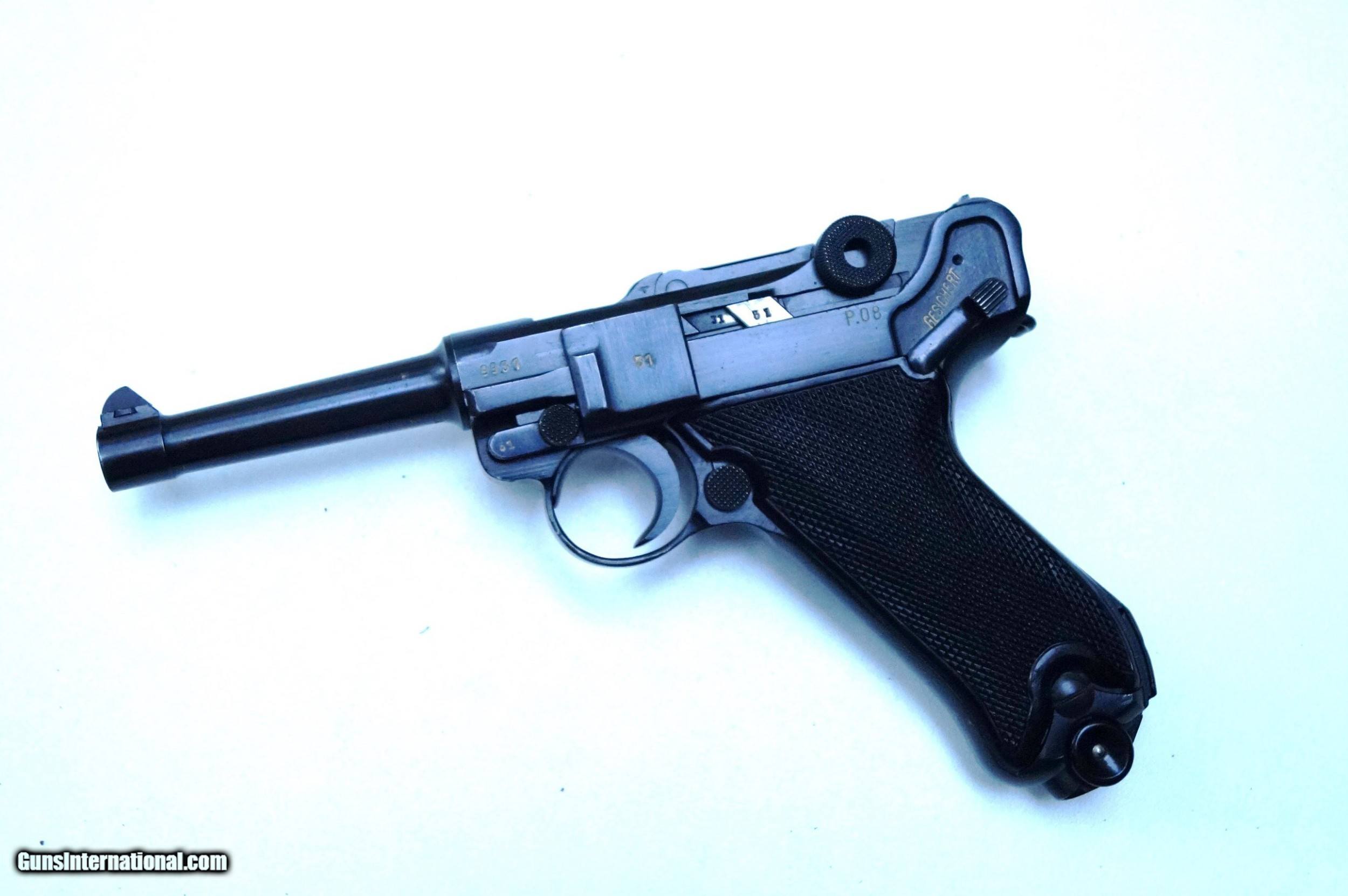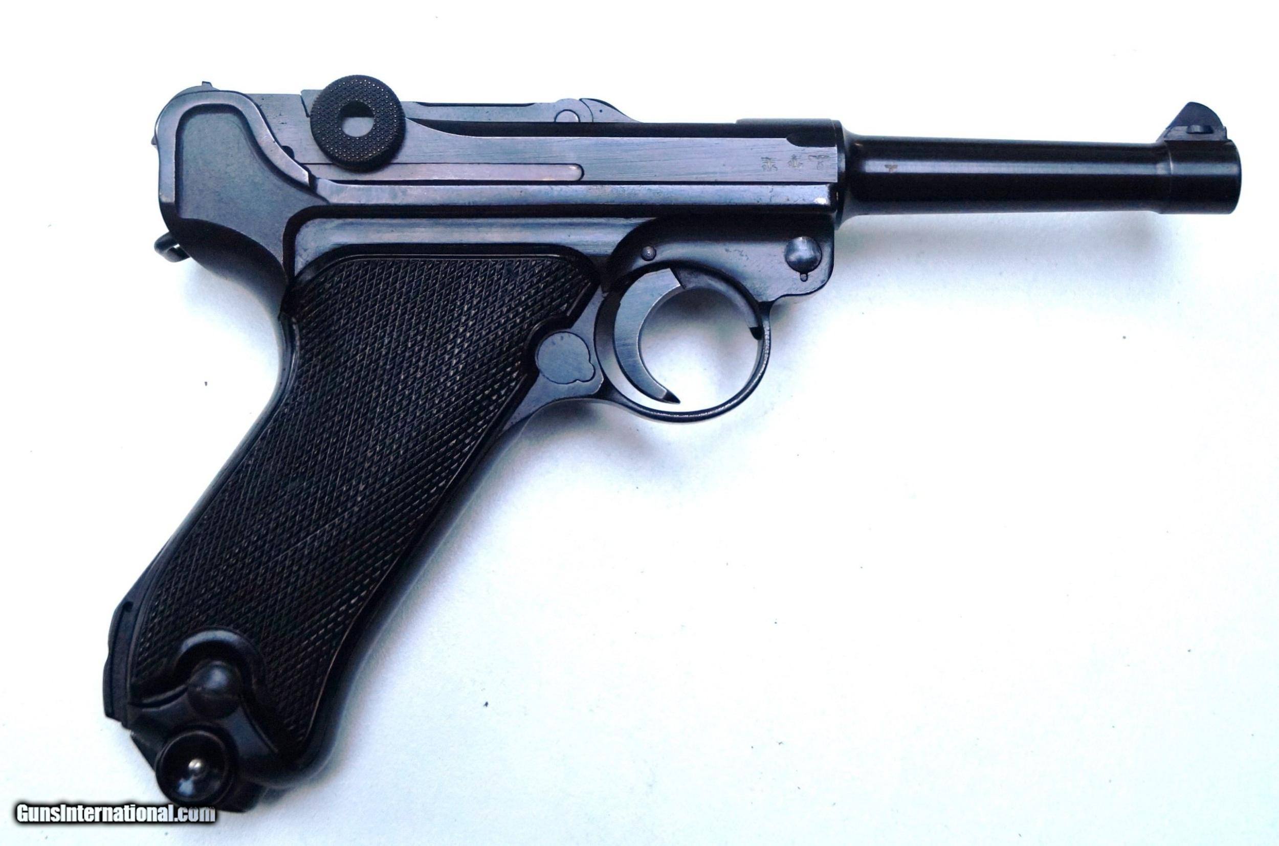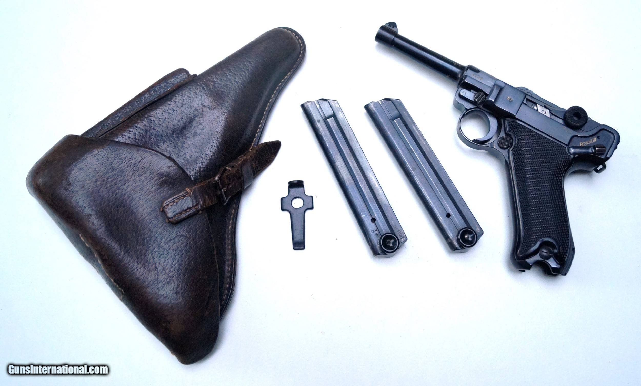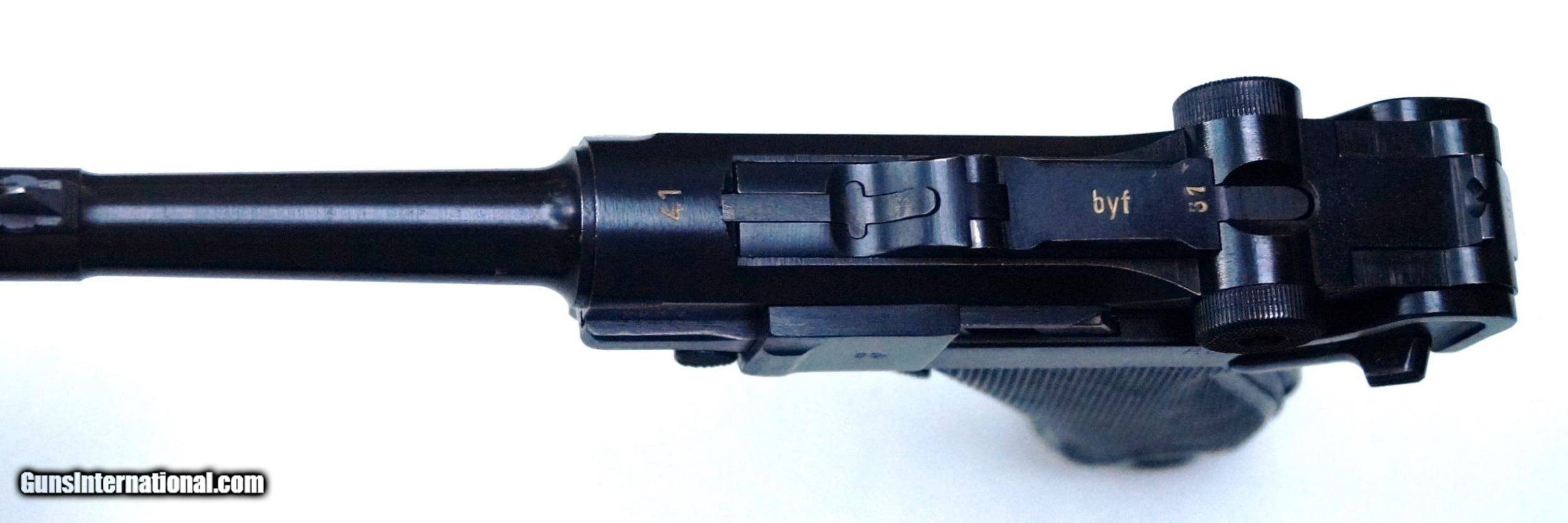 Description: THIS IS A 41 BYF (MAUSER) "BLACK WIDOW" MILITARY GERMAN LUGER RIG, 9MM. THE LUGER IS IN VERY GOOD CONDITION. ALL ORIGINAL, NUMBER MATCHING, VERY GOOD BORE AND GRIPS, MECHANICALLY CORRECT (THE GUN WILL SHOOT). THE RIG CONSISTS OF THE LUGER, 2 ORIGINAL NAZI FXO MAGAZINES, 1 ORIGINAL NAZI MARKED HOLSTER AND 1 ORIGINAL NAZI MARKED LOADING TOOL. THEY DON'T COME BETTER THAN THIS. NOTE: THE LUGER HAS THE RARE WAFFENAMPT 135 PROOF MARKING AND A RARE PIG SKIN HOLSTER. SOLD Curio/Relic: Yes |