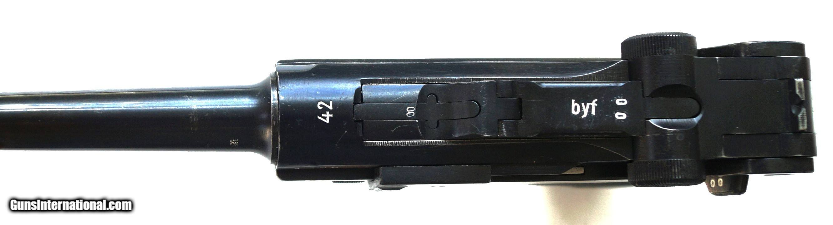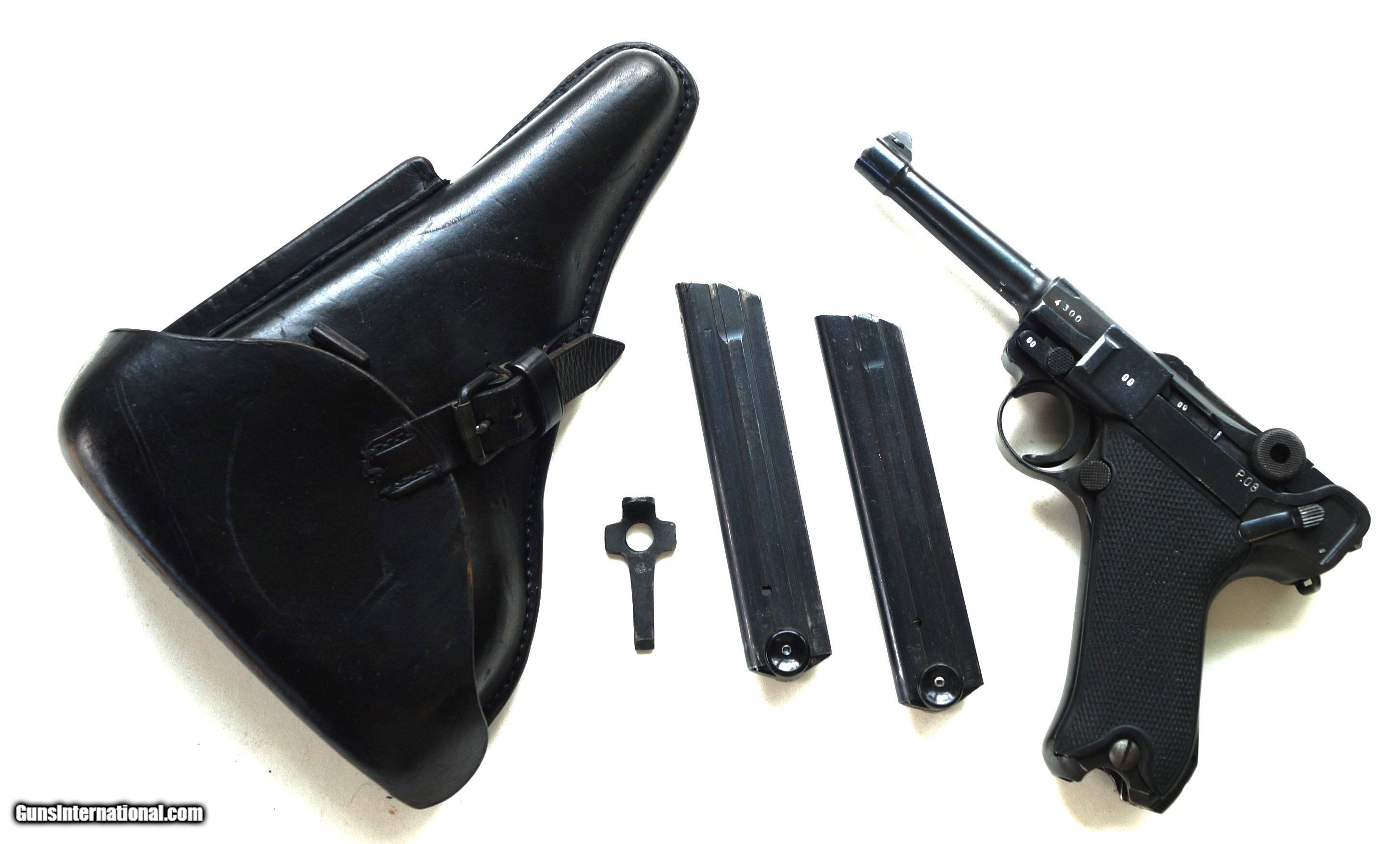 Description: THIS IS A 42 BYF (MAUSER) "BLACK WIDOW" GERMAN LUGER RIG, 9MM. THE LUGER IS IN VERY GOOD CONDITION. ALL ORIGINAL, NUMBER MATCHING, VERY GOOD BORE AND GRIPS, MECHANICALLY CORRECT. THE RIG CONSISTS OF THE LUGER, 2 ORIGINAL FXO MAGAZINES, 1 ORIGINAL GERMAN PROOF MARKED HOLSTER AND 1 GERMAN PROOF MARKED LOADING TOOL. THEY DON'T COME BETTER THAN THIS. SOLD Curio/Relic: Yes |