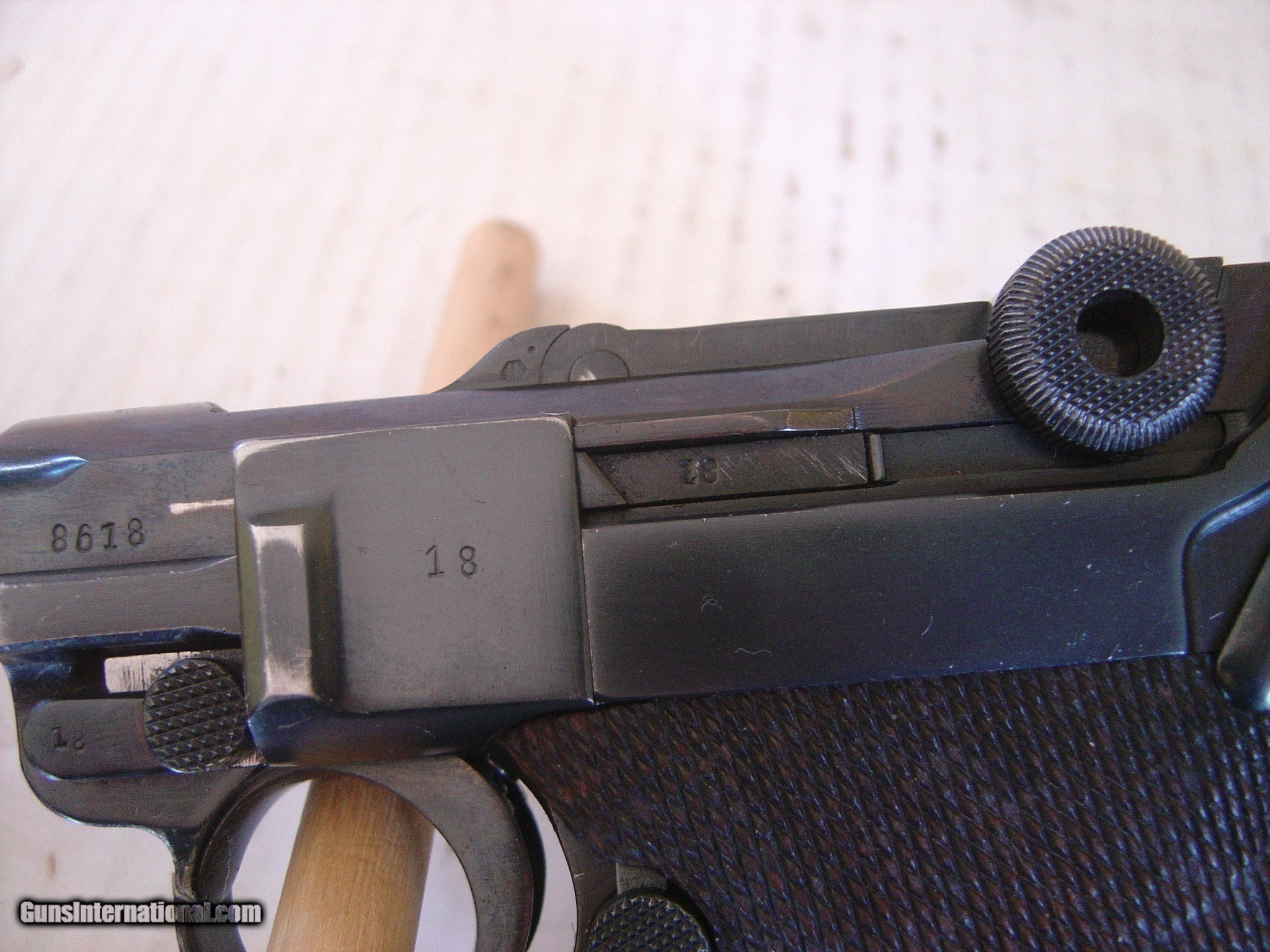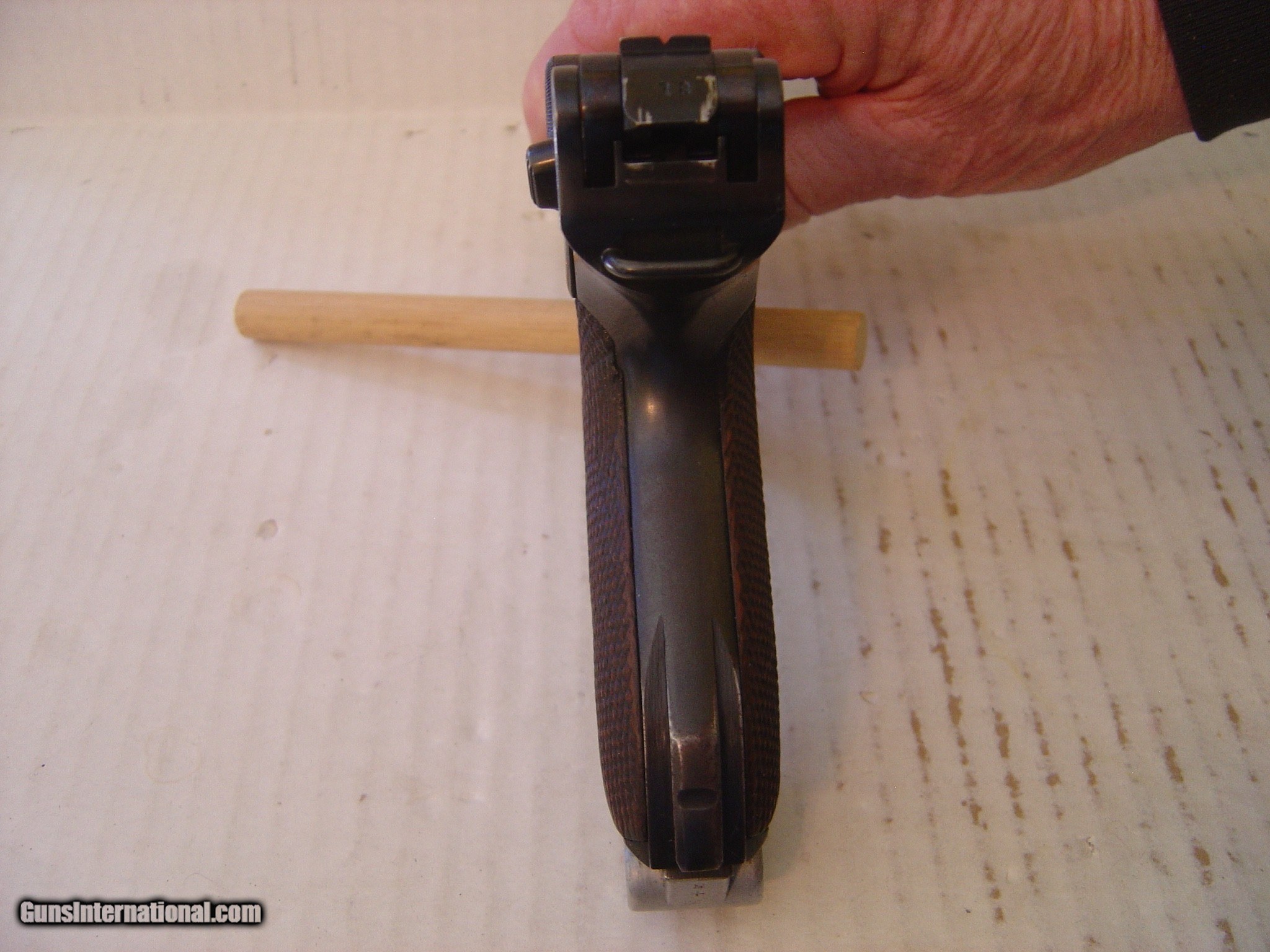 Description: This is a 1939 manufactured German Luger in excellent condition. All serial numbers inside and out, including magazine, match. Firing pin is unnumbered. Wooden grips are in excellent condition and bluing is also excellent with the exception of some holster wear that can be seen in the pictures. Lugers of this quality are getting scarce. Pistol functions and shoots perfectly. Bore is slightly frosted but rifling is very good. SOLD Curio/Relic: Yes Manufacturer: Mauser Model: P08 Serial Number: 8618 Caliber Info: 9mm Bore: Very Good Condition: Excellent Metal Condition: Excellent Wood Condition: Excellent Bore Condition: Very Good Action: Toggle Triggers: Single Finish: Blued Steel Weight: 31 Ozs. Sights: Open Manufacture Date: 1939 Item Location: Pennsylvania Proof:Nitro: Yes |