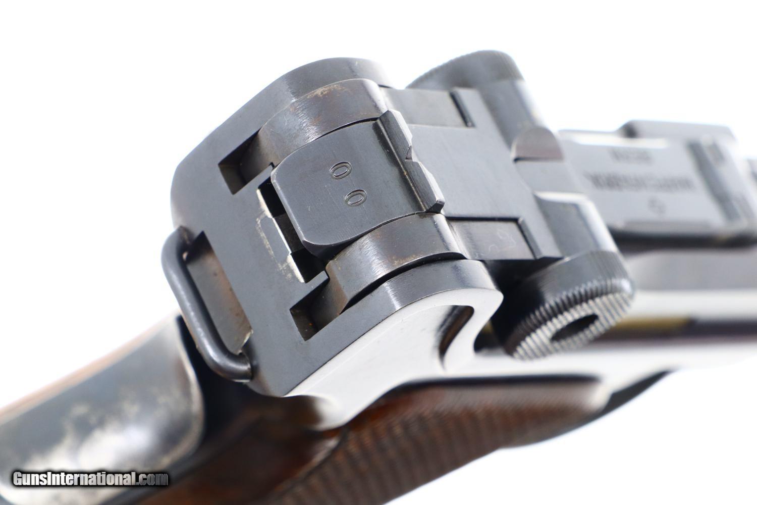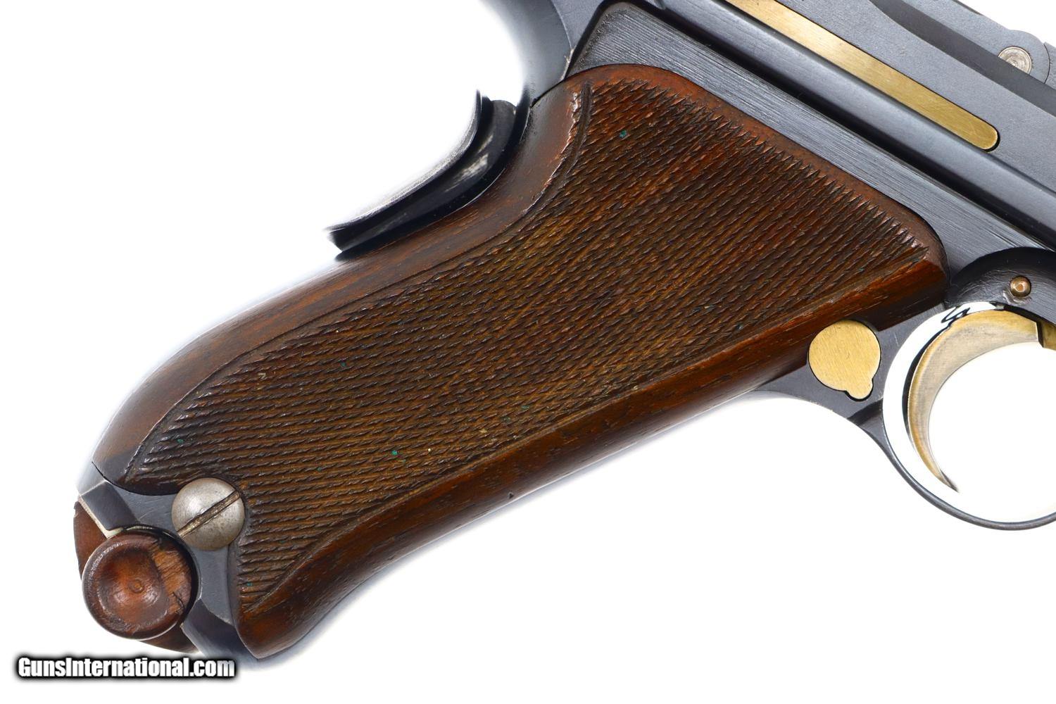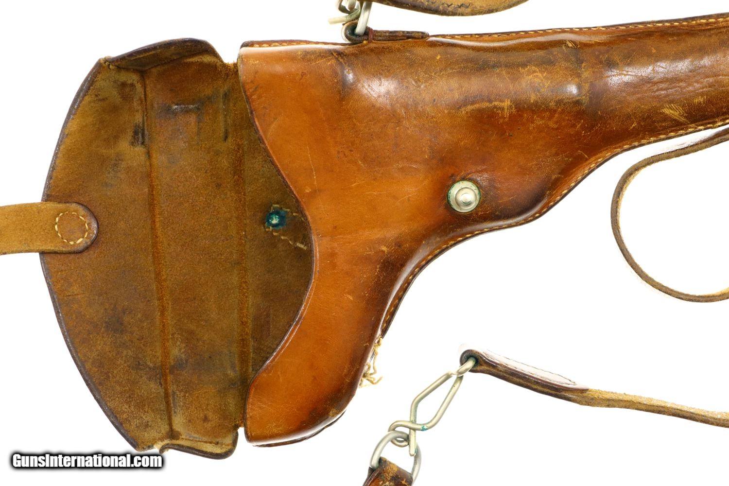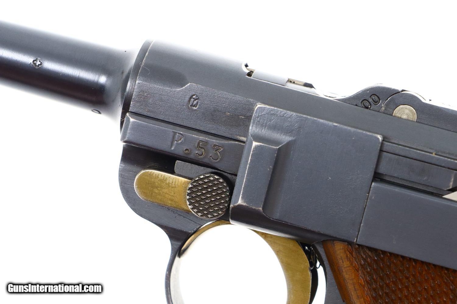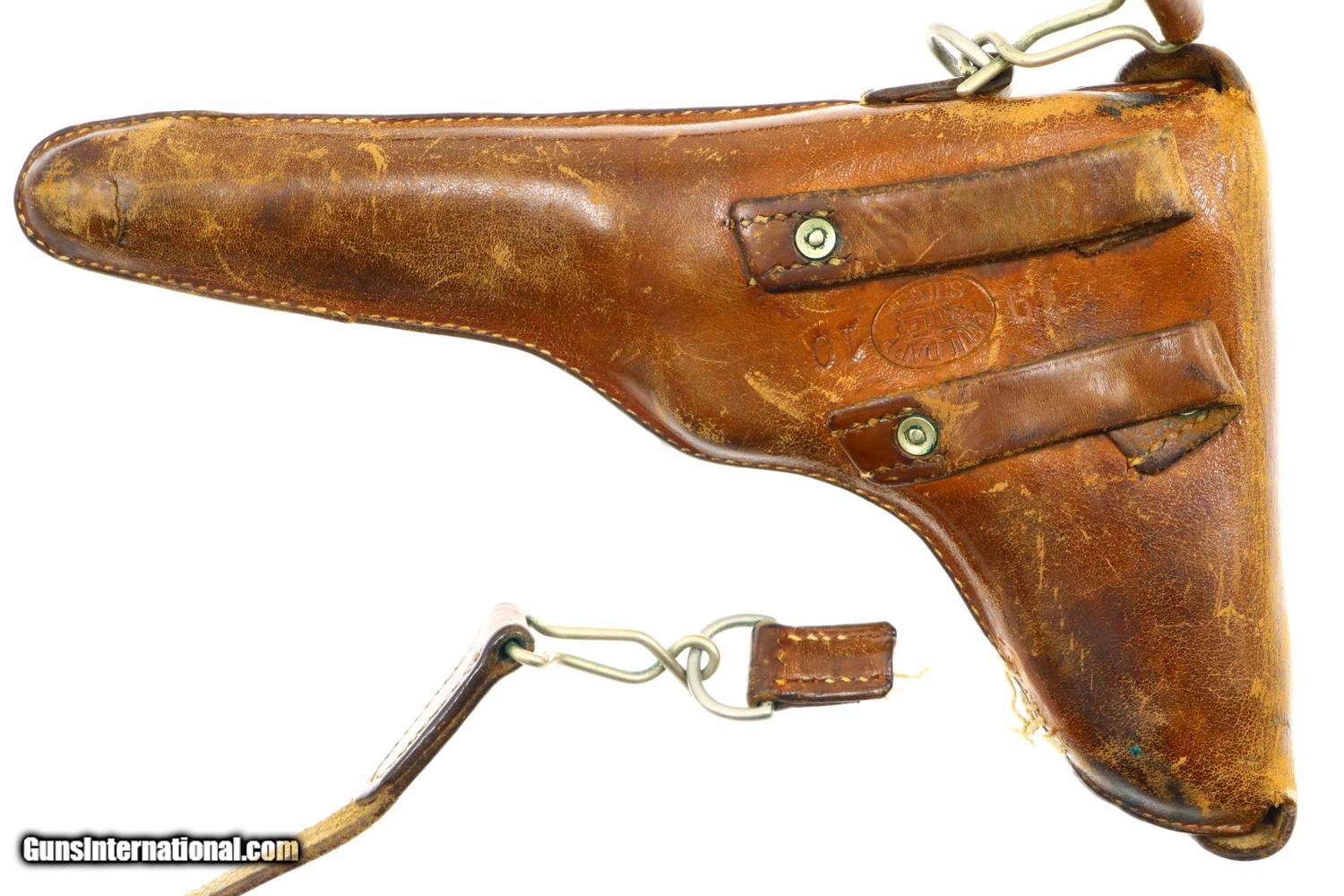 Description: Synopsis: Attractive Bern 1924 Swiss Military Luger with earlier holster/shoulder strap, all matching. Description: Desirable and all matching Swiss Bern 1924 Military Luger with 4.75” barrel having drift adjustable front sight and fixed “V” notch rear sight. Blank chamber. Middle link with WAFFENFABRIK BERN. Inspection marking on left side of receiver. “P” release, marked "P.53" on left side of rail. Full serial number under barrel and forward frame with the last two-three digits under the sideplate, barrel extension, on all three components of the toggle, trigger, and each of the grips. Scattered Swiss crosses in usual locations. Major components are rust blued with strawed take down lever, trigger, magazine release and ejector. Original checkered grips with prominent border. Correct magazine with wood plug marked with a "2". Earlier Holster from a model 1906 Luger dated “1910” with shoulder strap. Condition: VG+ original finish with sharp edge wear and thinning in usual locations, most pronounced over the grip safety. Small parts retaining most of their straw. Comparable condition grips, oil stained, with slightly blunted checkering. Magazine plug has a missing chip from the right side as photographed. Very bright bore with easily discernible rifling. Perfect manual mechanics. VG- holster, nicely marked on inner surface, leather strap retainer from rear of holster having separated from the body, easily restitched. A Very attractive and all matching Swiss 1924 military Luger coupled to an earlier holster with shoulder strap. ~~Insured shipping fee of $55; most packages shipped using FedEx 2nd Day.~~ SOLD Manufacturer: Bern Serial Number: 17400 Caliber Info: 7.65mm Luger |