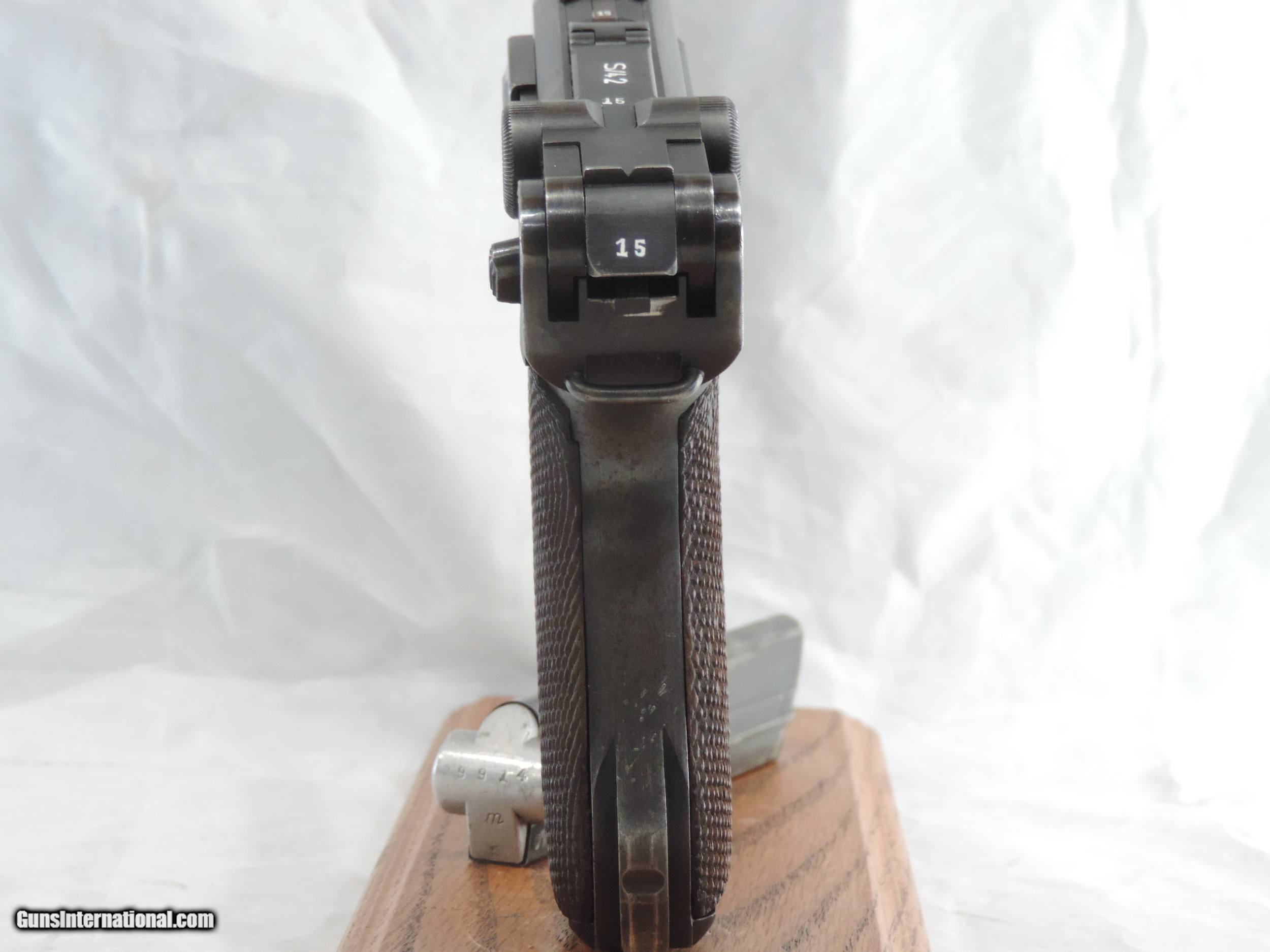 Description: INV. 9990 AWESOME, MAUSER P.08, S/42(LUGER), CAL. 9MM, SER. 6615 M, MFG. 1938. TRULY AN AWESOME FIND. THIS G.I. "HOLSTER QUEEN" HAS RETAINED ABOUT 98-99% OF THE ORIGINAL FACTORY BLUE. THE LITTLE LOSS THERE IS, IS FROM SOME MINOR SHARP EDGE SILVERING DUE TO HOLSTER WEAR. THE GRIPS STRAPS SHOW NO SIGN OF GRAYING. ALL PARTS MATCH INCLUDING THE GRIPS AND HAVE THE PROPER WAFFENAMTS**. THE GRIP PANELS ARE PERFECT NO NICKS, SPLITS OR EVEN A FLATTENED POINT. THE SLIDE RAILS, FEED RAMP AND BOLT FACE SHOW SCANT IF ANY USE. THE BORE IS PRISTINE LIKE THE REST OF THE GUN, MIRROR BRIGHT WITH RAZOR SHARP RIFLING AND NOT A WHISP OF FROST. IT COMES WITH ONE CORRECT ALUMINUM BASED MAGAZINE NUMBERED 9914. THIS "HOLSTER QUEEN" WOULD SATISFY EVEN THE MOST PICKY COLLECTOR AND CERTAINLY DESERVES A PRIME POSITION IN ANY COLLECTION. INVESTMENT PRICED AT... $2895.*** **THE WHITE CRAYON IS TO SHOW THAT ALL MARKINGS ARE CORRECT. IT IS HARMLESS AND EASILY REMOVED WITH LIGHTER FLUID AND A BRUSH. WE WILL DO IT ON REQUEST. *** 100% OFTHE GUN'S PRICE IS SATISFACTION GUARANTEED. To purchase this firearm or if you want to request more information contact us at: Email ckguns[at]ymail[dot]com Phone 201-512-0002 Cell 201-575-6838 FAX 201-215-4759 We accept most major credit cards. Prices shown are Discounted 3% for Cash or Check. The buyer must be familiar with all the laws governing the purchase and the ownership of firearms in their own city and state. The Yankee Armorer, Inc is not responsible for any failure to comply with or observe these laws. The Yankee Armorer, Inc will only ship after full payment and receipt of all required documents. Shipping: Add $35.00 for handguns, $45.00 for long guns. New Jersey buyers are subject to a 7% sales tax. The Yankee Armorer, Inc offers a 3 day inspection period with full refund upon return of intact firearm and in the original condition. The Yankee Armorer, Inc offers a no interest lay away program - 25% down; 25% in 30 days; 25% in 60 days; and full payment in 90 days. Any violation of this policy is subject to restocking and forfeiture of all payments. Any variation from this policy must be agreed to in advance. Unshipped Cancelled sales are subject to a 20% restocking fee. Be advised that all firearms sold by The Yankee Armorer, Inc. or the Gun Exchange, LLC (SELLER) are sold as collector’s items. They have not been fired or tested for safety and must be examined by a license gunsmith prior to use. By purchasing any item from the (SELLER), you are agreeing to hold the (SELLER) free from any damages or lawsuits of any nature. Any item left for transfer or storage will be charged to $25.00 per month, per item from the day of its receipt. Any variation from this policy must be agreed to in advance. Store hours 10:00 am to 5:00 pm Tuesday -Saturday. It's always best to call for appointment. Store 201-512-0002, cell 201-575-6838. SOLD |