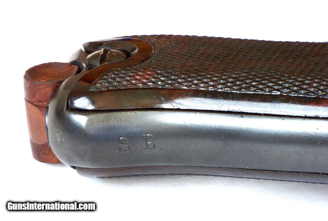 Description: Here is a beautiful Luger P-08 in 9 mm and dated 1918. This pistol was never issued to the military and was designated for police use only. It’s an early Weimar Republic, Nazi era and Russian captured piece and was assigned to police use in East Germany. It has the correct modification and grip panels and was an Arsenal rework at Mauser as indicated by the S/42 stamp on the toggle while the S.B. marking on the front strap indicates it as a Berlin police pistol. The magazine is a modern replacement. Also included is the old holster which is in wonderful condition and also carries a spare magazine and a reproduction take down tool. This pistol and holster are just as crisp and clean as they appear in the photos. Also included in this package is the rare (only 200 copies printed) Tinker/Gruber book, POLICE LUGERS which is signed by the authors. This book was the basis of the information regarding this pistol and is an invaluable guide to anyone who collects or wishes to collect this unique variation of Luger pistols. This pistol and book will be a valuable addition to any collection. Price: $1195 SOLD Curio/Relic: Yes |