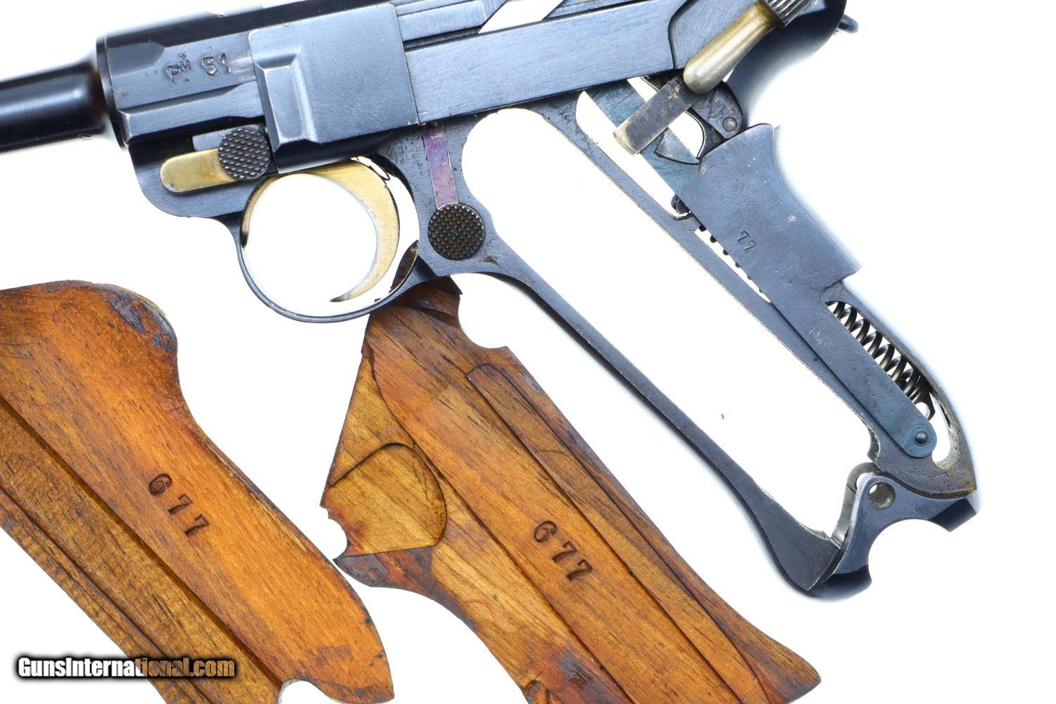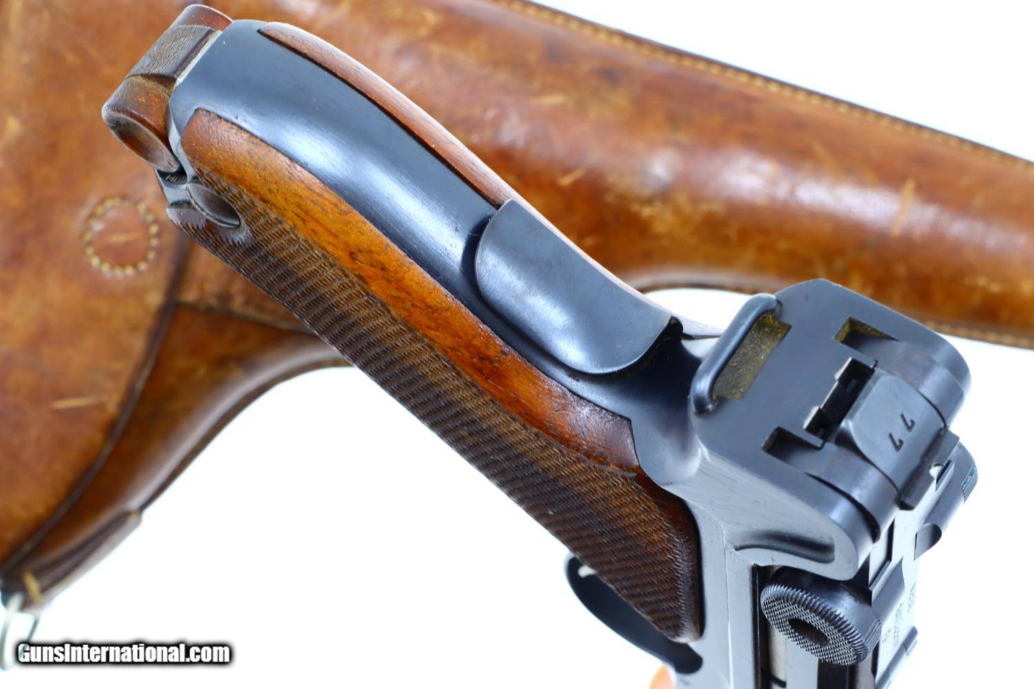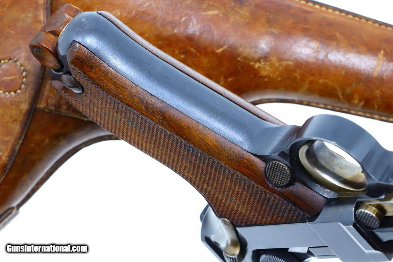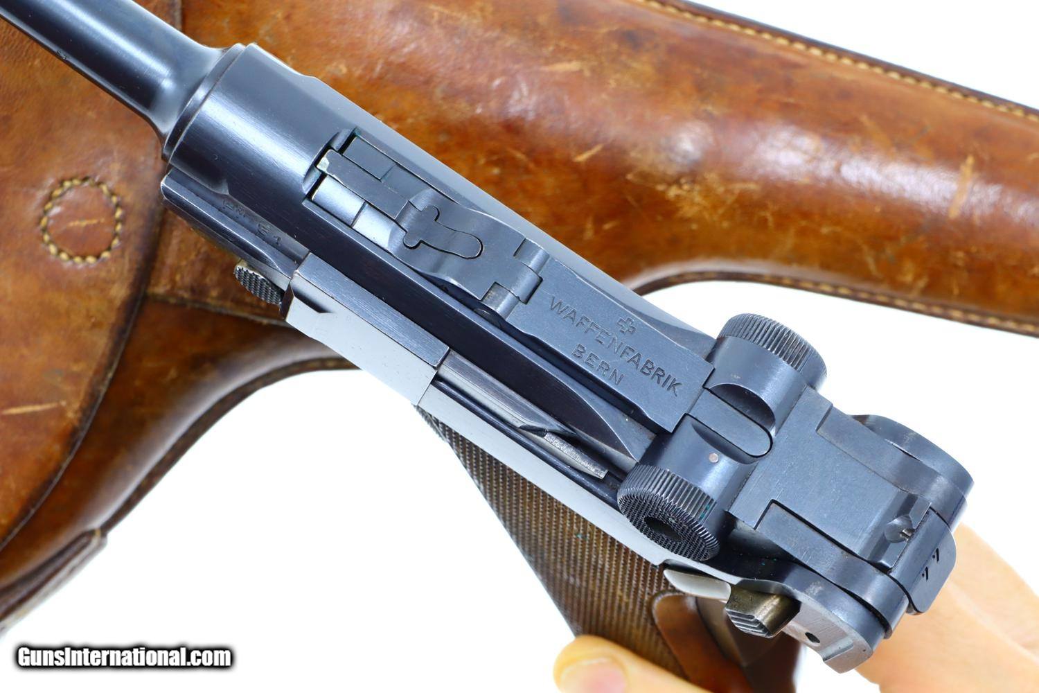 Description: Standard configuration Bern 1924, 7.65mm Luger, with 4.75” barrel having drift adjustable front sight and fixed rear sight. Blank chamber. Middle link with WAFFENFABRIK BERN. “P” release on side of the barrel extension dated 51. Full serial number under barrel and forward frame with the last few digits under the sideplate, trigger, barrel extension, and on all three components of the toggle and grip safety. Matching grips. Scattered Swiss crosses in usual locations. Strawed takedown lever, trigger, magazine release button, ejector and safety lever. Import markings on bottom of frame. Correct magazine with tinned body and unmarked walnut plug. Supple leather holster, from a 1906 pistol, this example dated 1910 with spare magazine pouch on lid. Synopsis: High, original condition Swiss 1924-06 Bern Military Luger with Holster. Condition: Beautiful, bright rust blue, at least 97-98%, only minimal sharp edge wear as one might expect from a pistol that has not seen much service. Comparable condition front and backstraps. Small parts with vivid straw colors. Excellent grips and magazine. Near mirror bore. Perfect manual mechanics. VG holster. A high original condition Swiss 1924 Bern Military Luger, fully matching, with earlier era holster. ~~Insured shipping fee of $65; most packages shipped using FedEx 2nd Day.~~ SOLD Curio/Relic: Yes Manufacturer: Bern Serial Number: 17677 Caliber Info: .30 L |